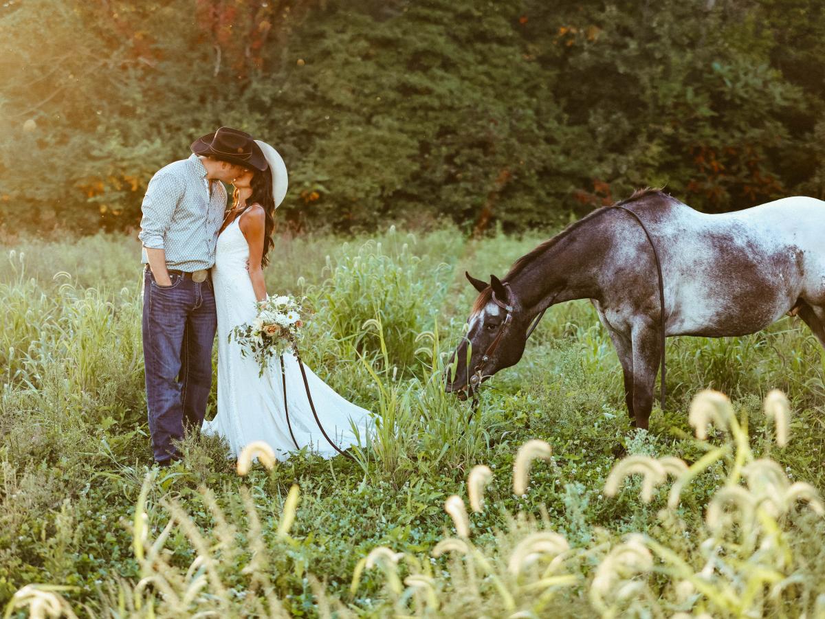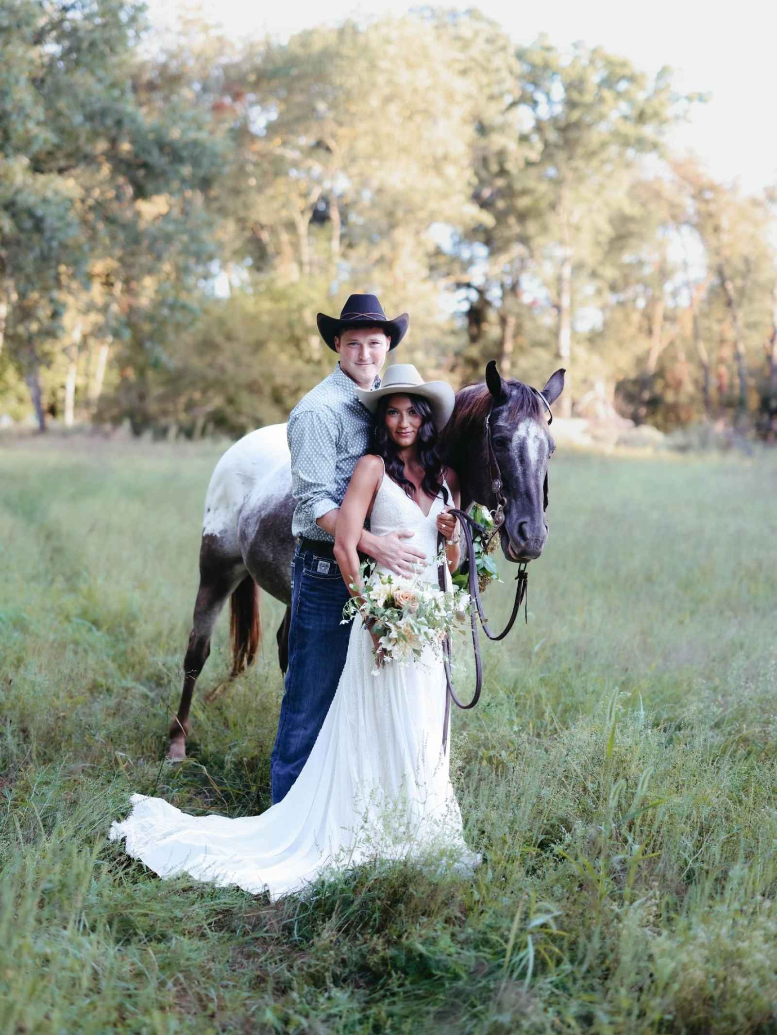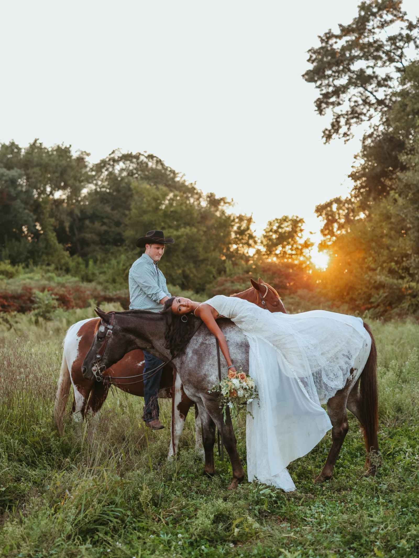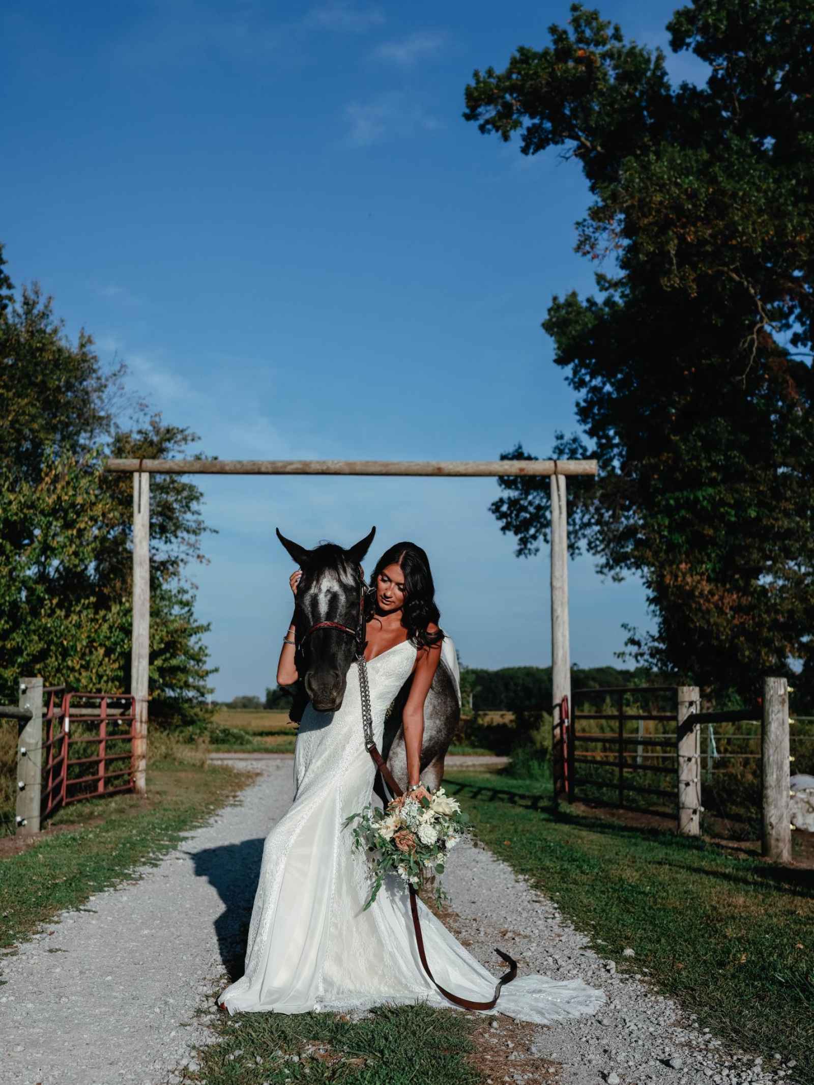 Of course, no ranch shoot comes without its surprises. “Animals have a mind of their own,” Mary Beth laughs. Their sweet horse took a particular interest in the bride’s bouquet, making for a memorable (and slightly chaotic!) moment on set. But those unscripted interactions only added authenticity and charm to the story unfolding in front of the lens.
