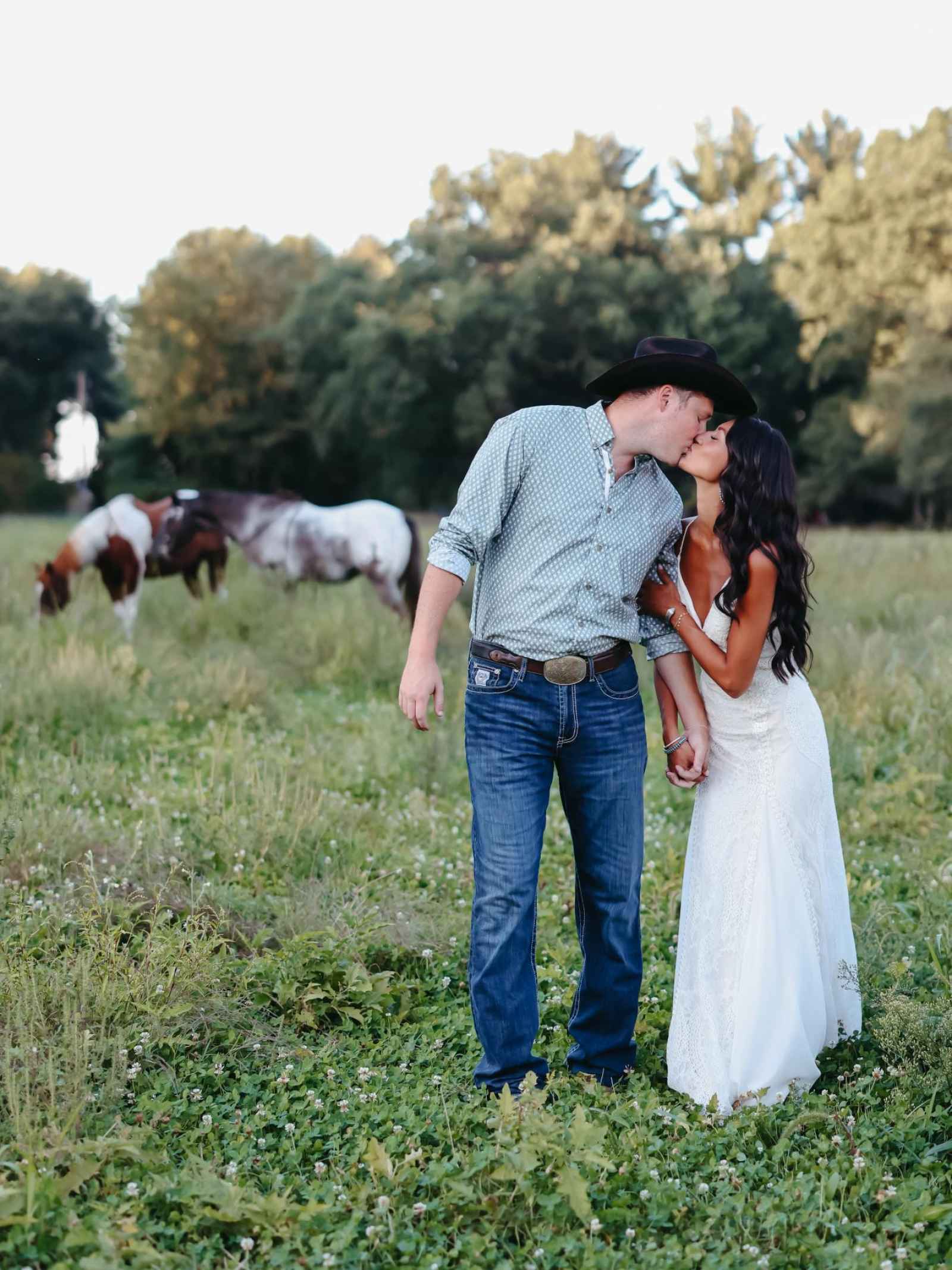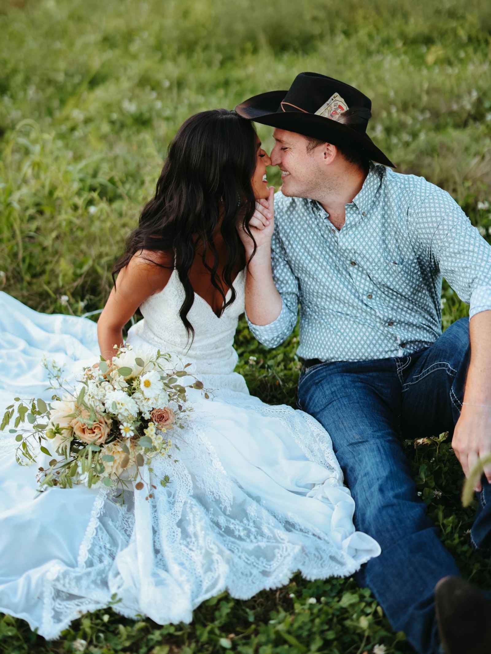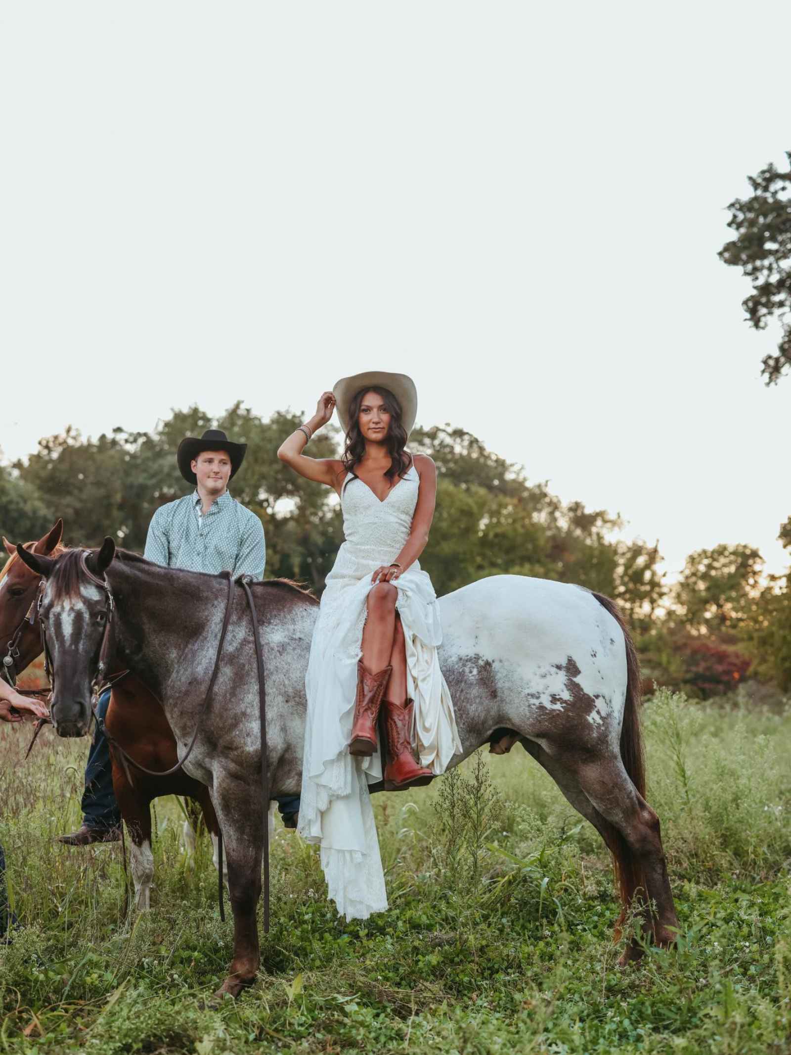 Of course, no ranch shoot comes without its surprises. “Animals have a mind of their own,” Mary Beth laughs. Their sweet horse took a particular interest in the bride’s bouquet, making for a memorable (and slightly chaotic!) moment on set. But those unscripted interactions only added authenticity and charm to the story unfolding in front of the lens.
