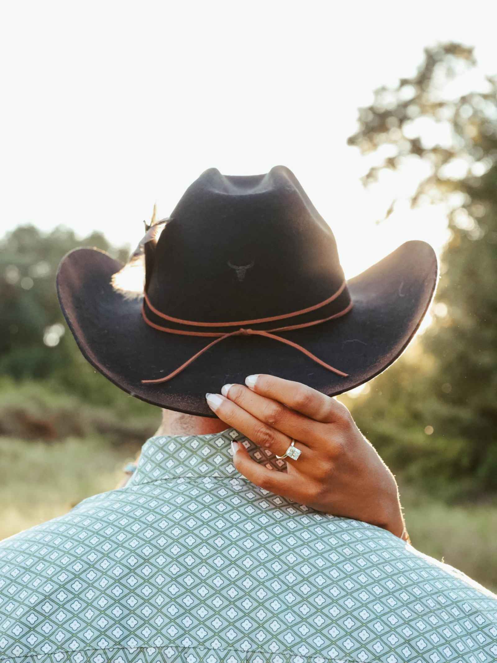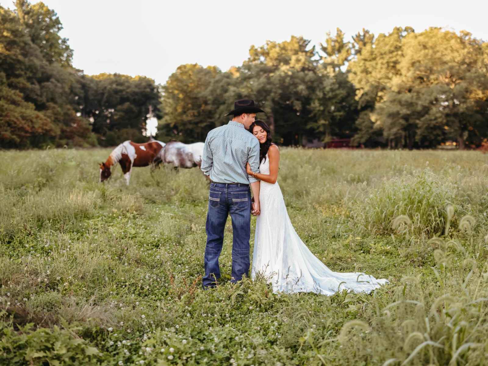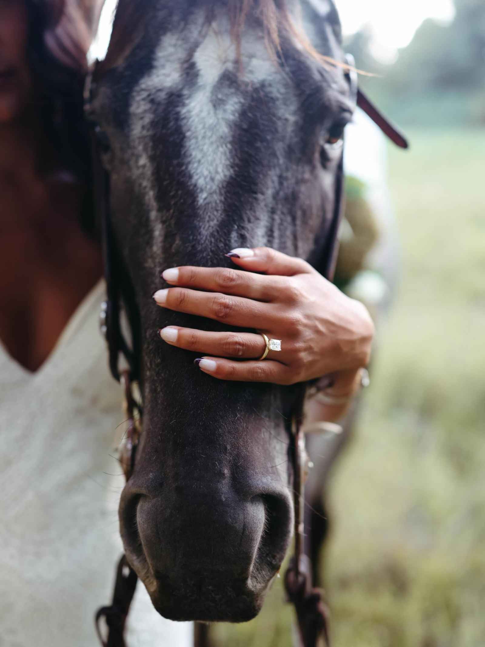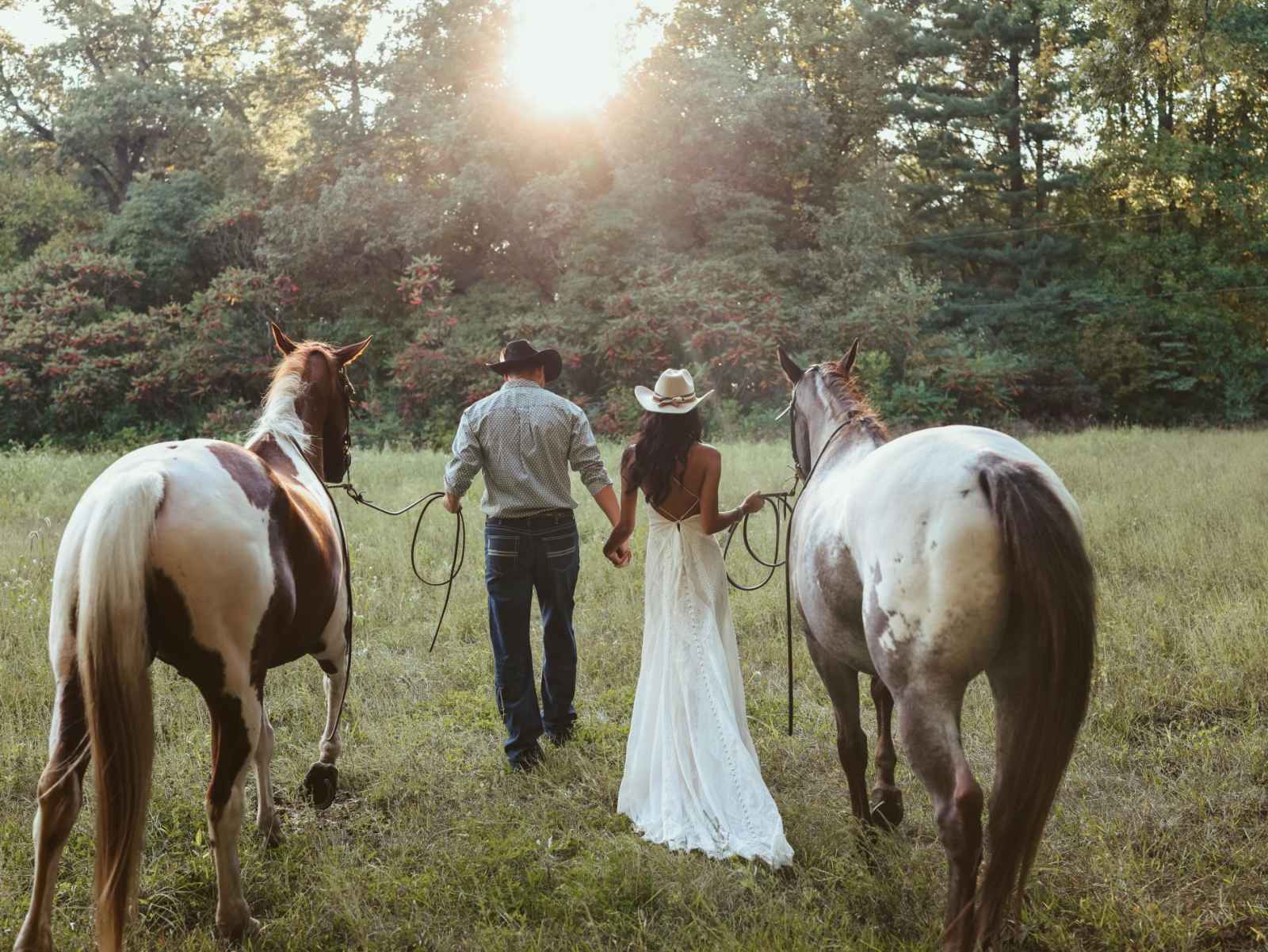 Of course, no ranch shoot comes without its surprises. “Animals have a mind of their own,” Mary Beth laughs. Their sweet horse took a particular interest in the bride’s bouquet, making for a memorable (and slightly chaotic!) moment on set. But those unscripted interactions only added authenticity and charm to the story unfolding in front of the lens.