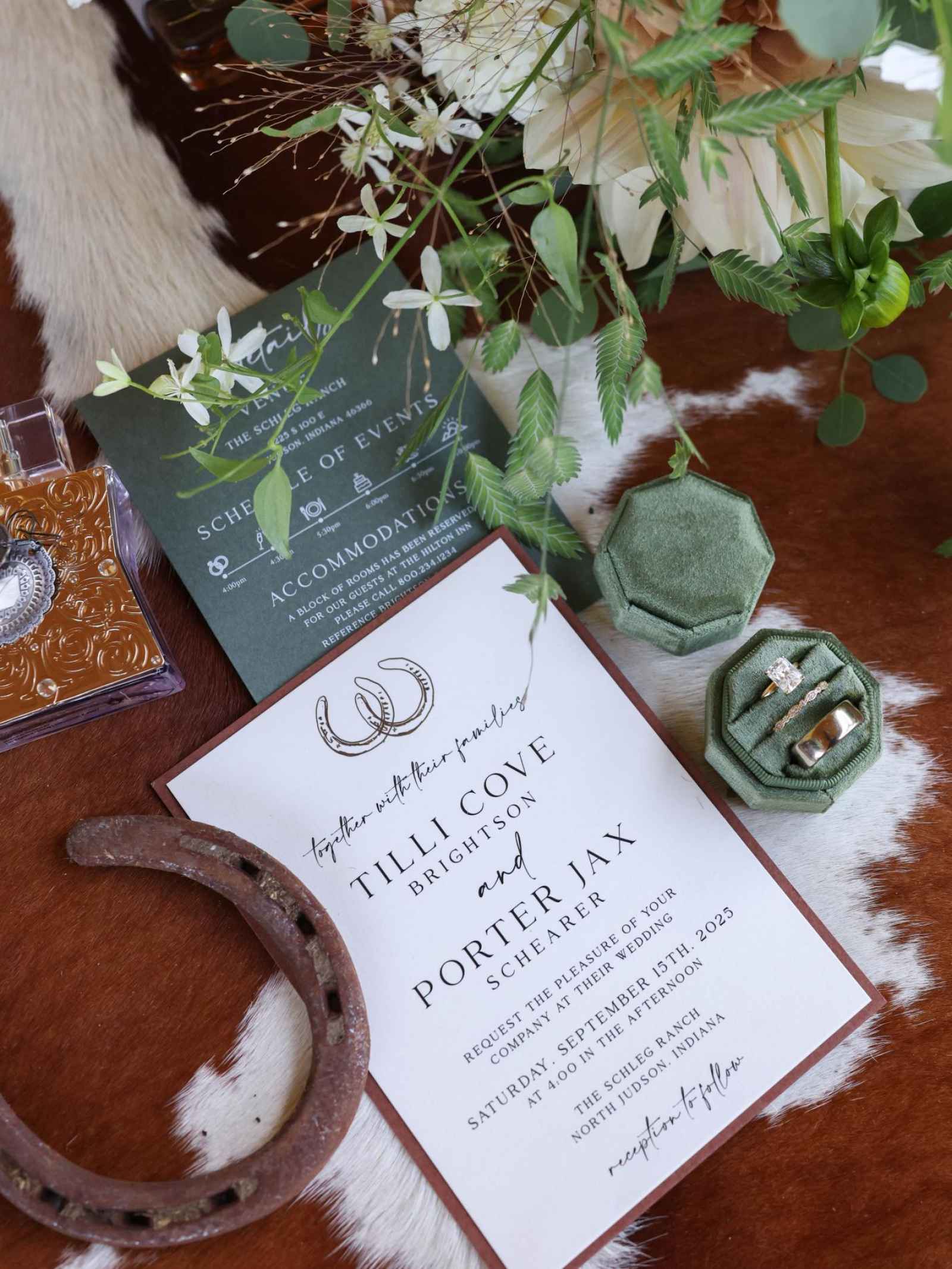 The florals were intentionally selected to feel unique and unexpected. Mocha mousse roses paired with hydrangeas created soft dimension and complemented the warm, neutral palette. Even the stationery reflected the theme: western-inspired, modern and luxurious in warm earthy tones.