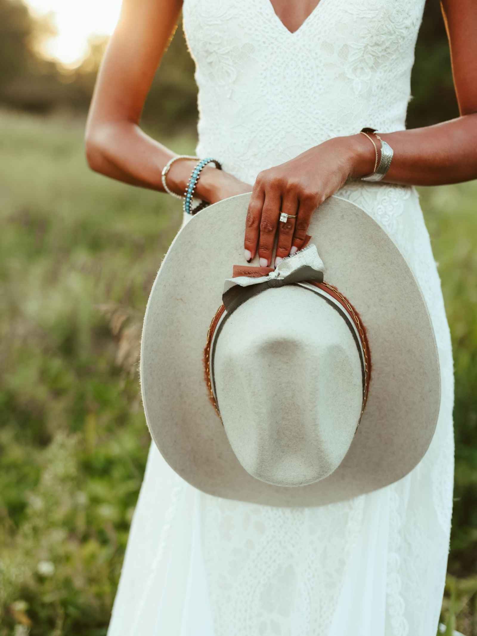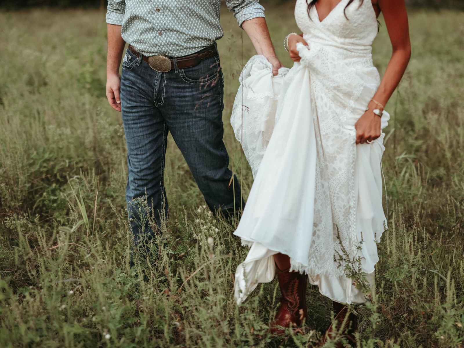 To incorporate current trends, the team embraced motion blur photography, relaxed hairstyles, effortless gowns, denim details and natural makeup. The bride wore soft curls with minimal fuss, allowing her natural beauty to take center stage. Neutral makeup tones enhanced her features while keeping the look low-key and radiant—perfect for a ranch setting!