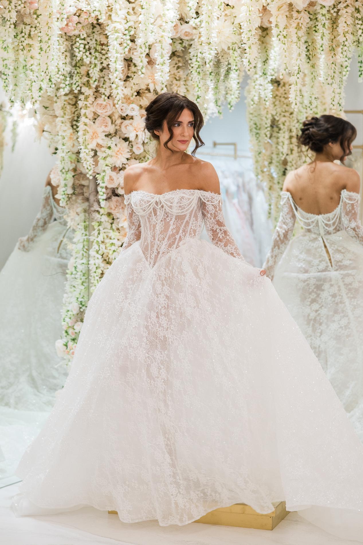 Becker’s Bridal presents this striking Berta gown that blends high-fashion detail with timeless structure. Featuring a sculpted basque waistline with allover lace, this look feels both bold and undeniably romantic!