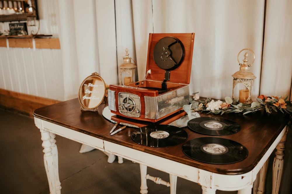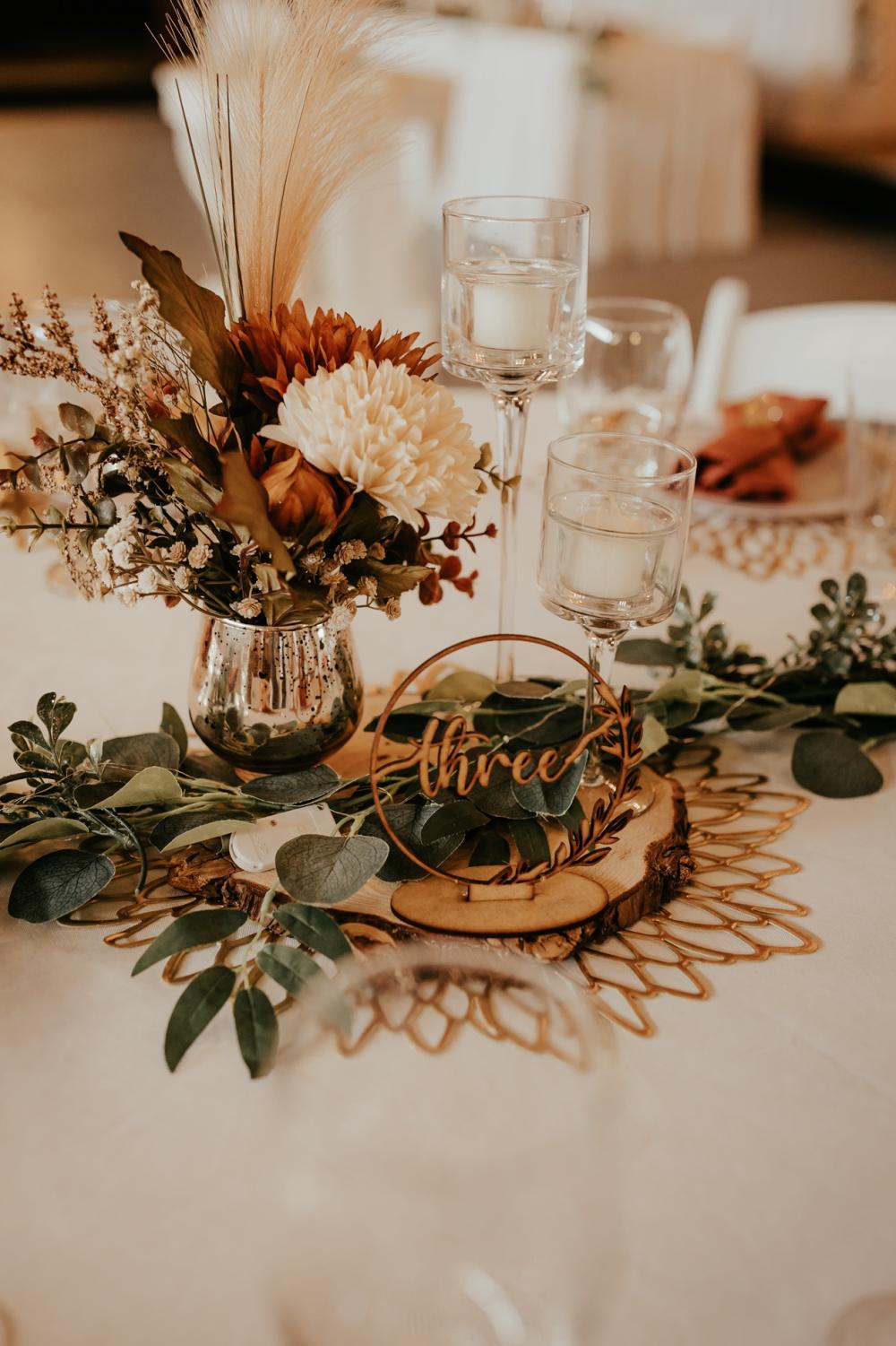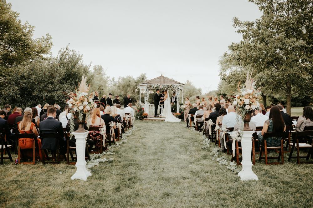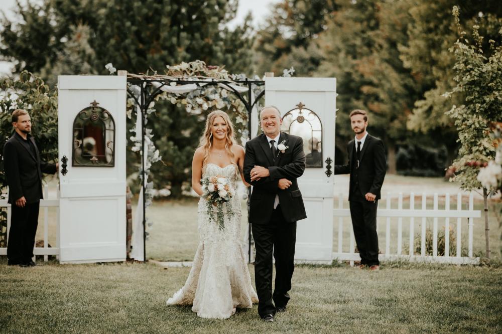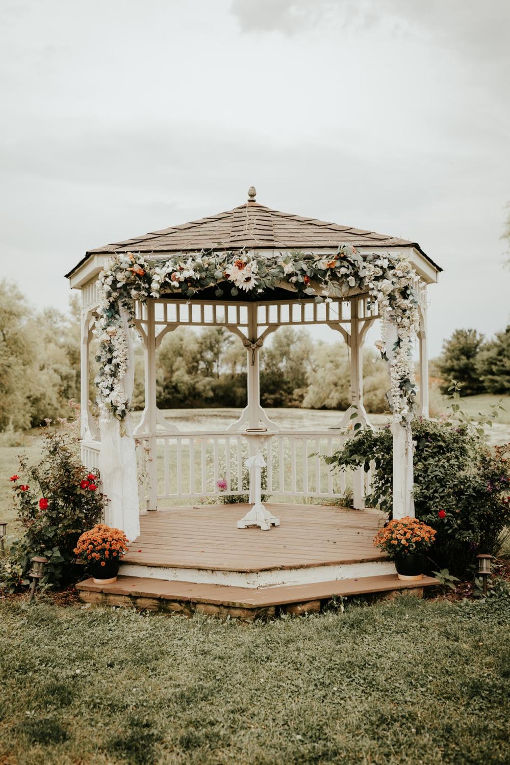 Since they were going to get married in the fall, Maddie and Ben wanted to create a rustic and fall-inspired ceremony. We love the way this wedding came together! The unique door entrance and gazebo in the ceremony space are so cute and charming and there are so many natural elements that make the reception even more rustic. The florals help fill the space and add more texture to the beautiful space. They also mixed in some vintage vibes with the antique goblets, distressed mirror and a vinyl guestbook!