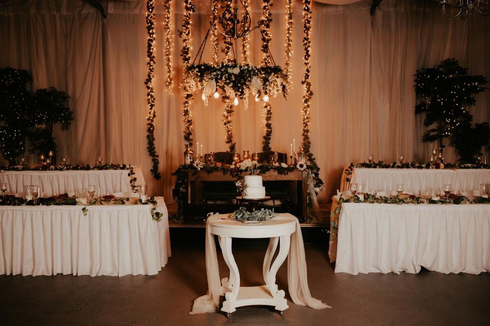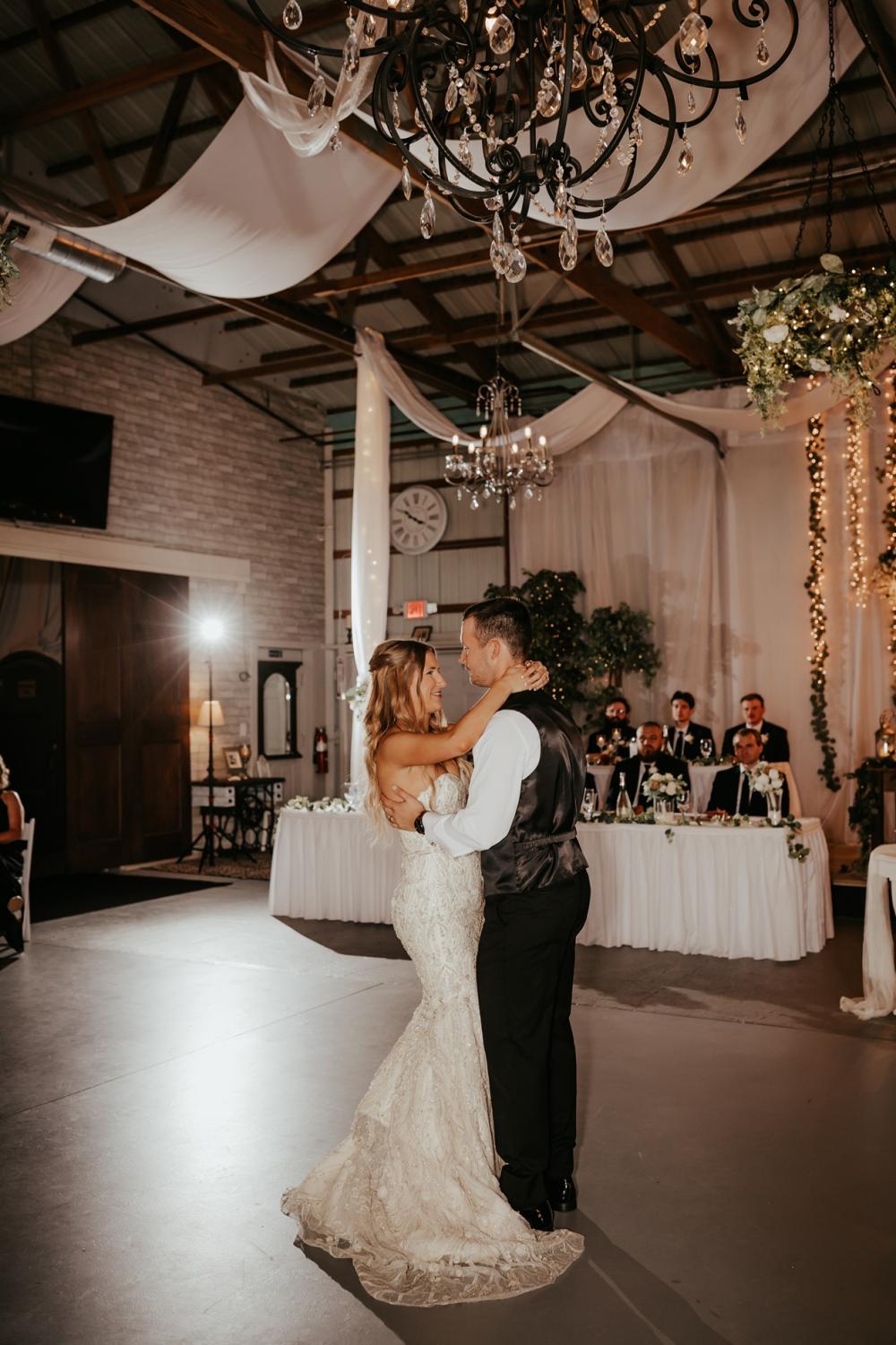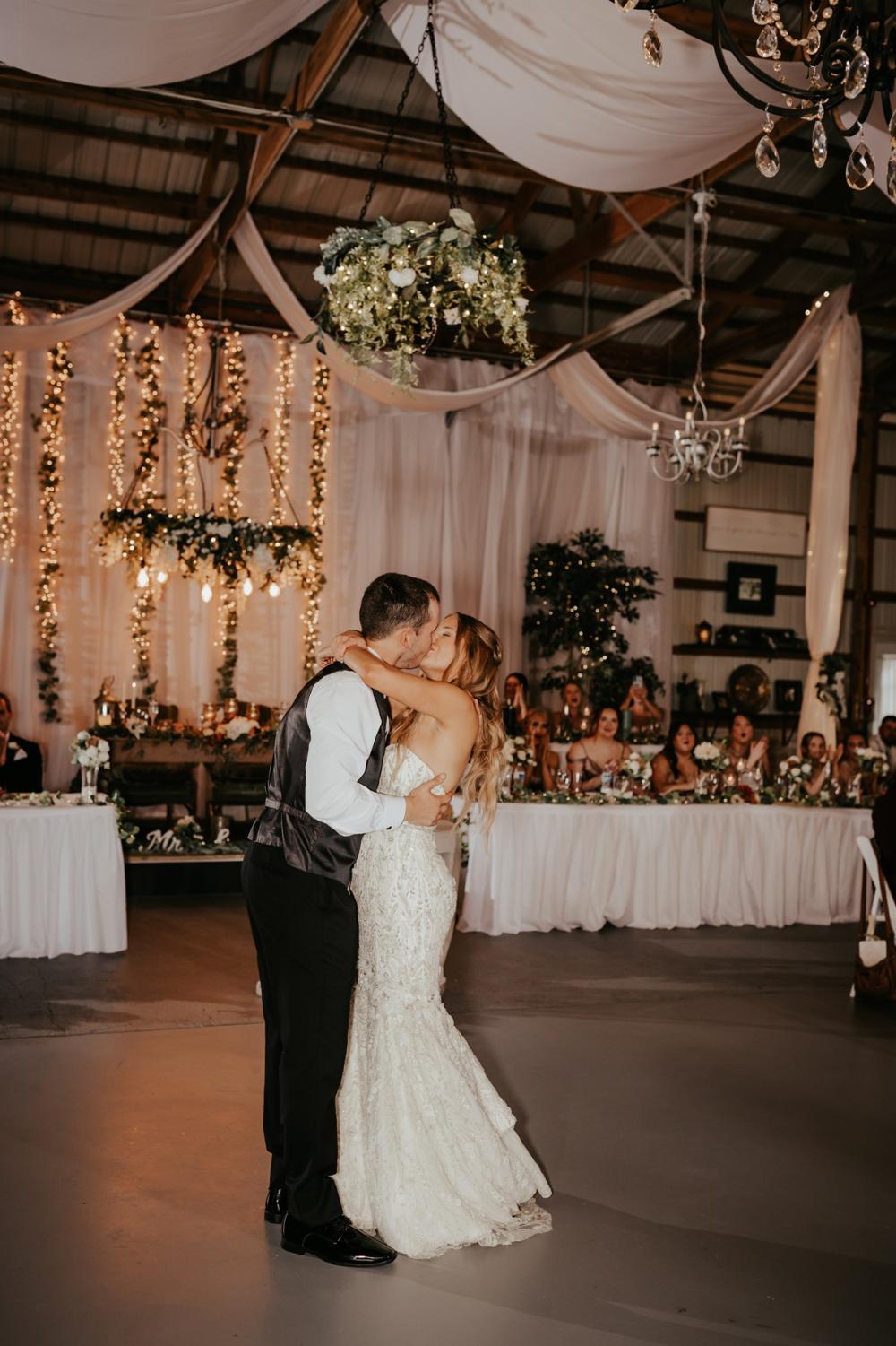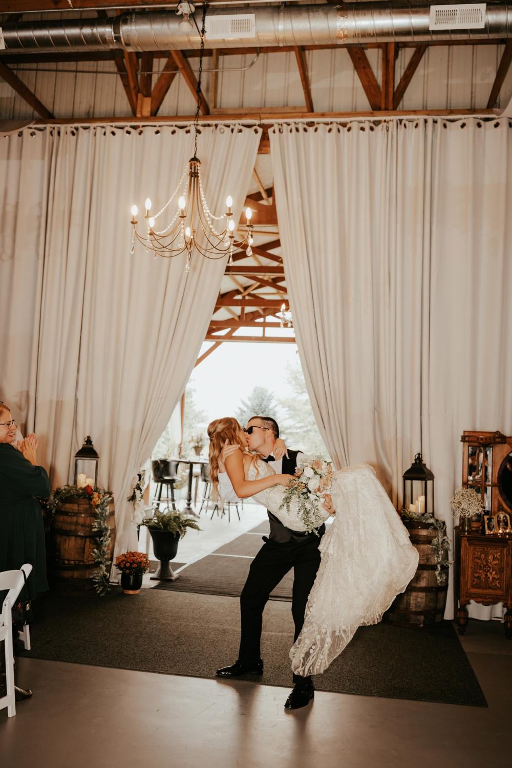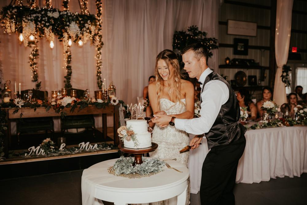 Since they were going to get married in the fall, Maddie and Ben wanted to create a rustic and fall-inspired ceremony. We love the way this wedding came together! The unique door entrance and gazebo in the ceremony space are so cute and charming and there are so many natural elements that make the reception even more rustic. The florals help fill the space and add more texture to the beautiful space. They also mixed in some vintage vibes with the antique goblets, distressed mirror and a vinyl guestbook!