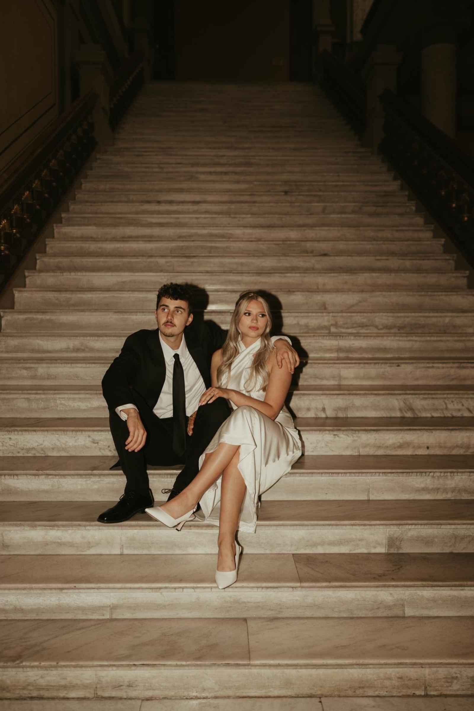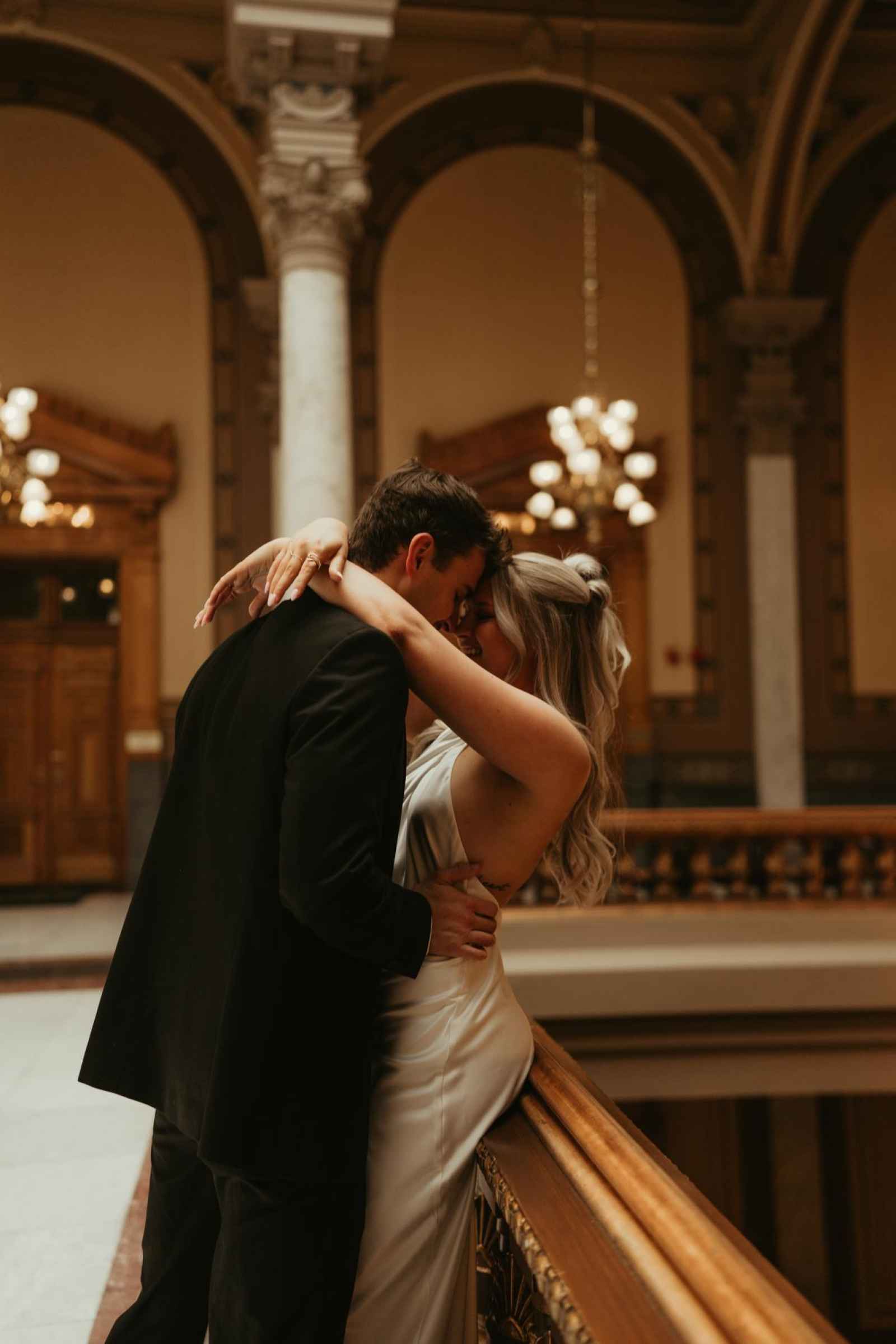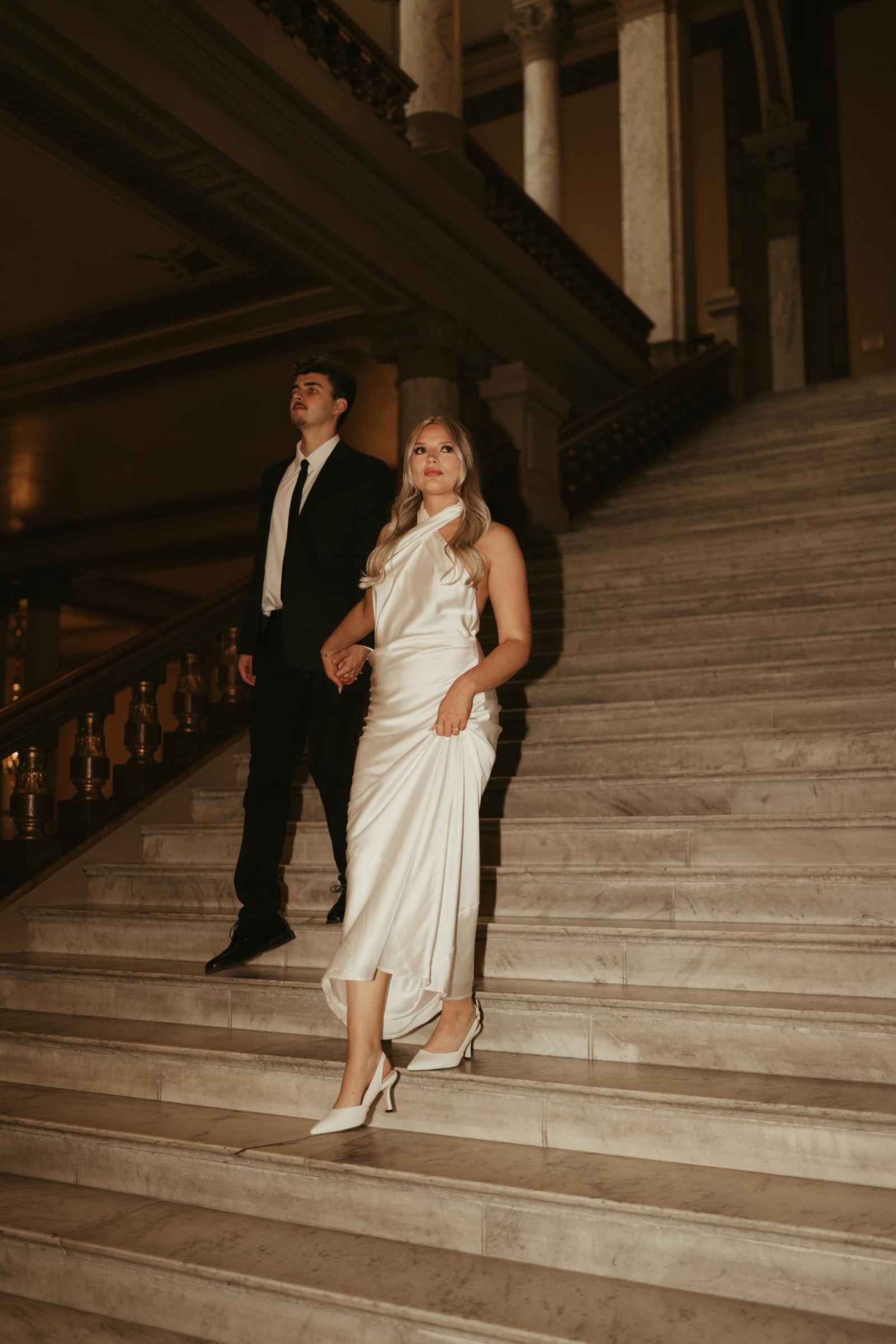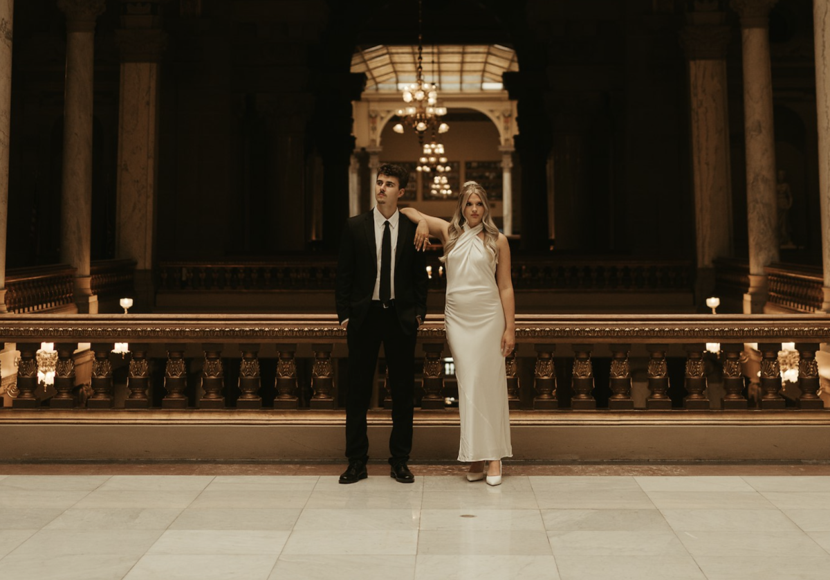 Emma and Spencer opted to shoot at two locations to reflect the different sides of their relationship. Indiana State House offered a stately, elegant backdrop—ideal for the “classy and elevated” photos they envisioned, while Plat 99 brought in a dose of personality with its creative, modern vibe, setting the stage for fun, playful images that showcase who they truly are as a couple!