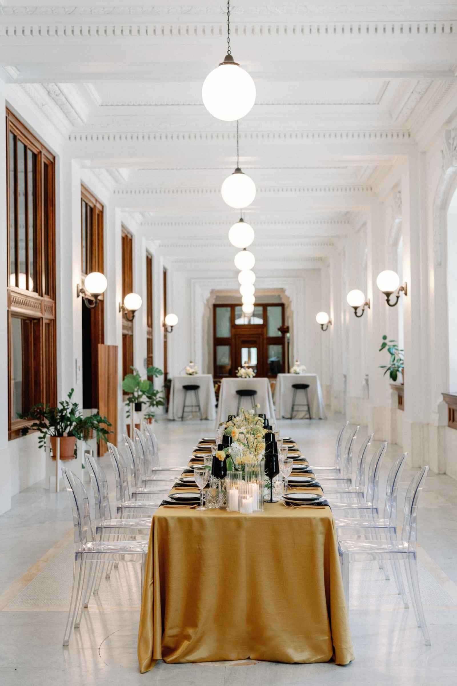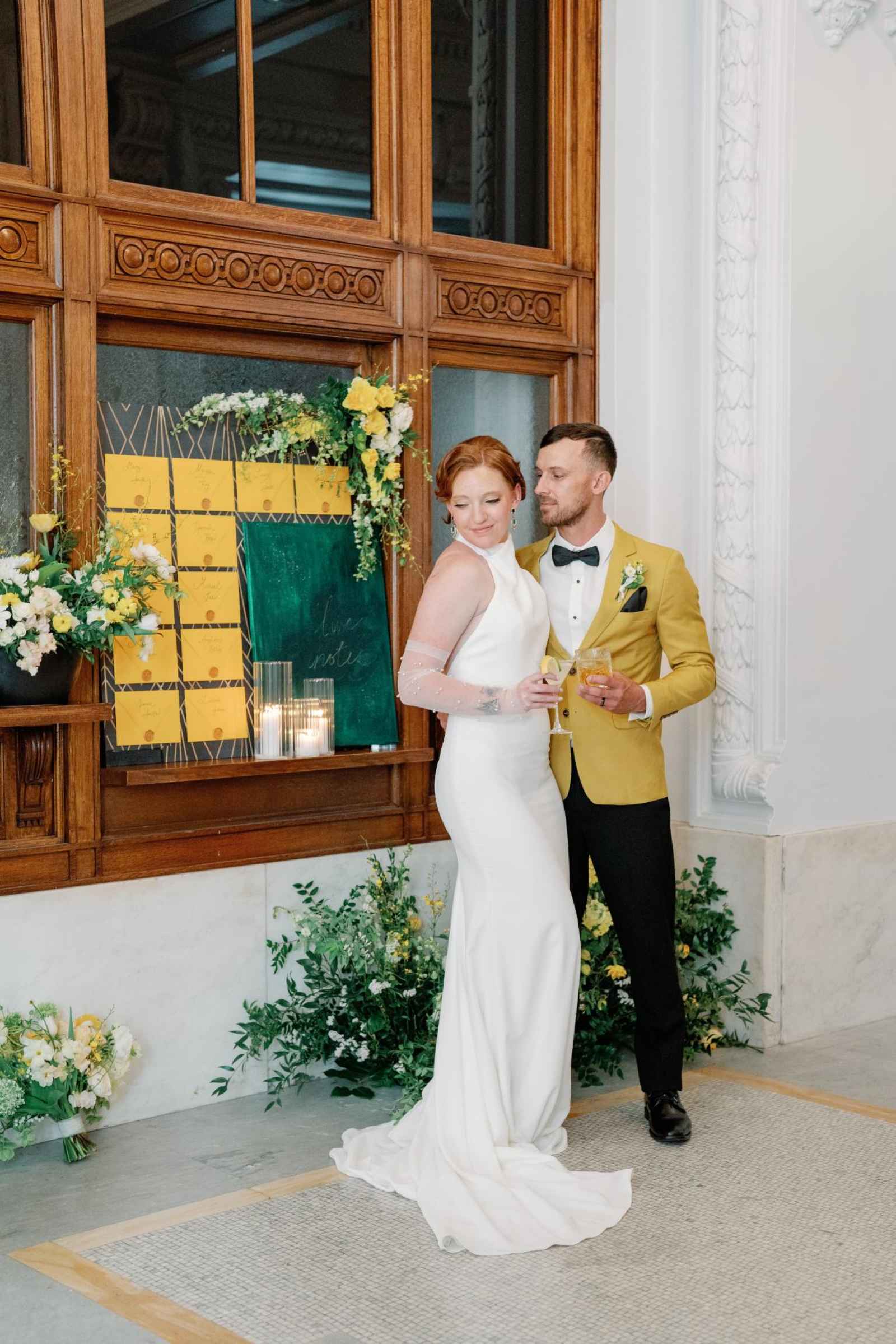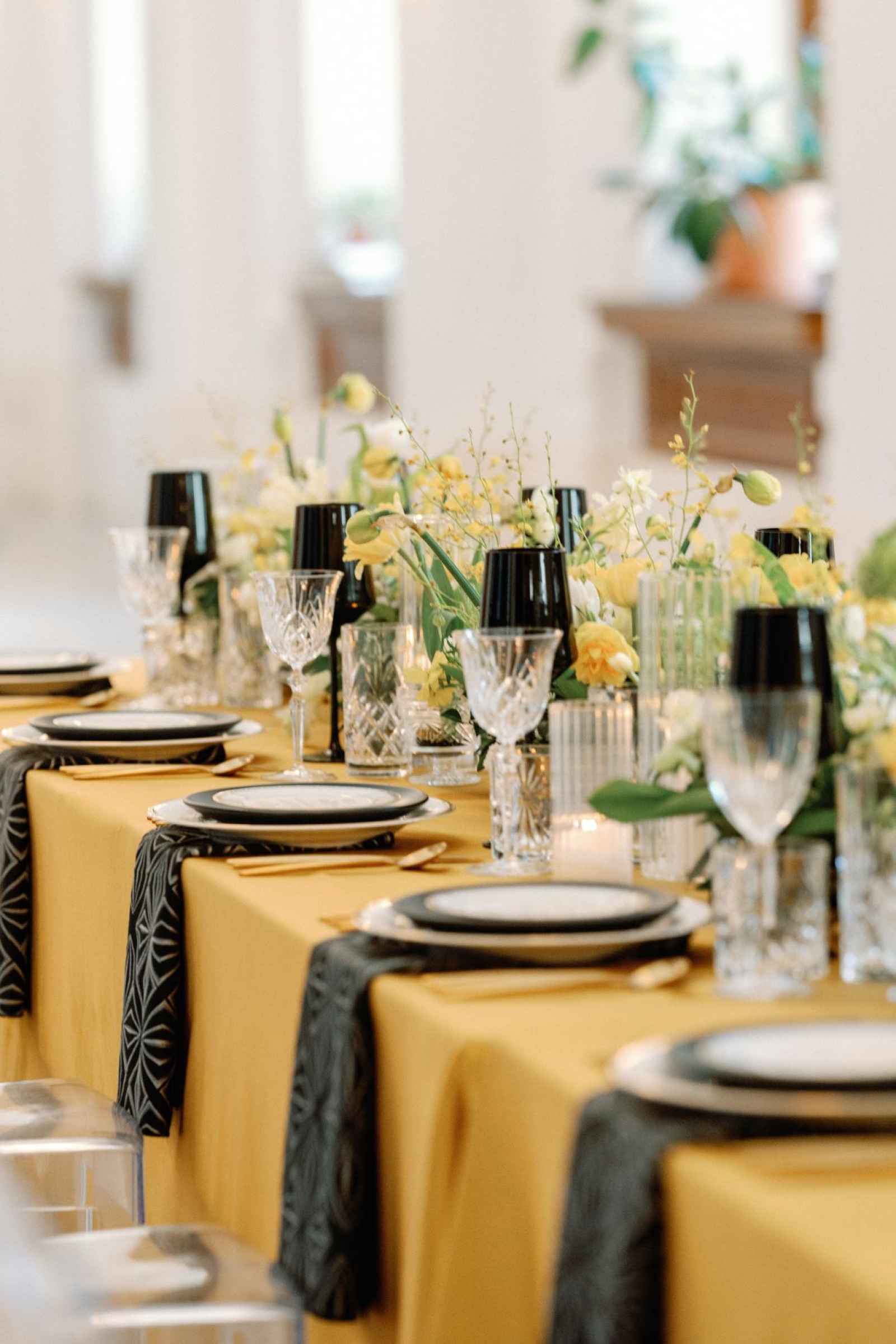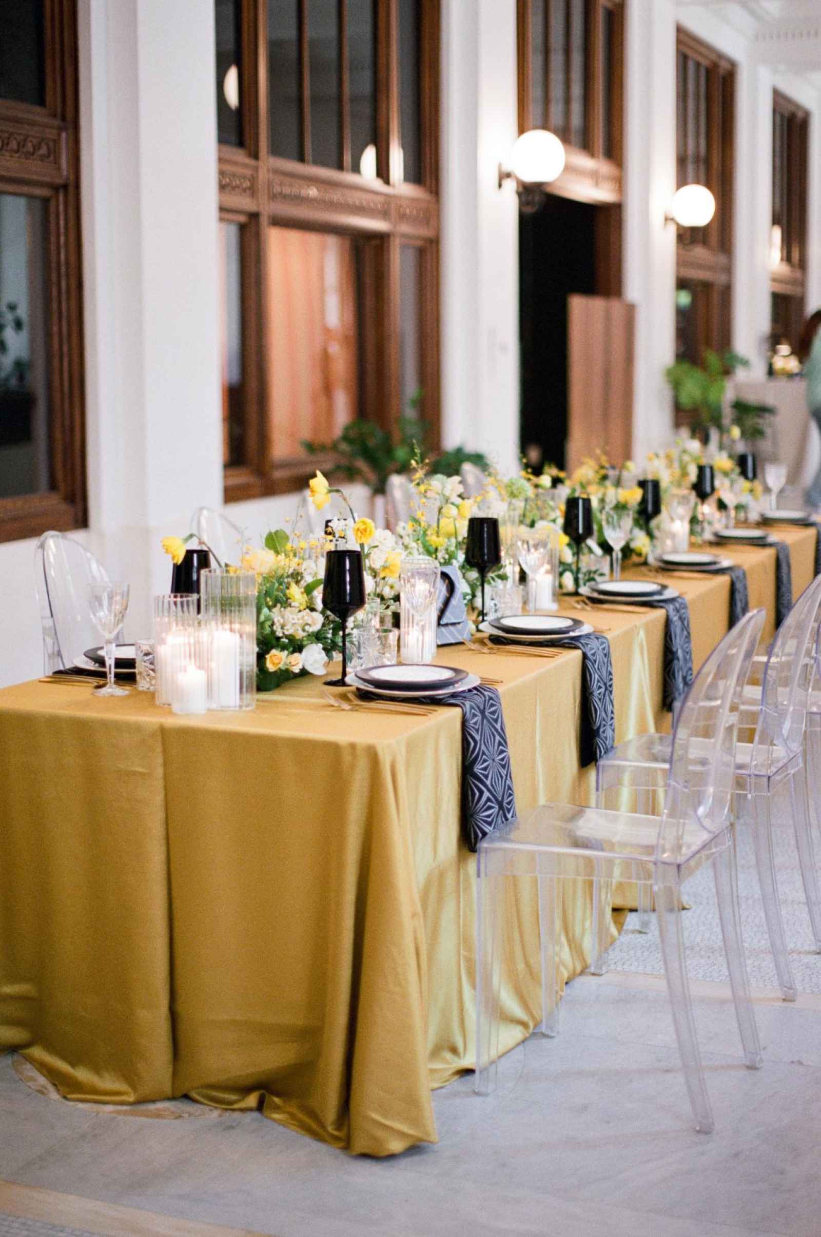 The design team behind this style shoot wanted to step into another era with a springtime twist, and they pulled it off beautifully! To achieve the Art Deco style, they focused a lot on geometric lines and glamorous details. We are absolutely obsessed with this color scheme for a spring wedding, too! The emerald green and yellow fit together so beautifully, reminding us of rebirth and new life after a long winter. For the décor, the team incorporated plenty of elegant items like glassware, golden flatware, satin and velvet. And the venue was a perfect fit for this design, with its marble accents, architectural details and metalwork!
