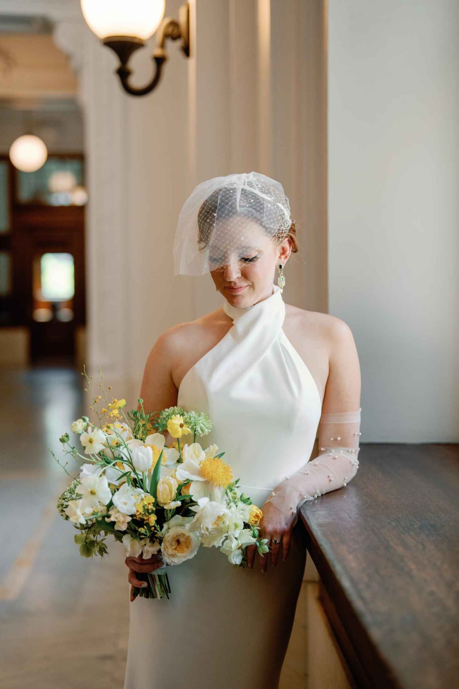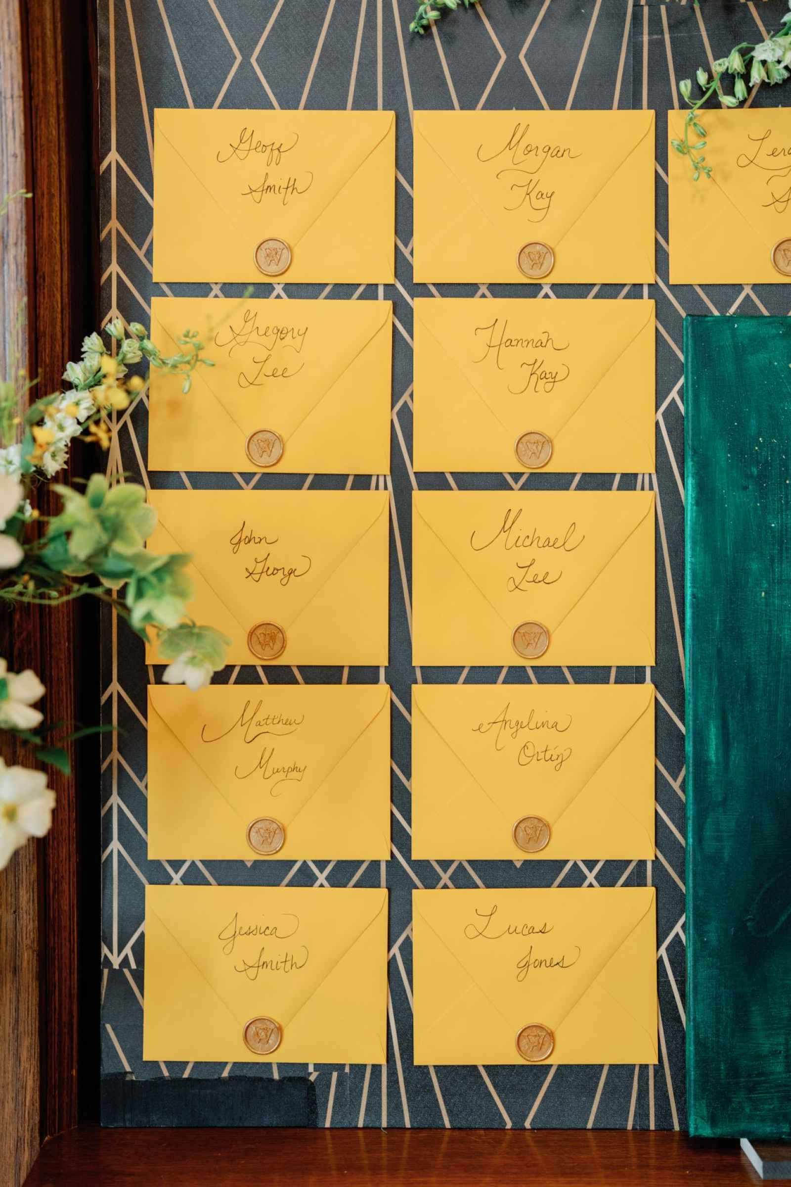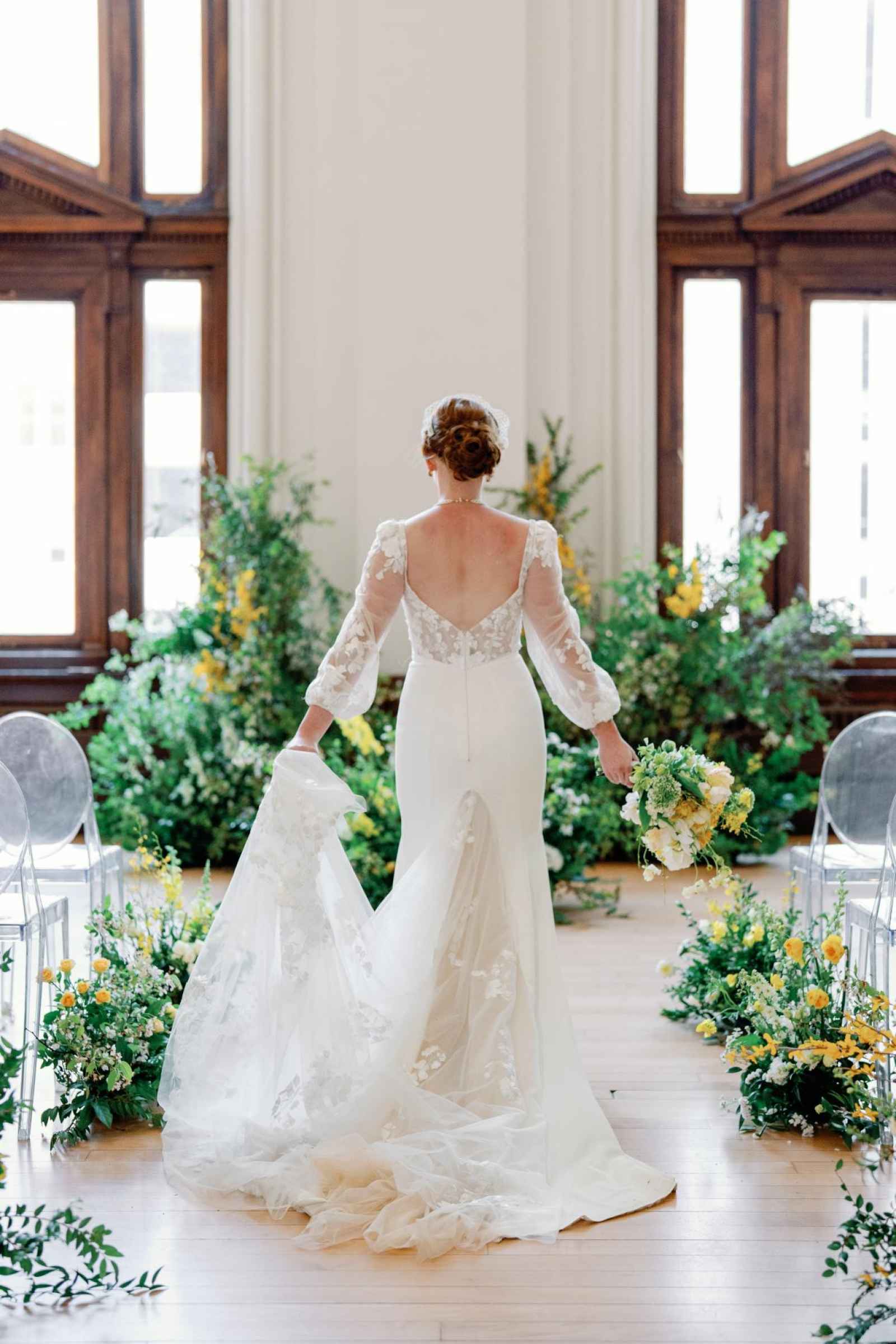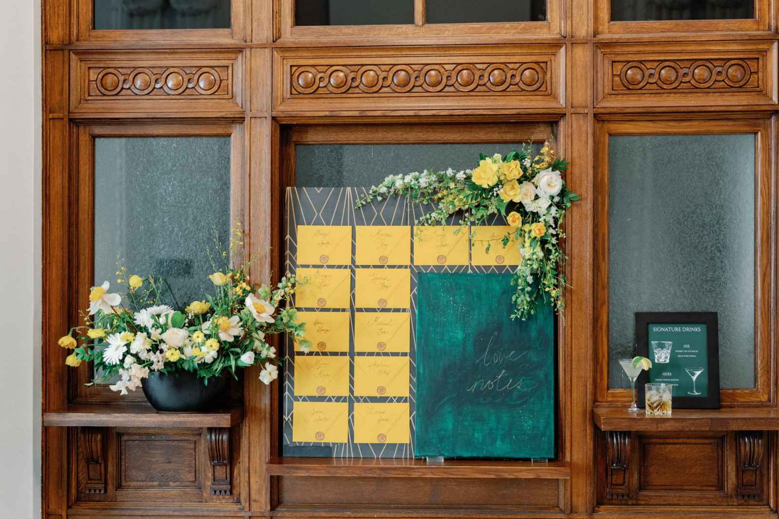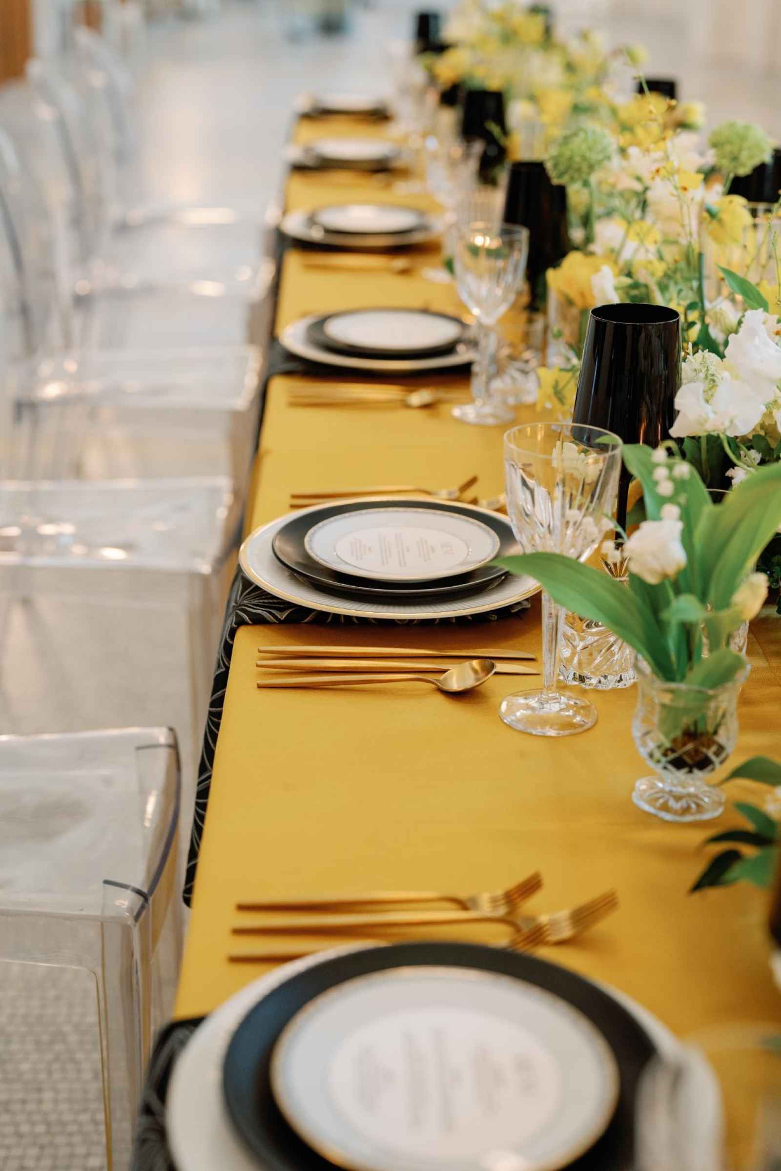 The design team behind this style shoot wanted to step into another era with a springtime twist, and they pulled it off beautifully! To achieve the Art Deco style, they focused a lot on geometric lines and glamorous details. We are absolutely obsessed with this color scheme for a spring wedding, too! The emerald green and yellow fit together so beautifully, reminding us of rebirth and new life after a long winter. For the décor, the team incorporated plenty of elegant items like glassware, golden flatware, satin and velvet. And the venue was a perfect fit for this design, with its marble accents, architectural details and metalwork!