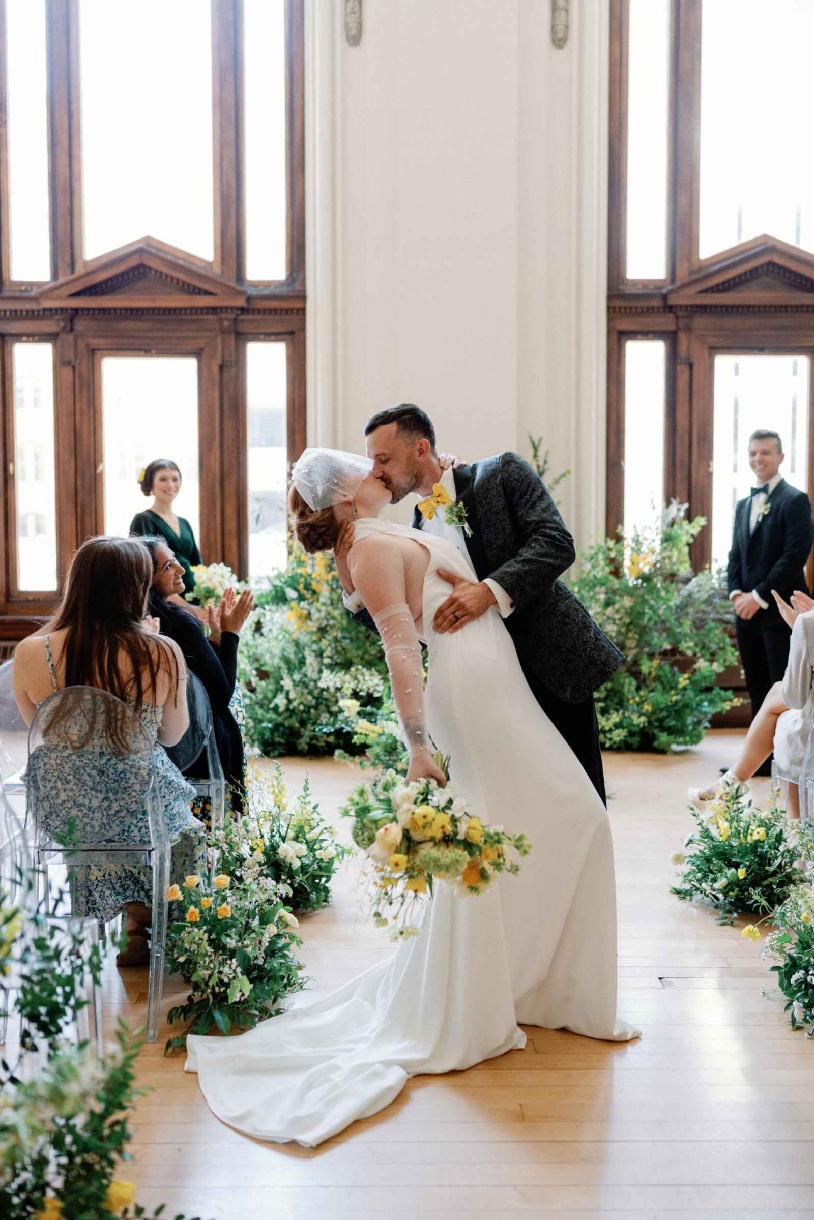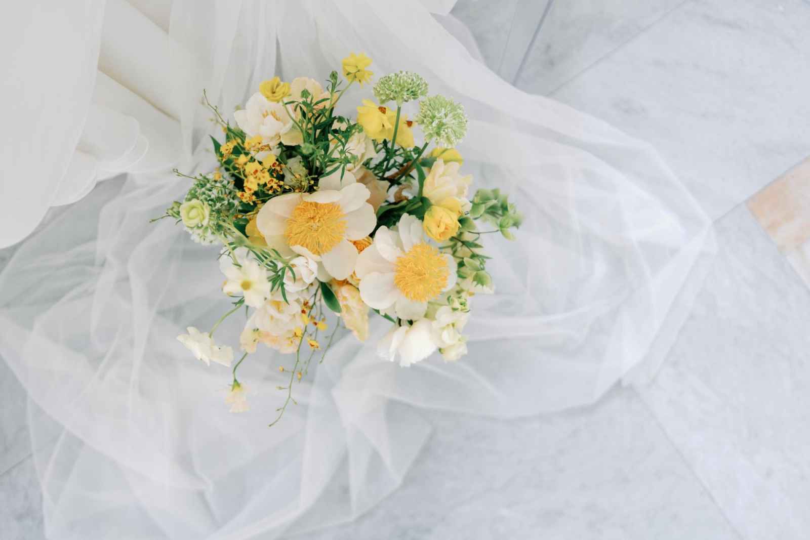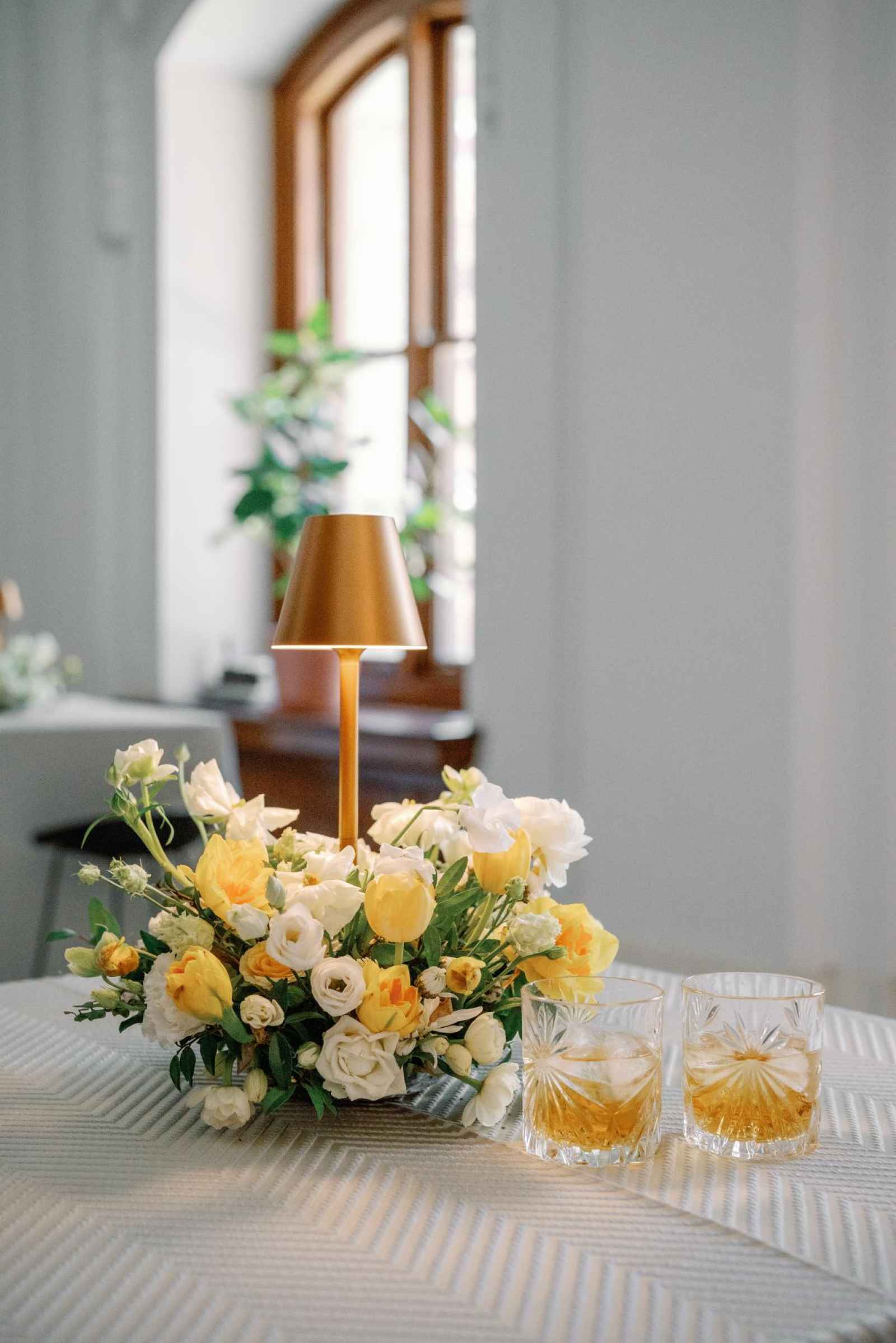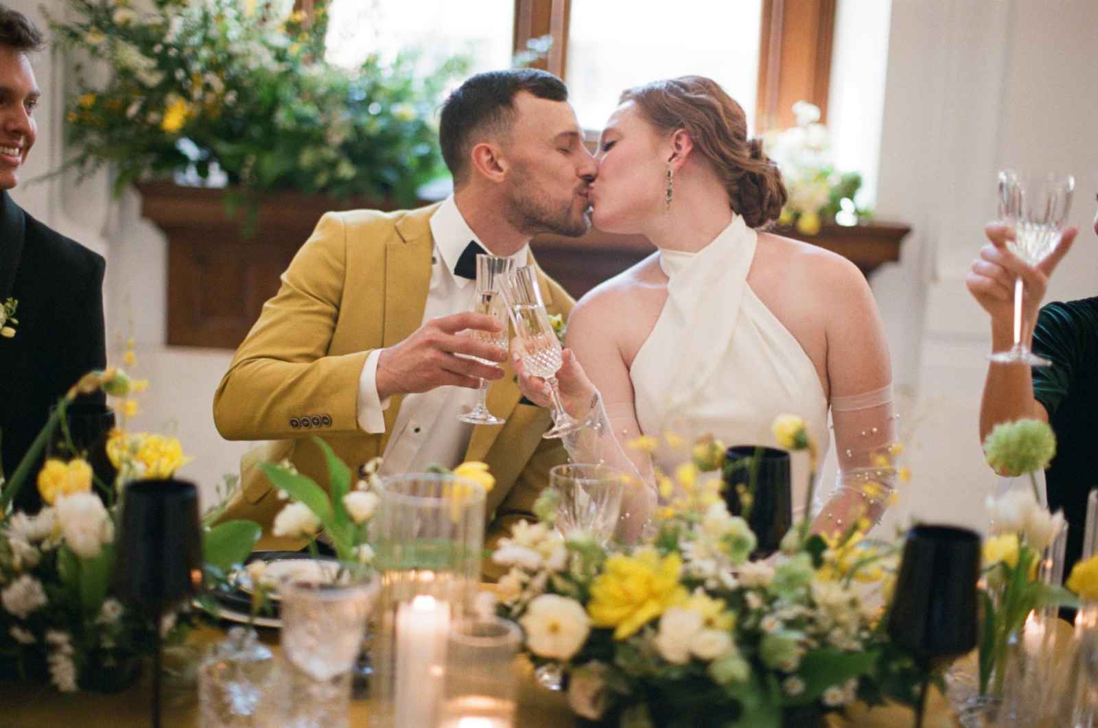 The design team behind this style shoot wanted to step into another era with a springtime twist, and they pulled it off beautifully! To achieve the Art Deco style, they focused a lot on geometric lines and glamorous details. We are absolutely obsessed with this color scheme for a spring wedding, too! The emerald green and yellow fit together so beautifully, reminding us of rebirth and new life after a long winter. For the décor, the team incorporated plenty of elegant items like glassware, golden flatware, satin and velvet. And the venue was a perfect fit for this design, with its marble accents, architectural details and metalwork!
