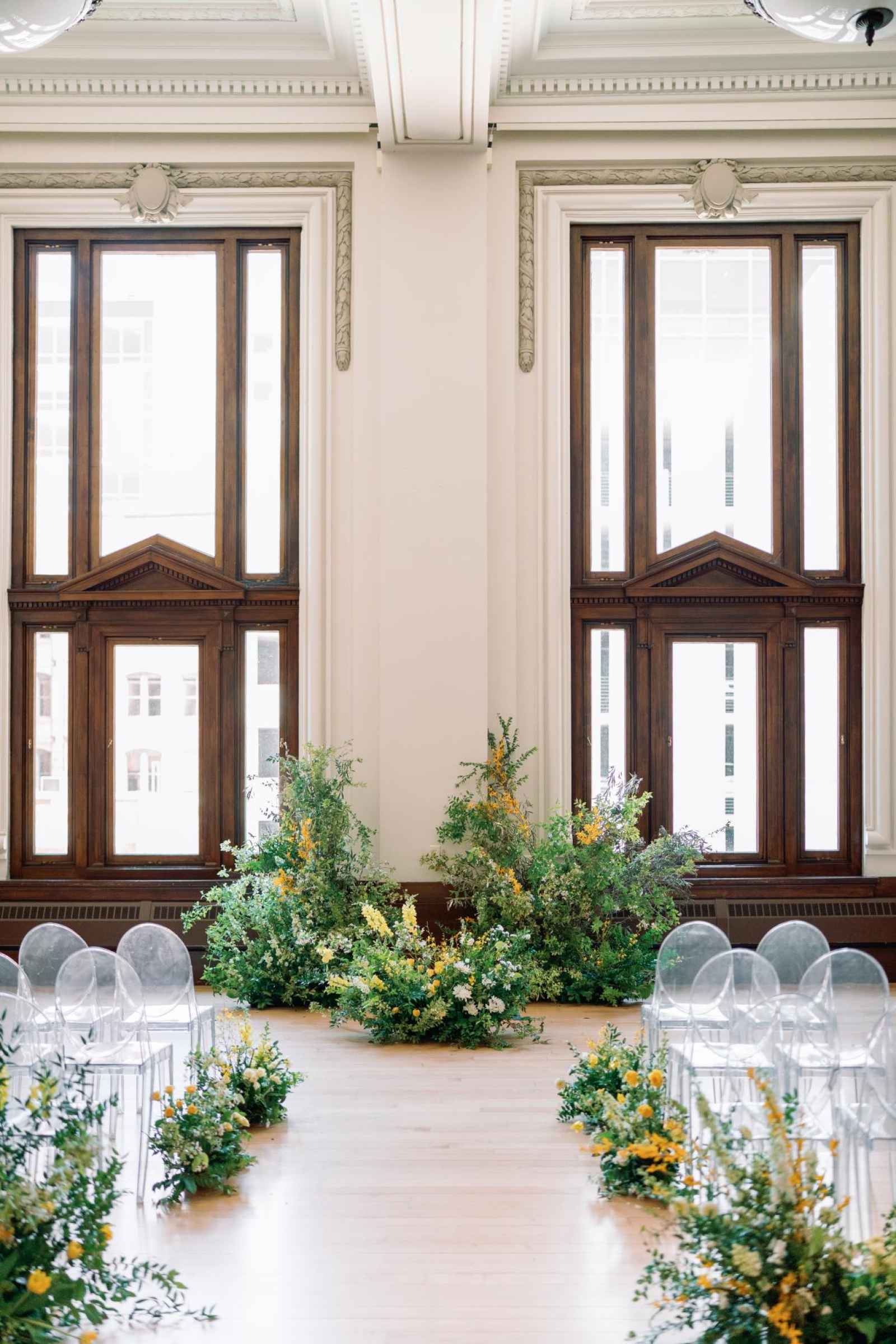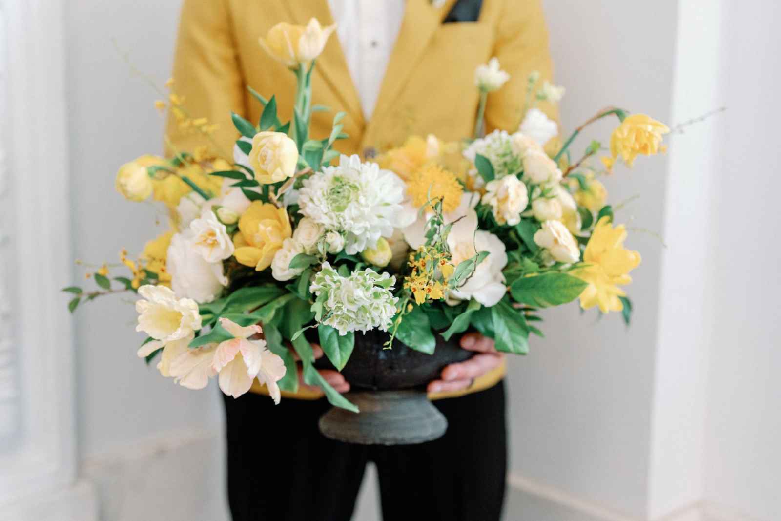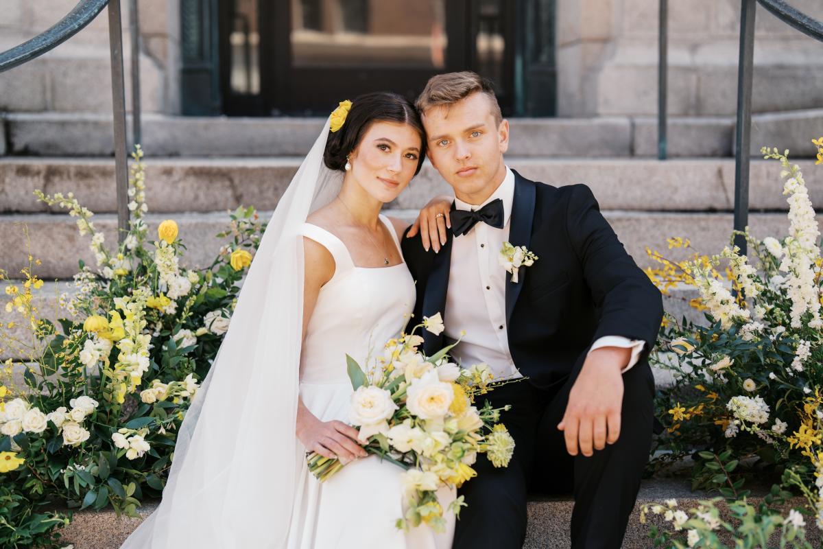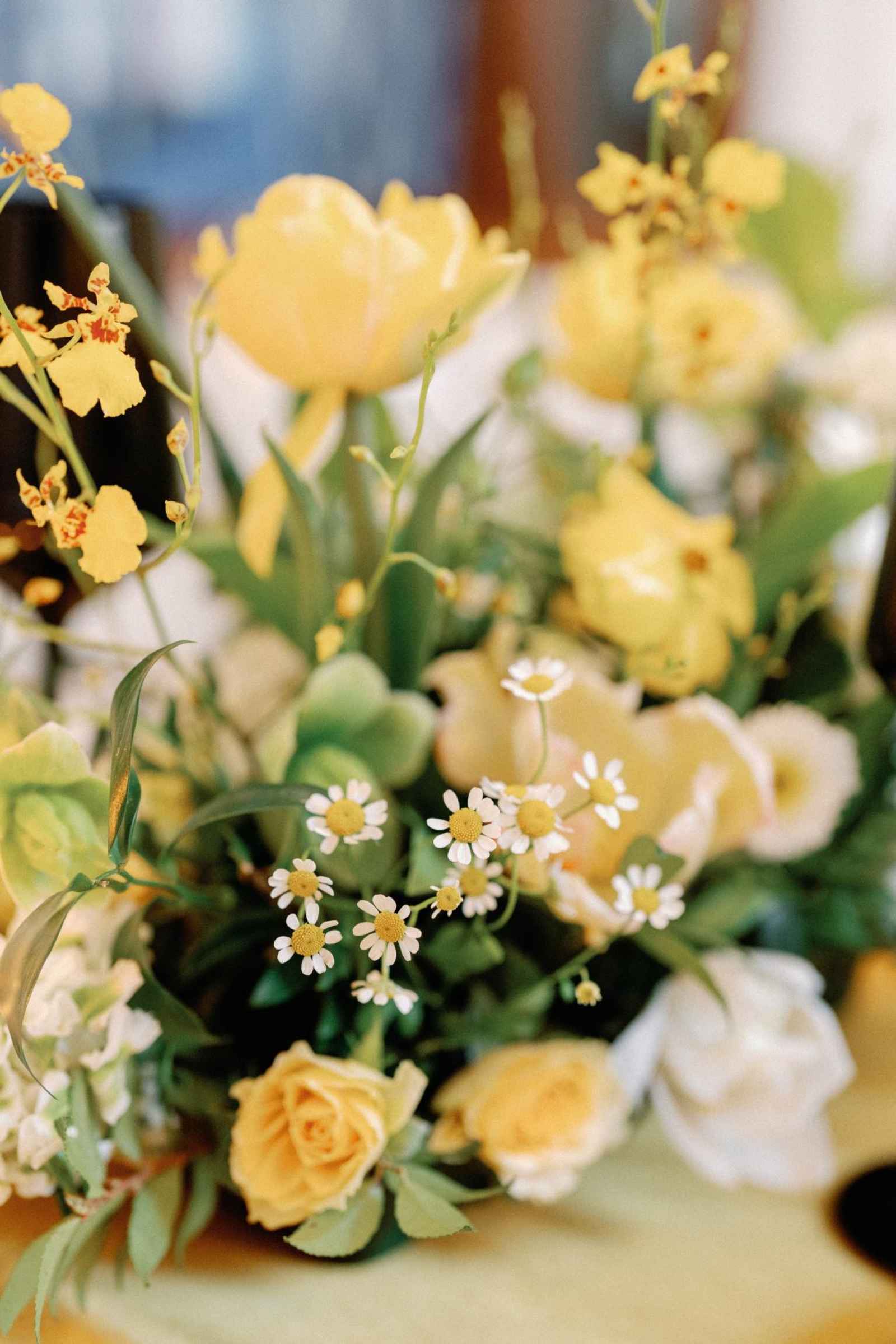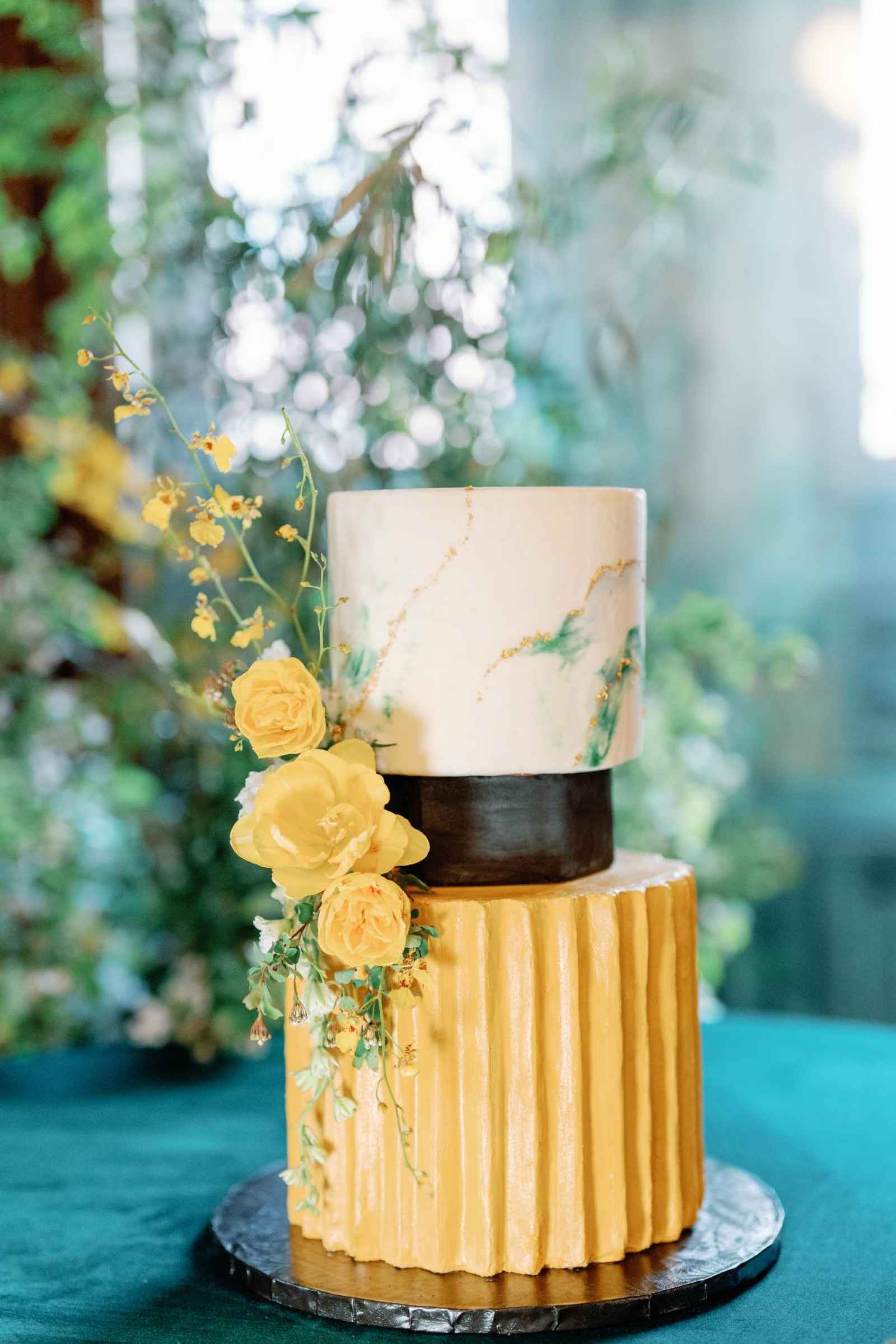 The design team behind this style shoot wanted to step into another era with a springtime twist, and they pulled it off beautifully! To achieve the Art Deco style, they focused a lot on geometric lines and glamorous details. We are absolutely obsessed with this color scheme for a spring wedding, too! The emerald green and yellow fit together so beautifully, reminding us of rebirth and new life after a long winter. For the décor, the team incorporated plenty of elegant items like glassware, golden flatware, satin and velvet. And the venue was a perfect fit for this design, with its marble accents, architectural details and metalwork!