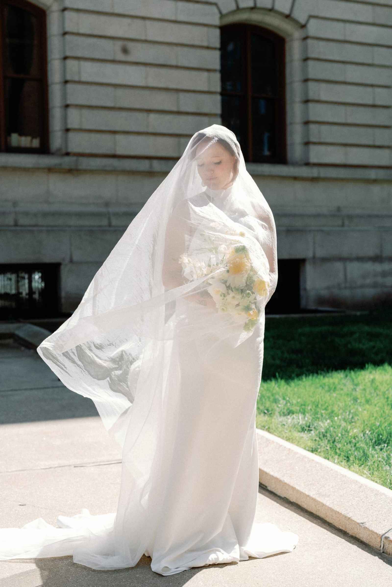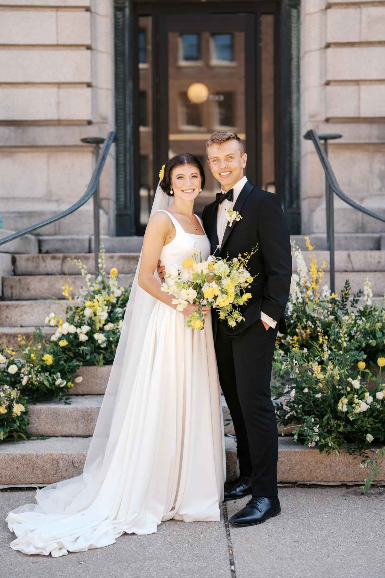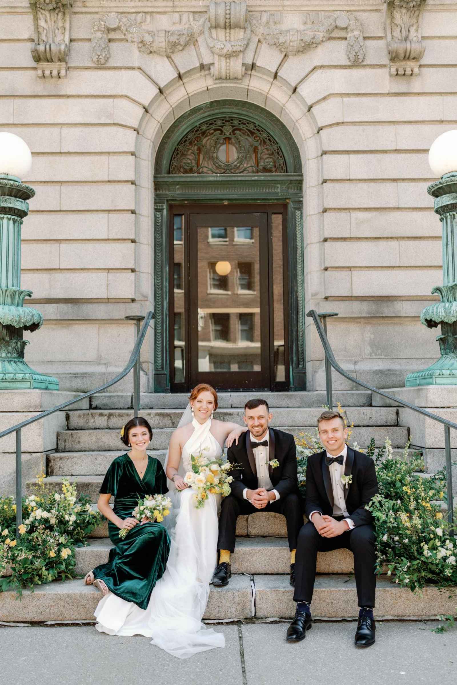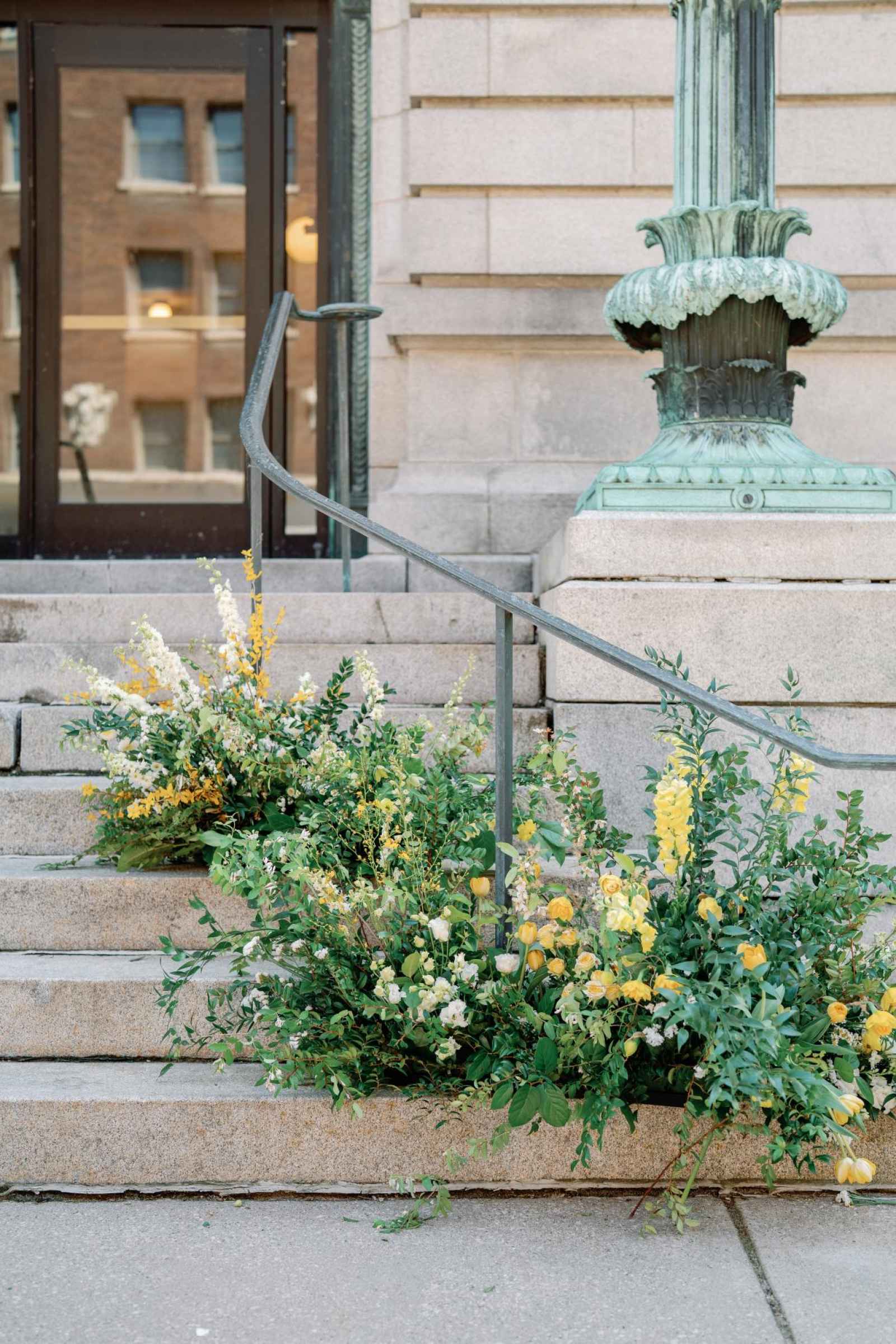 The design team behind this style shoot wanted to step into another era with a springtime twist, and they pulled it off beautifully! To achieve the Art Deco style, they focused a lot on geometric lines and glamorous details. We are absolutely obsessed with this color scheme for a spring wedding, too! The emerald green and yellow fit together so beautifully, reminding us of rebirth and new life after a long winter. For the décor, the team incorporated plenty of elegant items like glassware, golden flatware, satin and velvet. And the venue was a perfect fit for this design, with its marble accents, architectural details and metalwork!