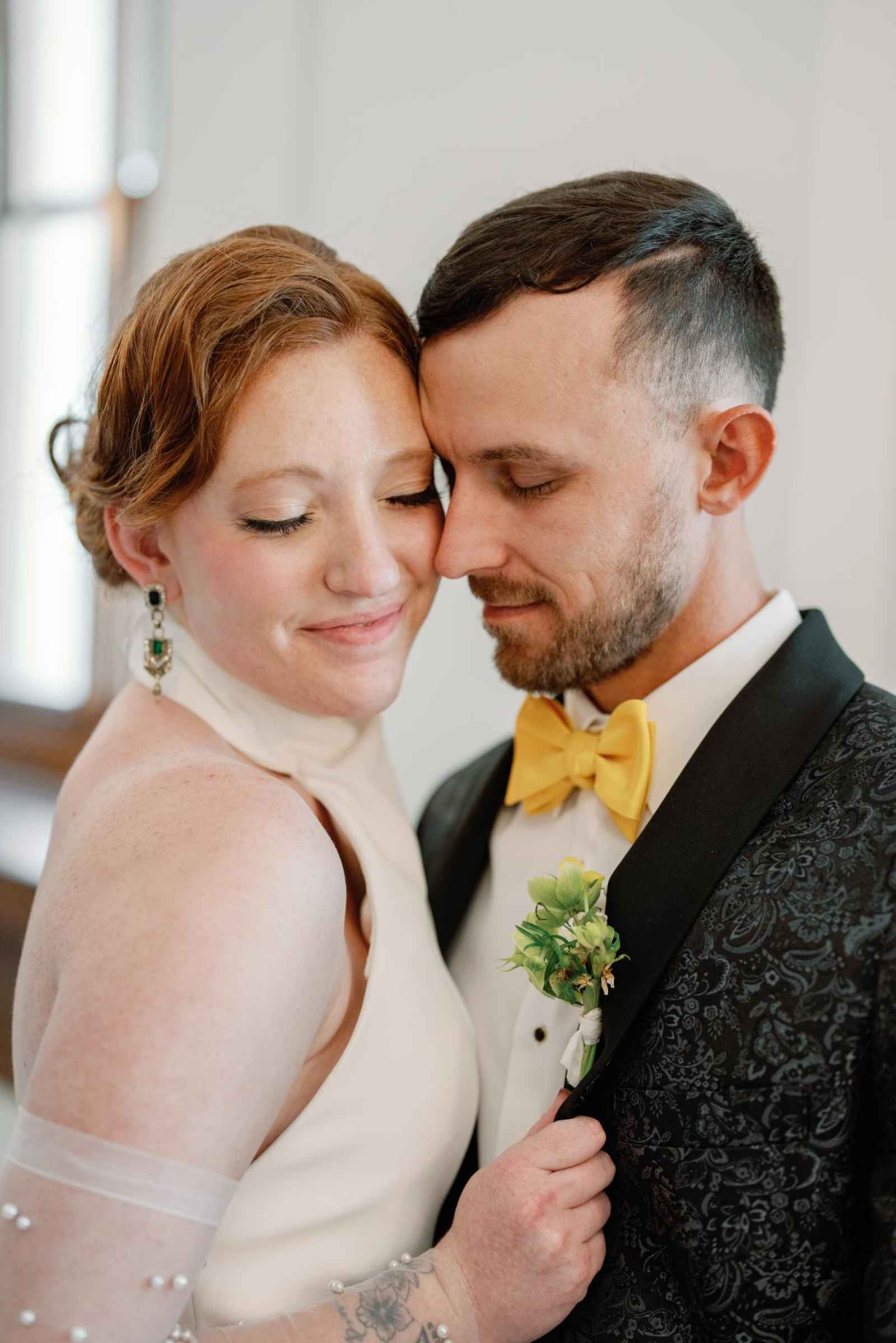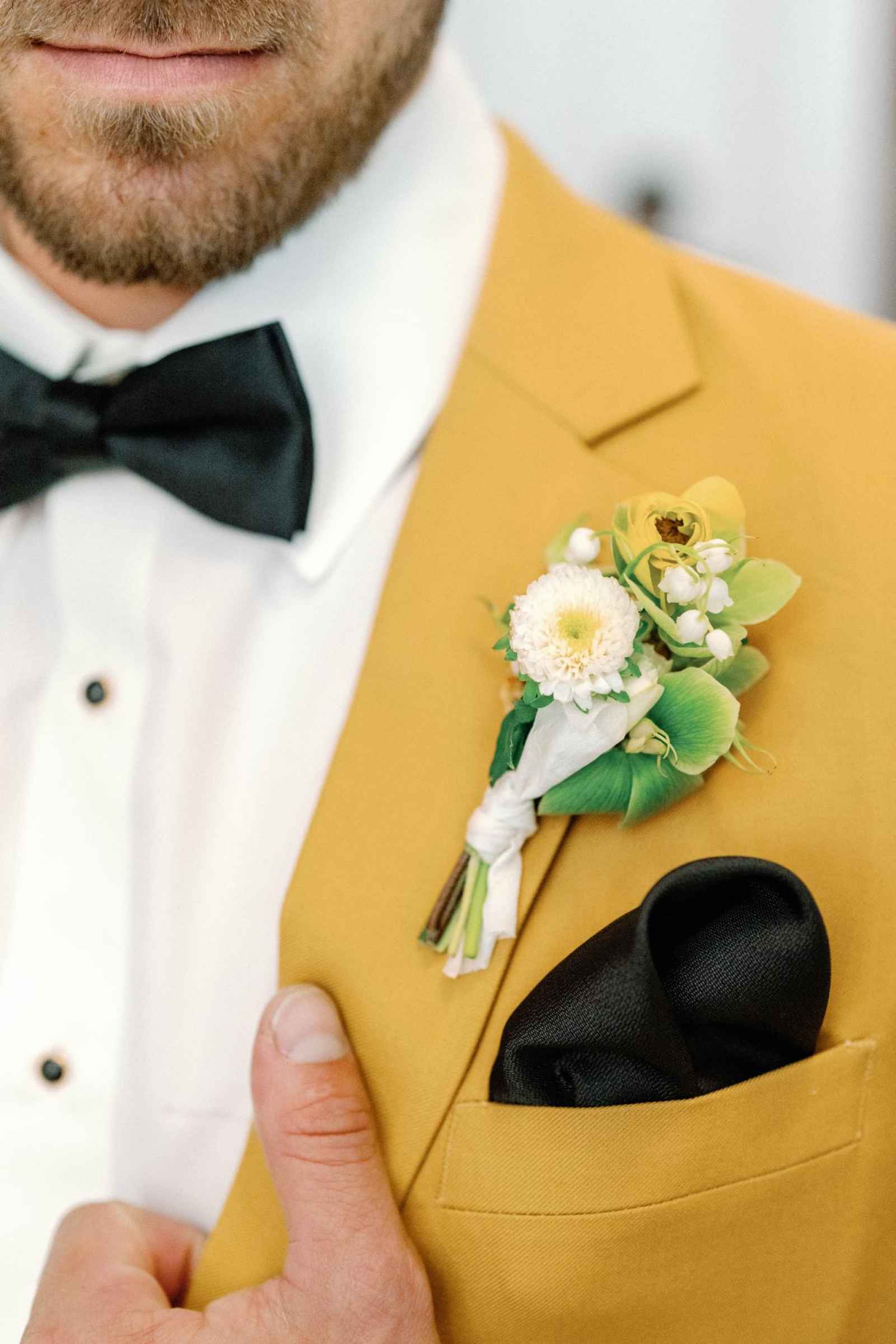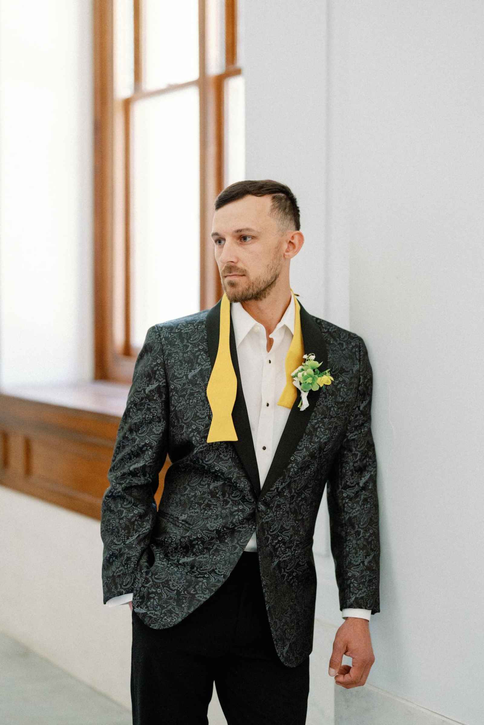 The couple looks like they stepped straight out of a time machine! We love the bride's hair cage and elbow-length gloves, reminiscent of the Art Deco era. The groom was outfitted in both a yellow and green jacket, bringing in the fun, spring color palette even more!