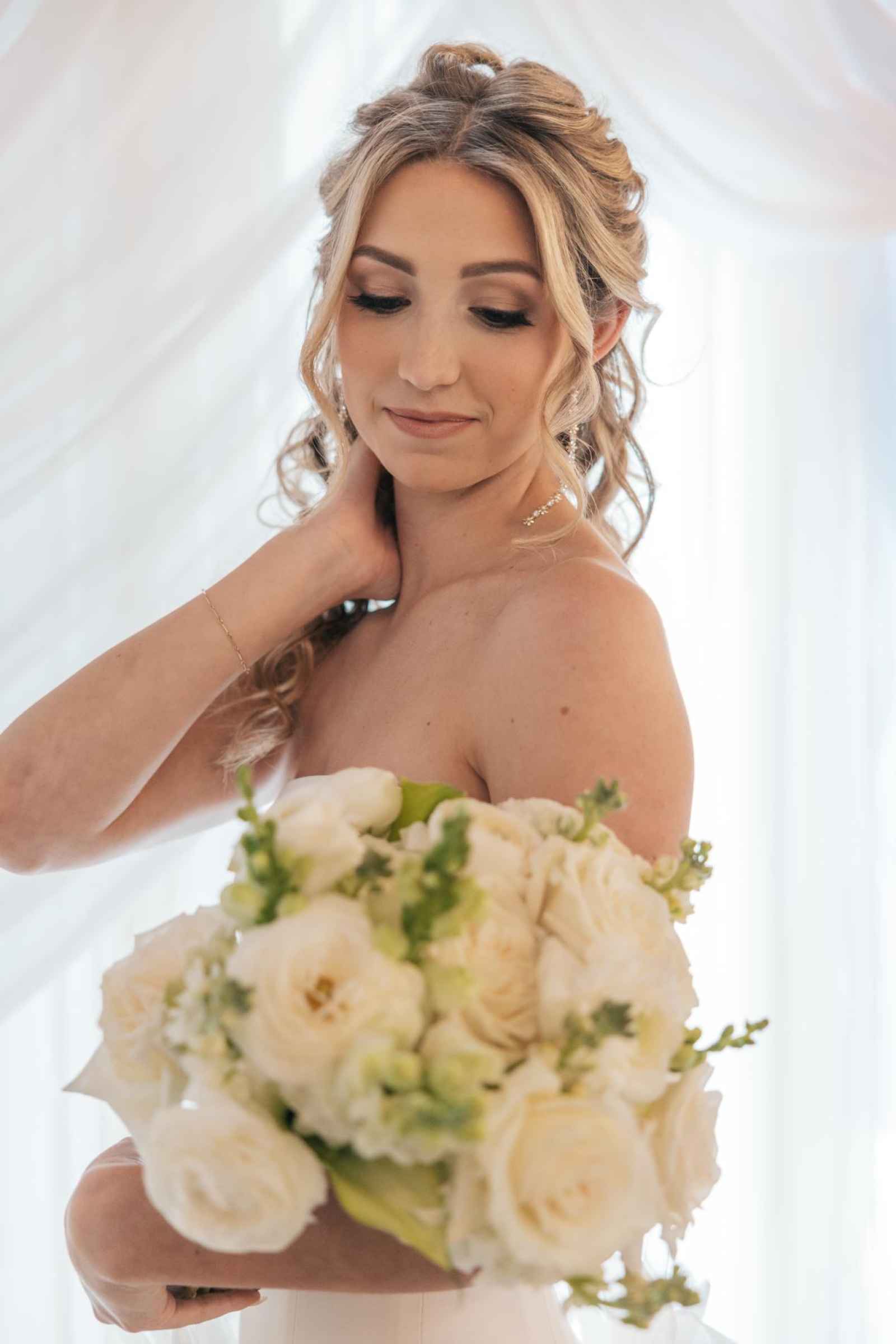 The arbor was draped in flowing fabric and cascading vines, anchored by grand urns overflowing with lush white and green florals. The bride’s soft curls and gently pinned tendrils completed the look, capturing a quiet, princess-like grace that felt both regal and modern.