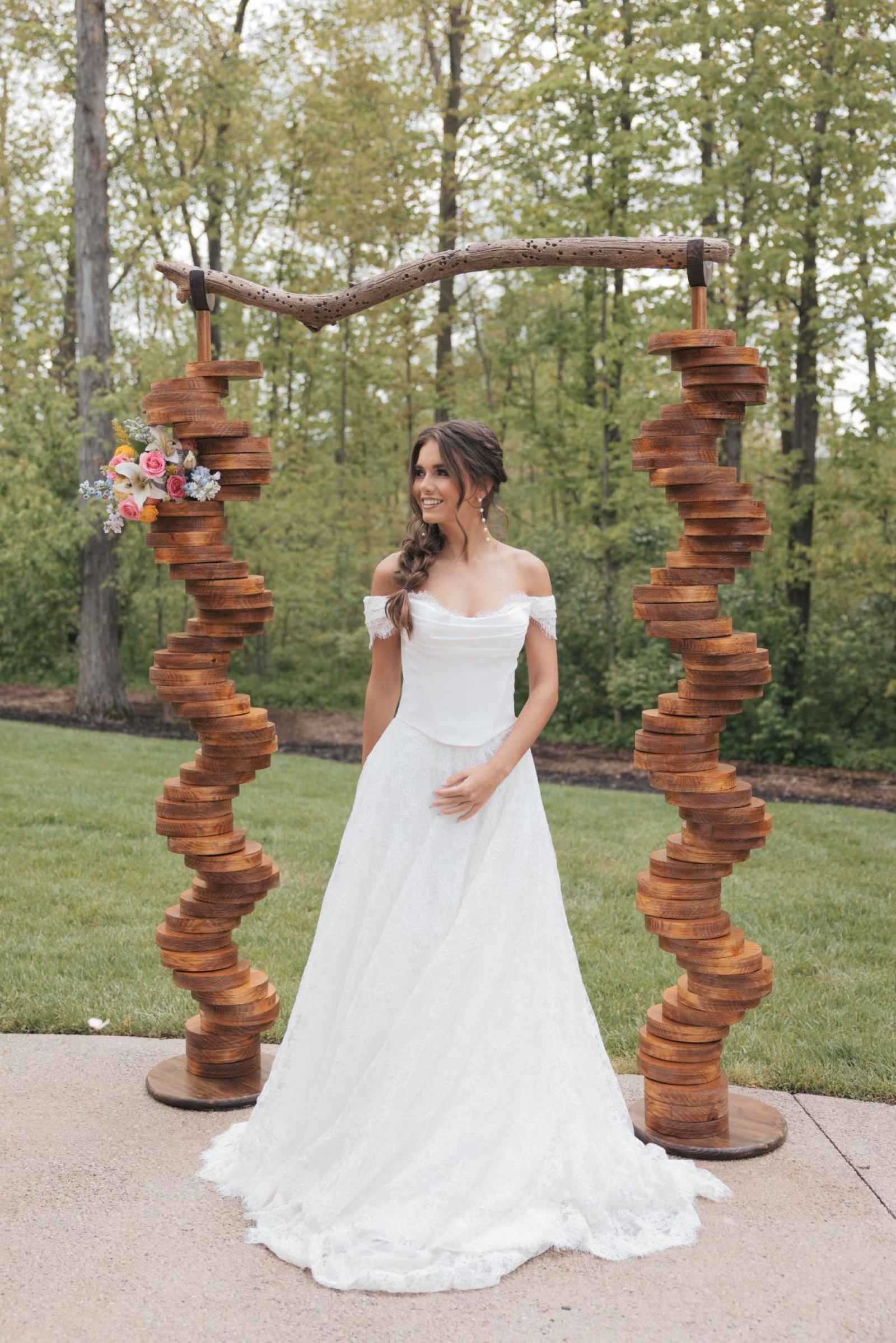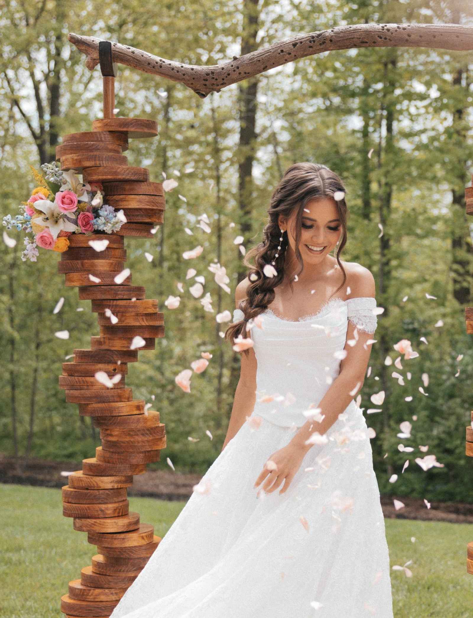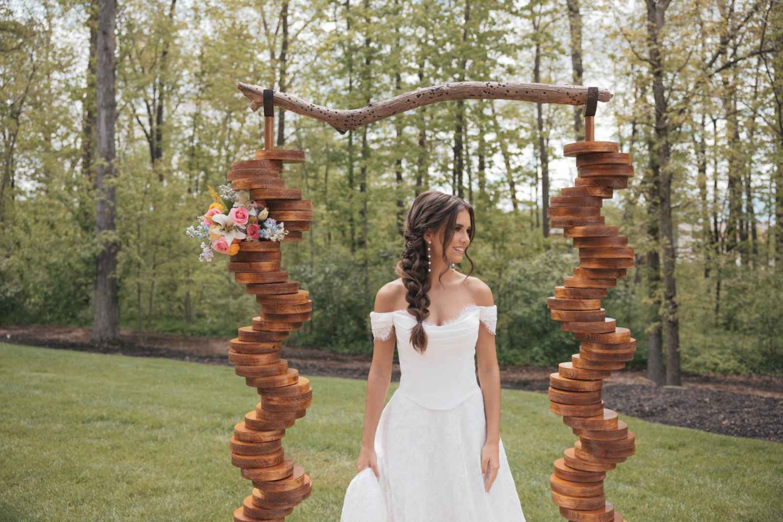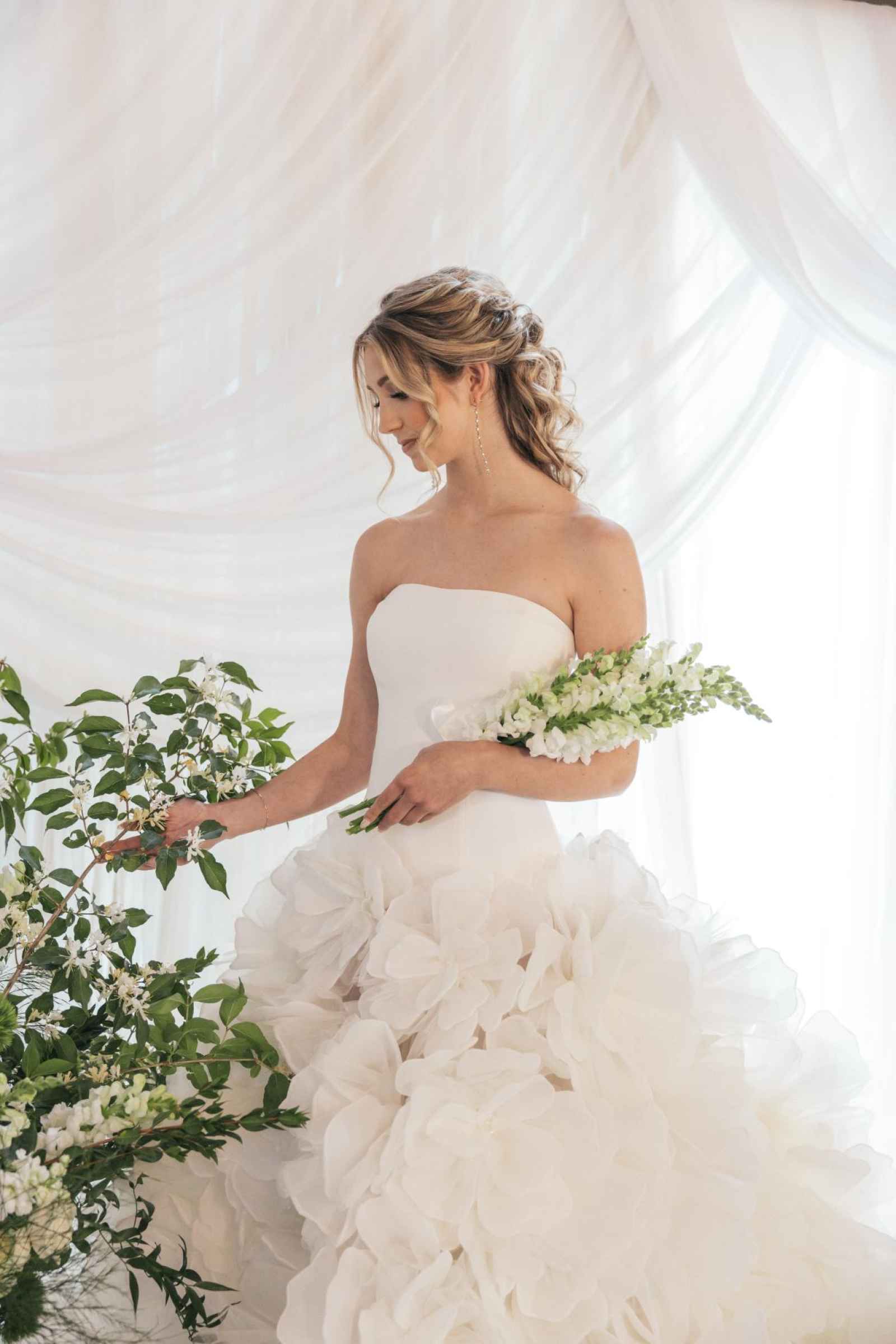 The final vignette brought a touch of playfulness to the story. The setting was adorned with greenery cascading unevenly down a balcony, creating movement and texture. The bride’s Rapunzel-inspired braid, threaded with blooms and soft tendrils, was the perfect nod to classic fairytales reimagined for today’s romantic dreamer! Outside, a handmade arbor by a local wood and floral artist continued the tone for this ethereal shoot.