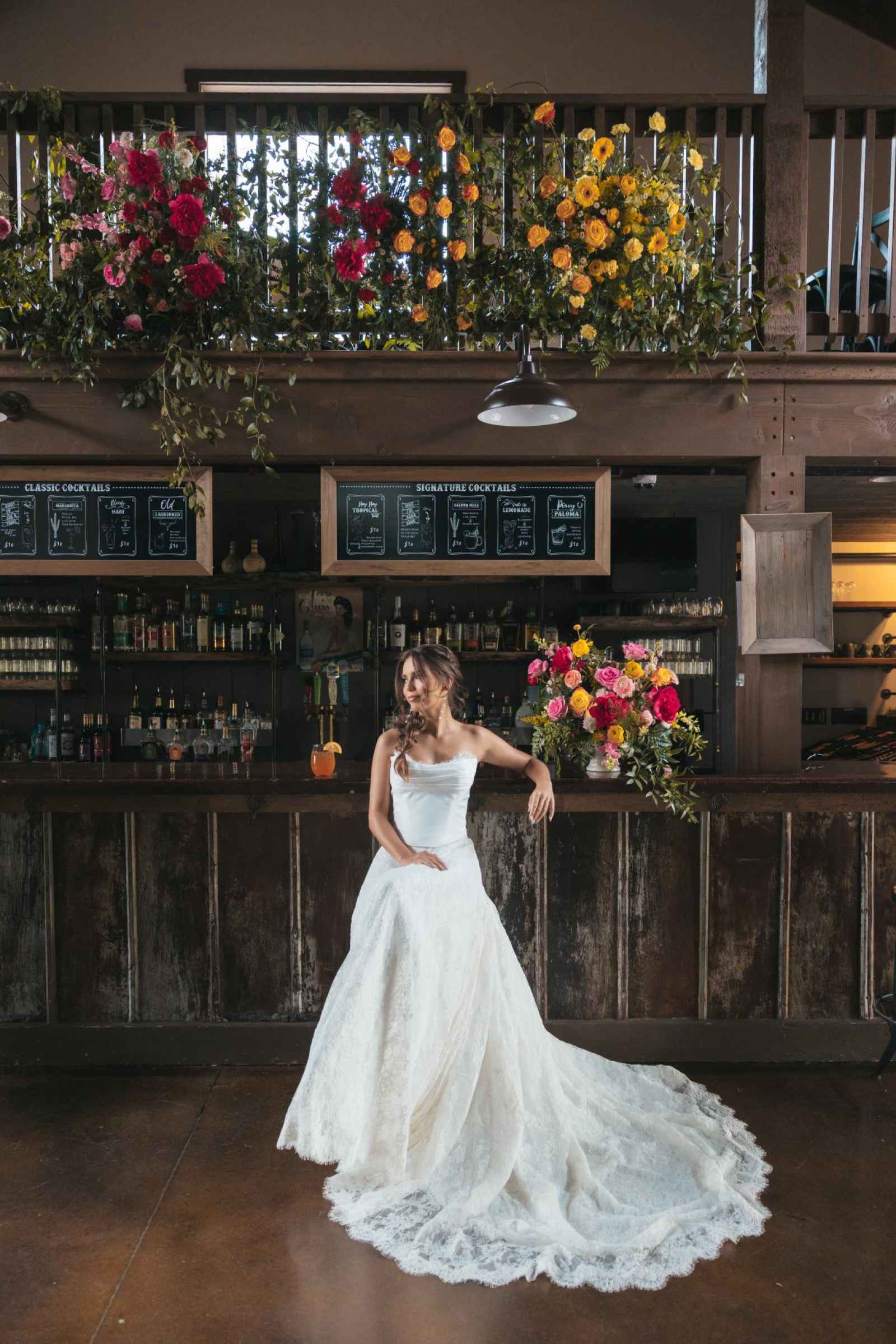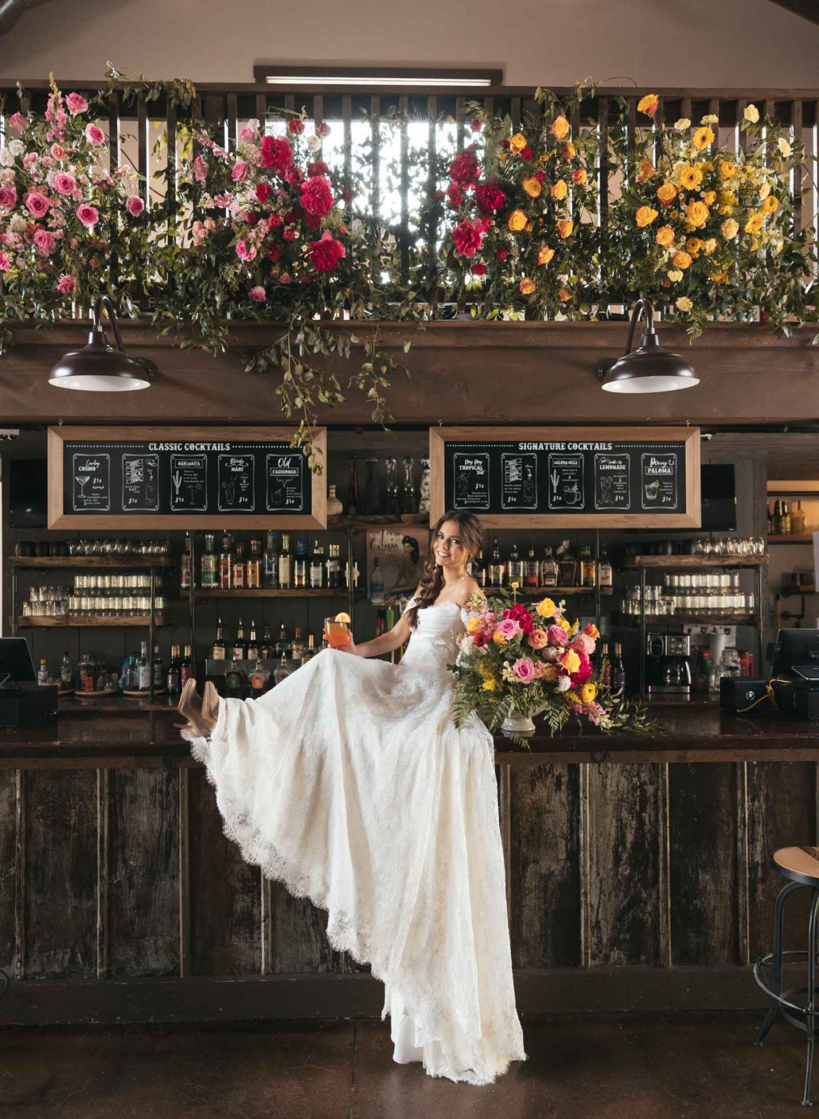 This vignette transformed a rustic cabin setting into a scene of whimsical sophistication. The table was dressed in soft draping, eclectic décor and candlelight that flickered like starlight through the trees while the florals danced between hues of muted yellows oranges and pinks. With her soft waves and stylish fedora, the bride embodied the effortless allure of a woodland muse!