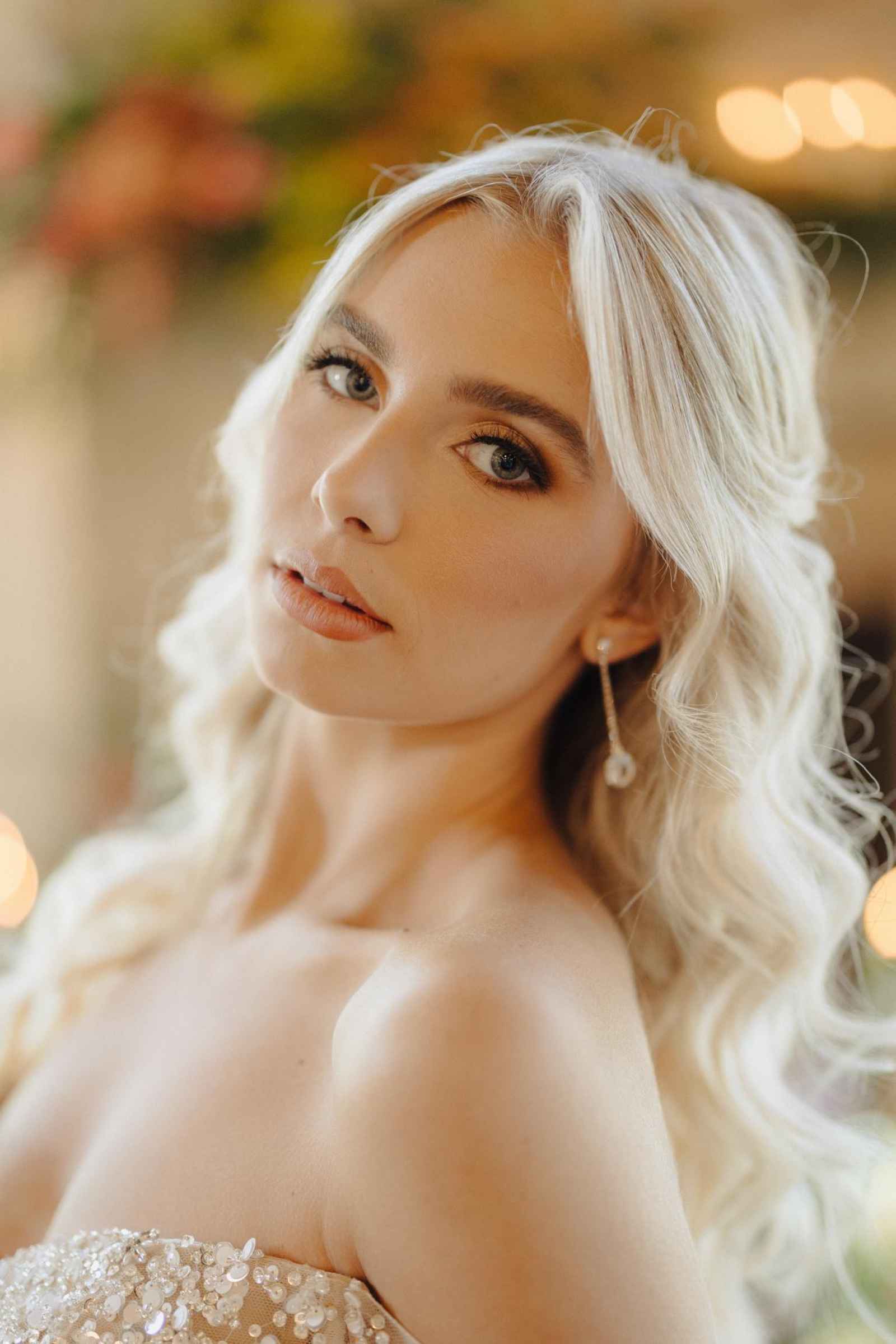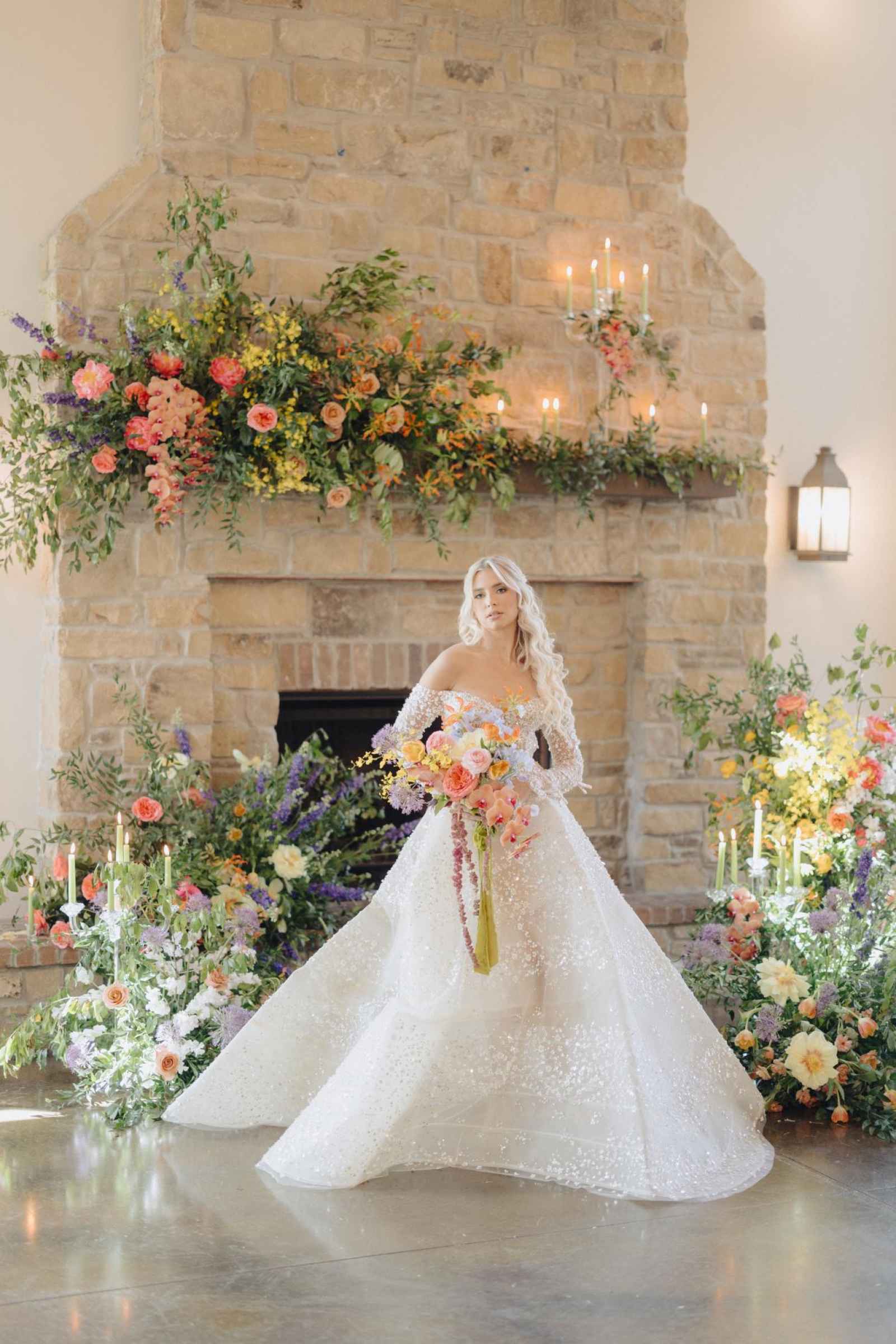 The warmth of the fireplace vignette evoked an intimate fairytale charm. With a palette of soft, romantic hues, the scene featured a statement-making fireplace adorned with overflowing florals and an abundance of candlelight and glowing candelabras. A bouquet tied with flowing silk ribbon completed the vision, while the model’s loose waves and soft floral accents enhanced the dreamy, timeless mood.
