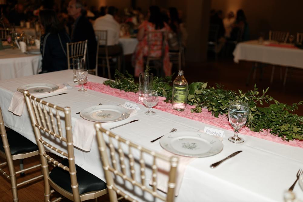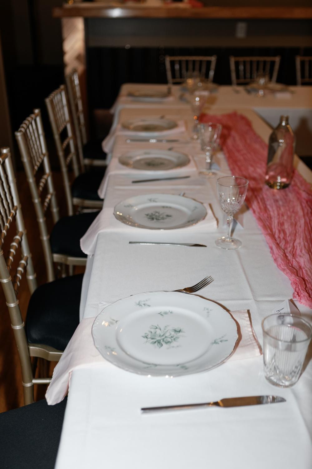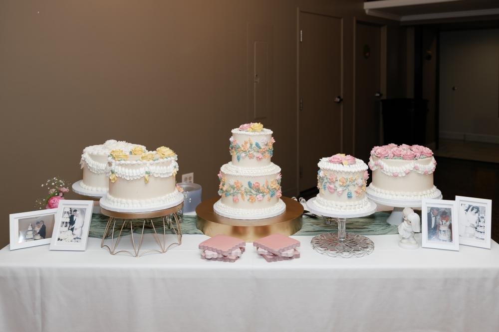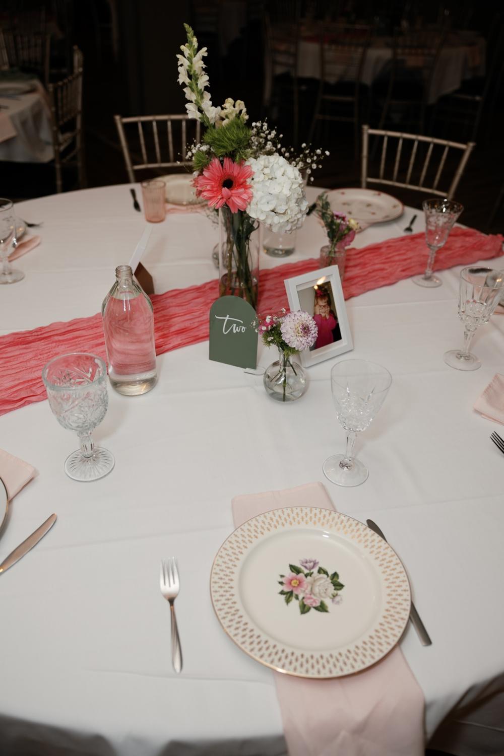 Regarding their theme, Madison thought about adding lots of color but was worried that getting married in the fall wouldn't complement that palette. Then, she and Trenton decided it was their wedding, and they could do what they wanted! They settled on basing colors off their florals, including lots of color and even floral-printed dishes. They selected green and pink as their wedding colors not realizing they were Madison's parents' wedding colors! Another touch that honored their families were cakes modeled after their loved ones' wedding cakes.
