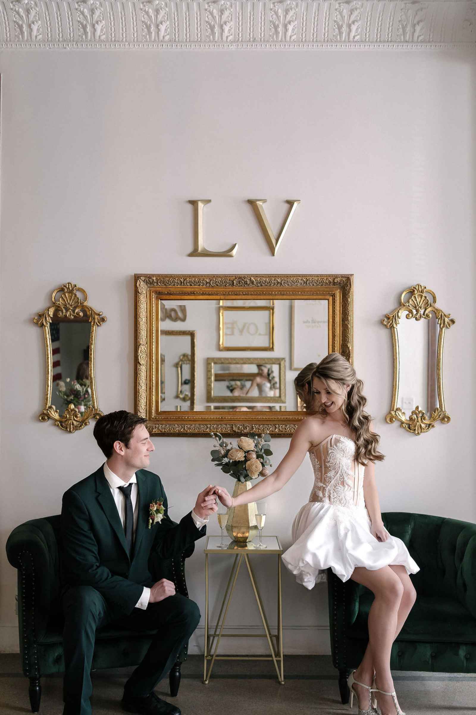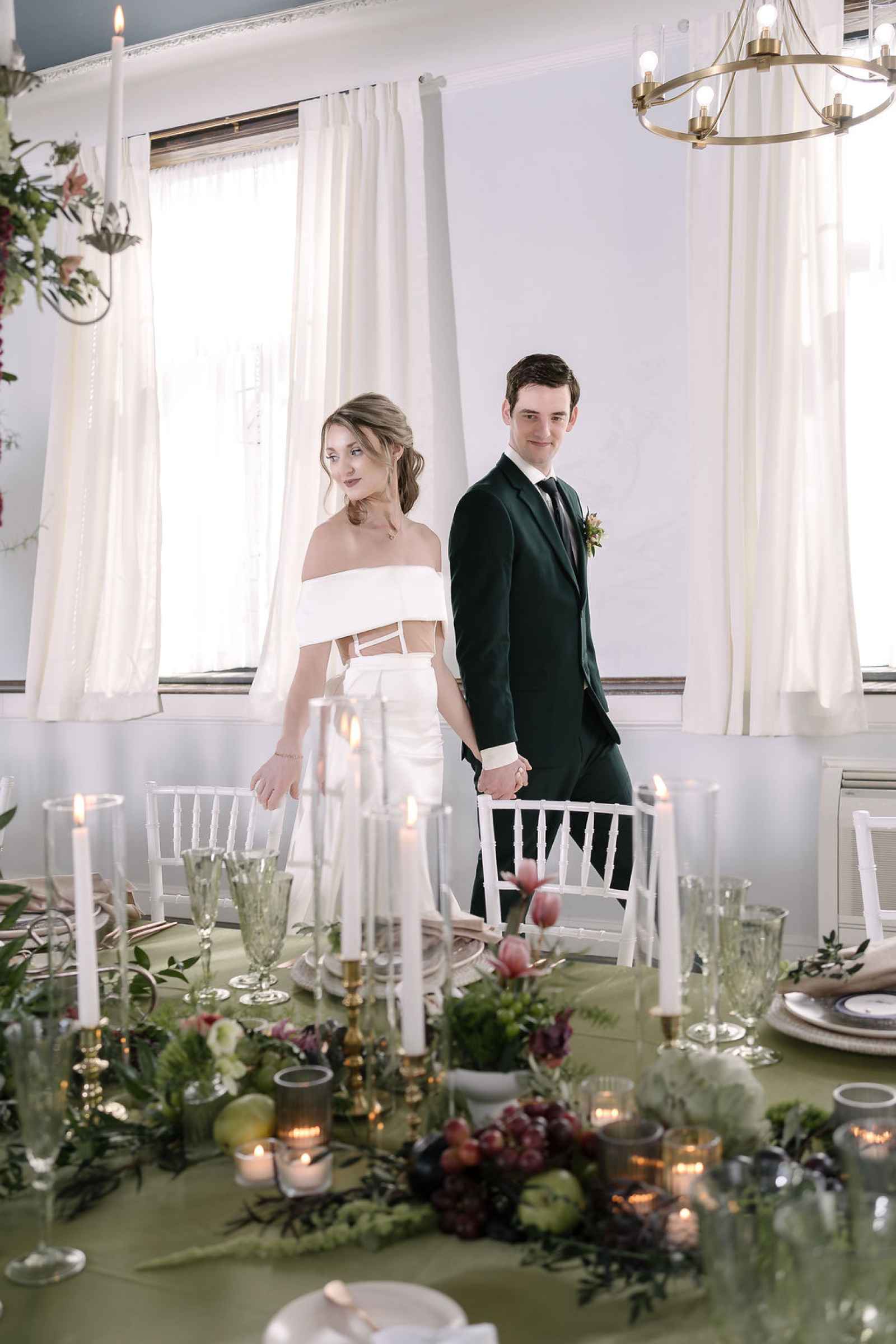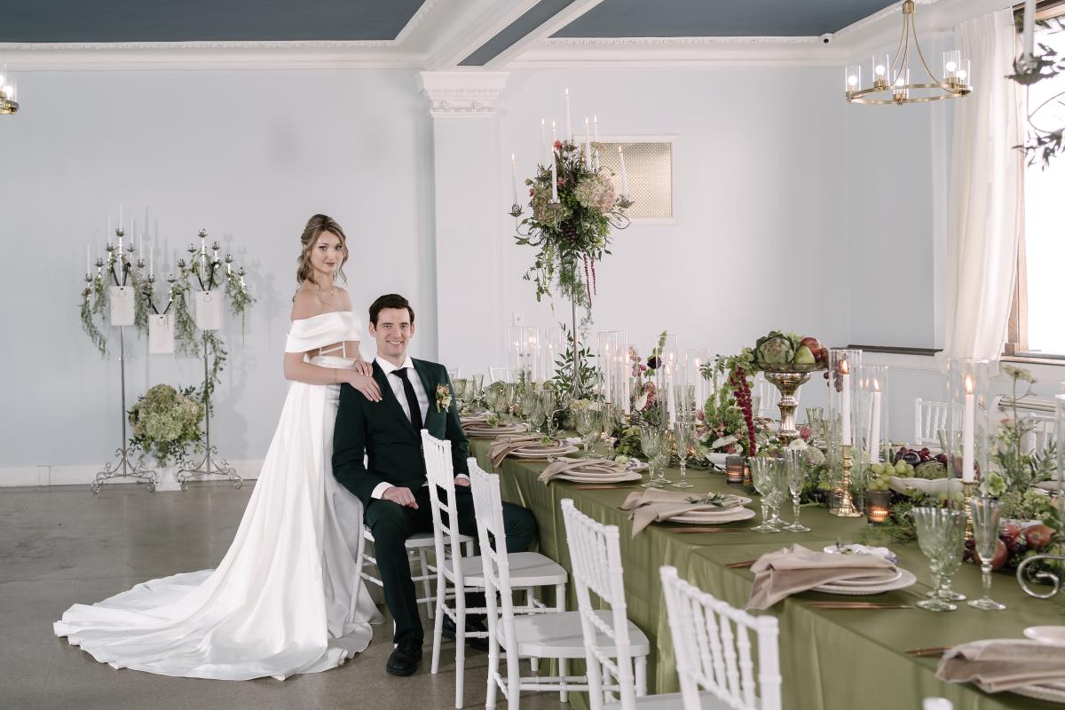 The Grand LV, built in 1928 and thoughtfully renovated in 2019, is a historic gem in downtown Niles, Michigan, offering timeless character and a versatile space. Its abundant windows in the Kull Memorial Stateroom flooded the shoot with beautiful natural light, enhancing the fresh, sophisticated aesthetic Jaime envisioned. We also fell in love with the grand staircase and opulent chandelier! By leaning into these standout architectural features, we created a setting that felt both timeless and inviting—perfectly complementing our theme.