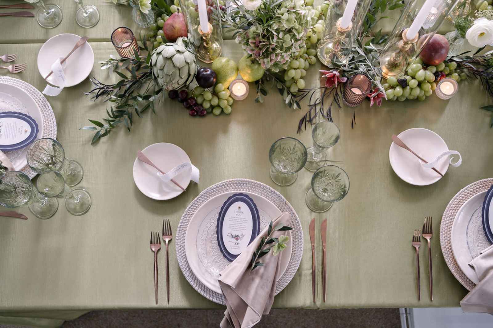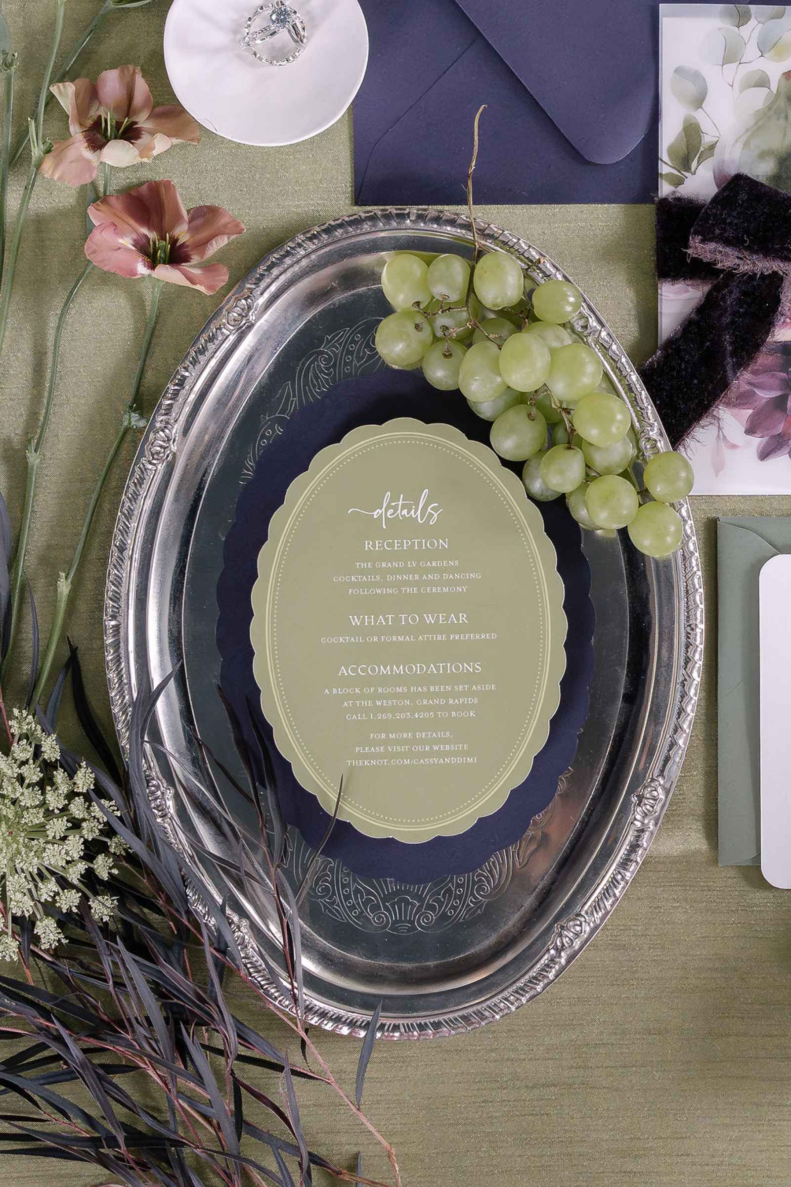 For our Southwest Michigan spring/summer cover shoot, Jaime Weinfeld Zeltzer of JW Designs was inspired by the vibrant green that’s flourishing in our gardens this season and making its way into modern wedding design. She explains, "This color can easily transport you to a lush space but also add a fresh sophistication to any design." Her vision was to channel that green in a way that felt luxurious and intentional—think old-world elegance reimagined with a modern twist and unexpected details. Captured beautifully by Autumn & Hive, the interplay of bright green with rich fig purple created a dynamic palette that balanced vibrancy with softness, ensuring no detail—no matter how delicate—was overshadowed.