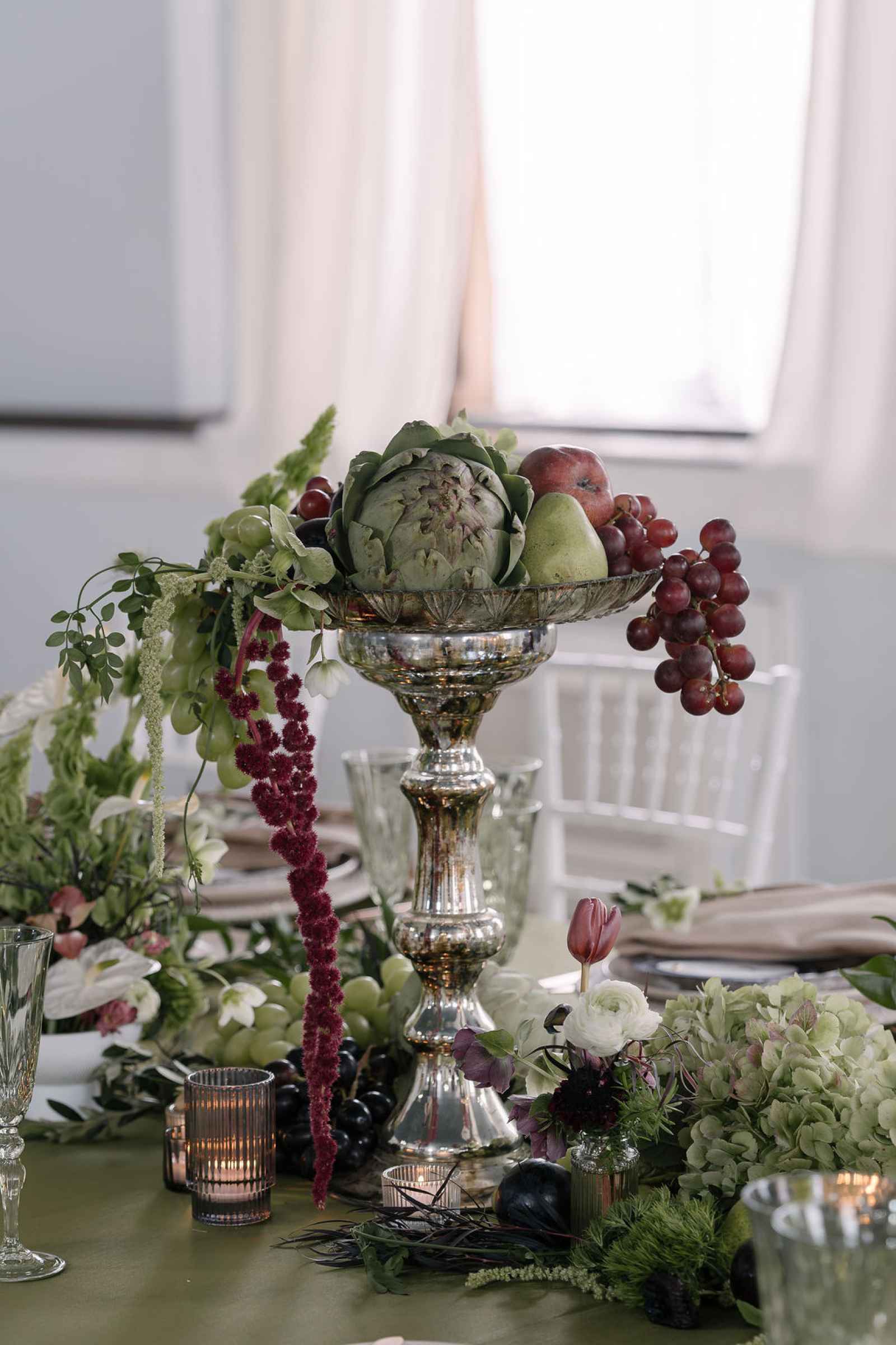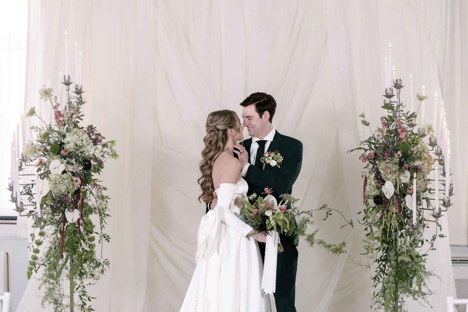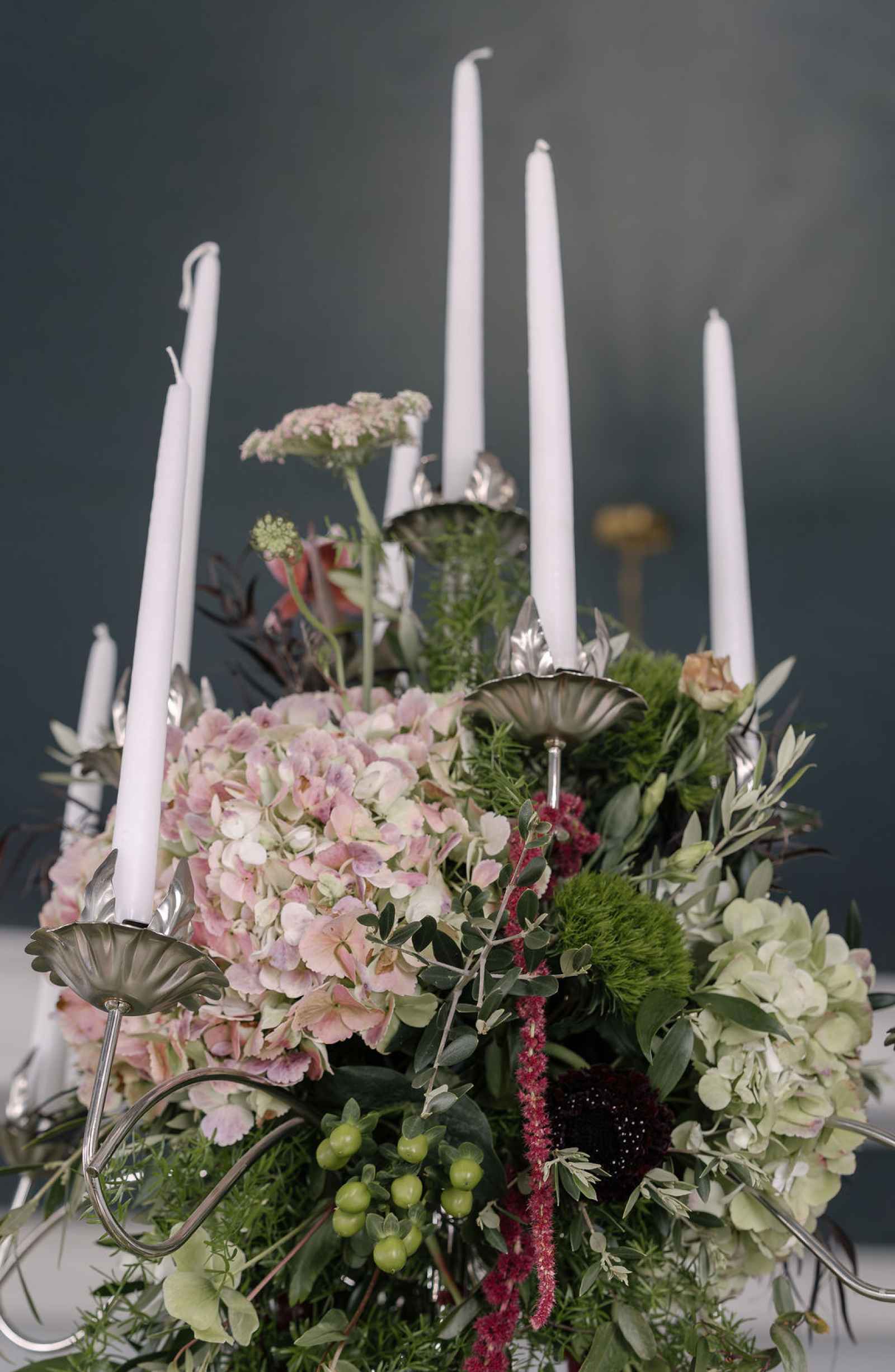 For the florals, Jaime wanted the florist's creativity to take center stage. After sharing the overall aesthetic and vision, Flowers by Anna ran with the concept, sourcing blooms first by color and then by texture to bring our lush, abundant vision to life. The arrangements cascaded from the silver candelabras and spilled across the tablescape, thoughtfully composed to feel as if they had naturally grown wild in the space. Every flower was chosen to complement the rich shades of green and plum, adding organic movement and depth that perfectly tied together the entire design.