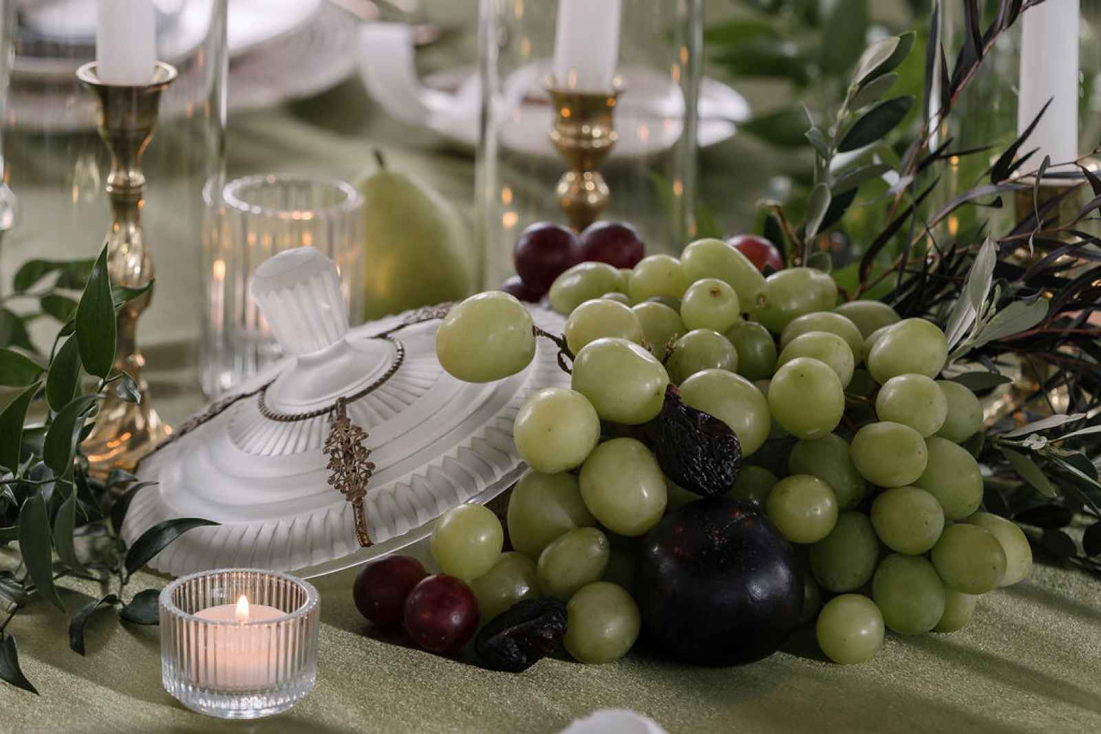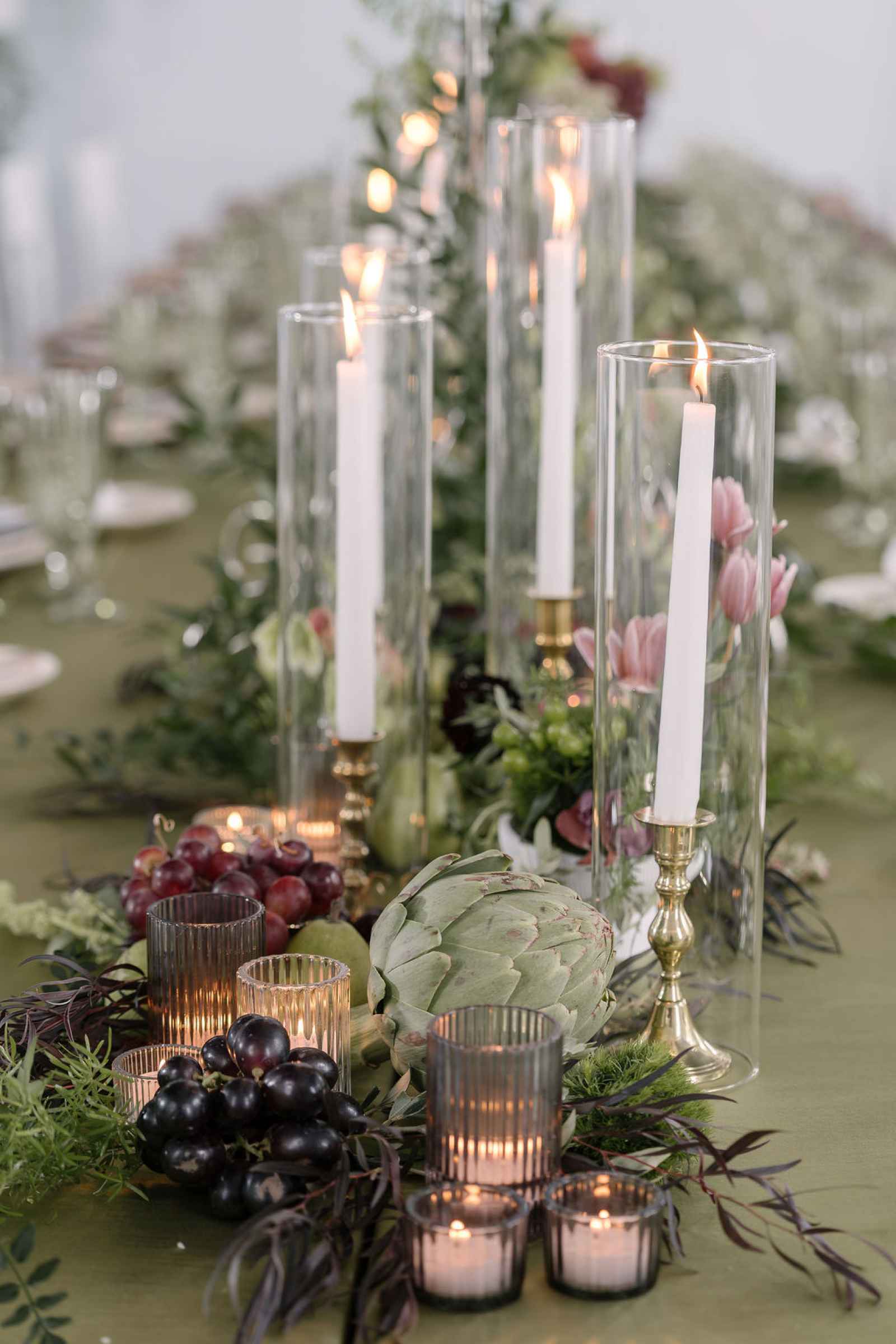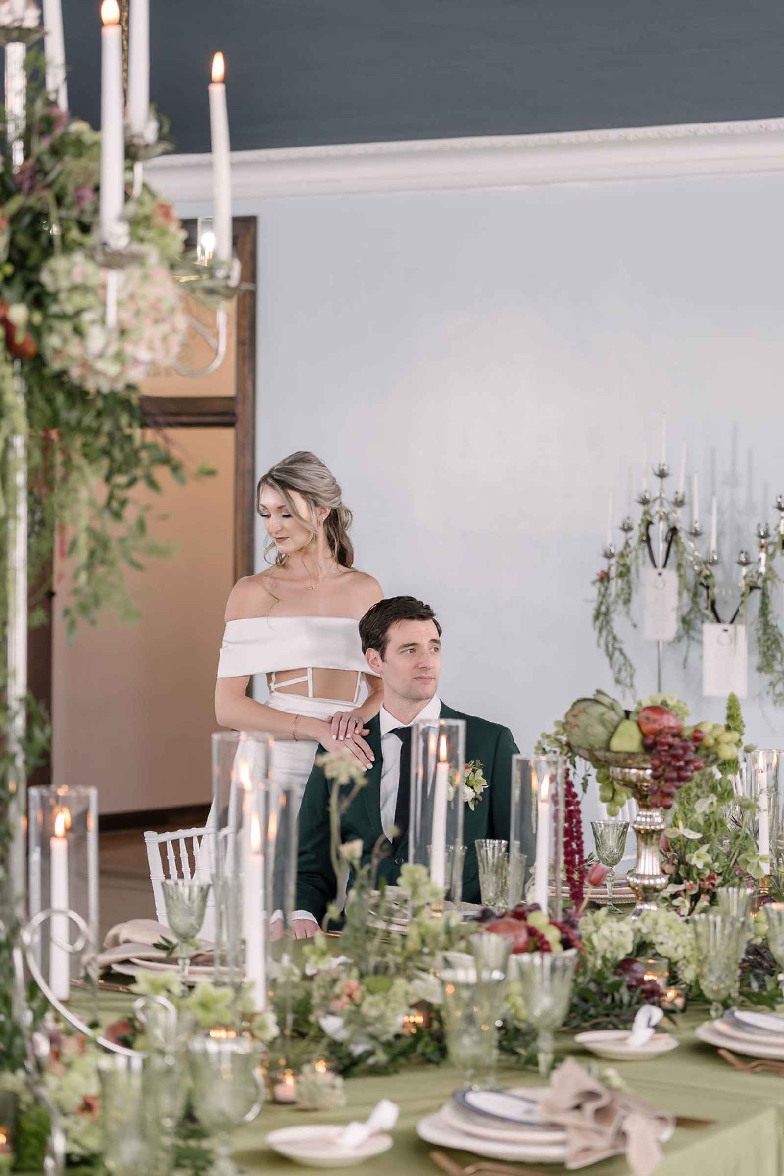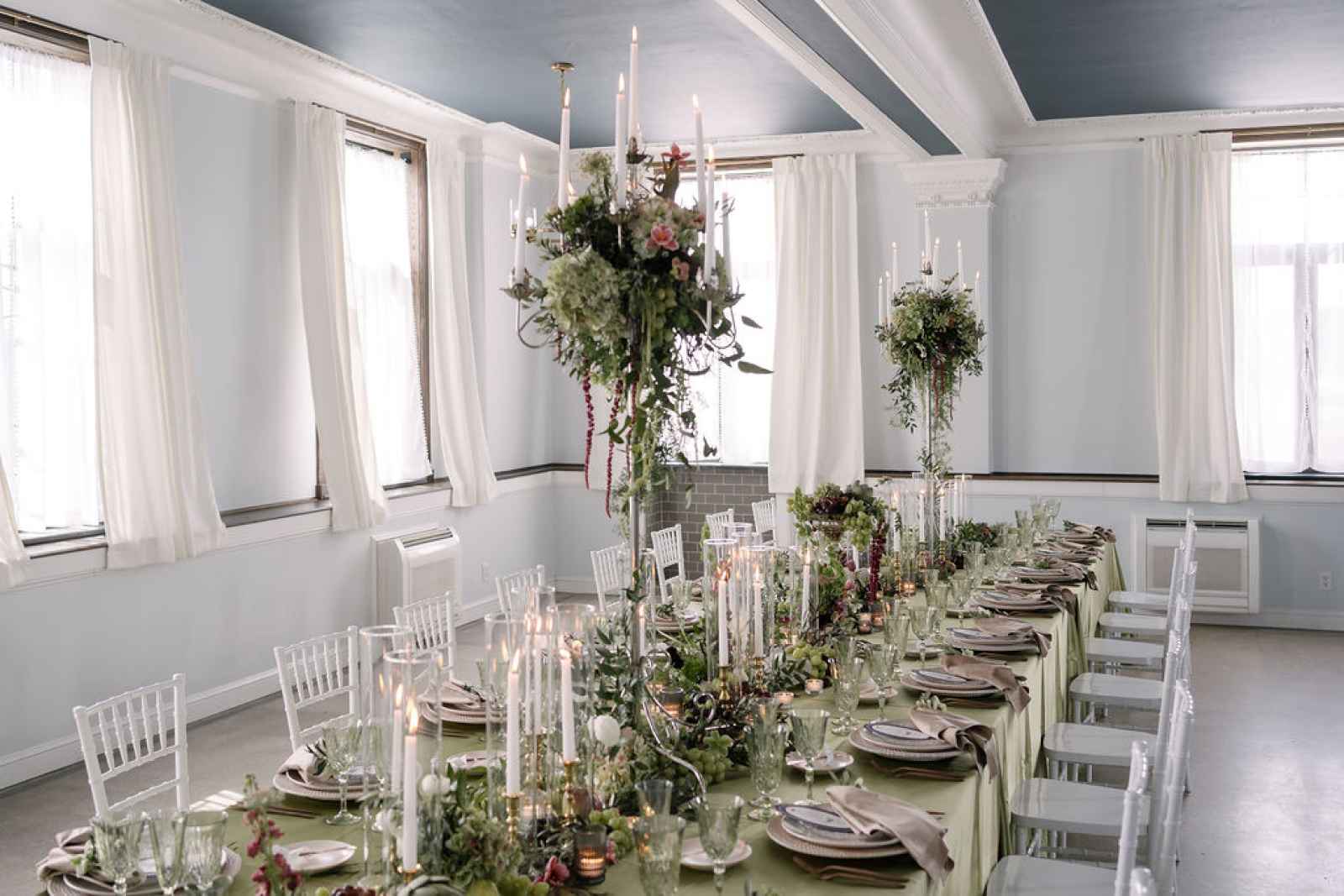 For the florals, Jaime wanted the florist's creativity to take center stage. After sharing the overall aesthetic and vision, Flowers by Anna ran with the concept, sourcing blooms first by color and then by texture to bring our lush, abundant vision to life. The arrangements cascaded from the silver candelabras and spilled across the tablescape, thoughtfully composed to feel as if they had naturally grown wild in the space. Every flower was chosen to complement the rich shades of green and plum, adding organic movement and depth that perfectly tied together the entire design.