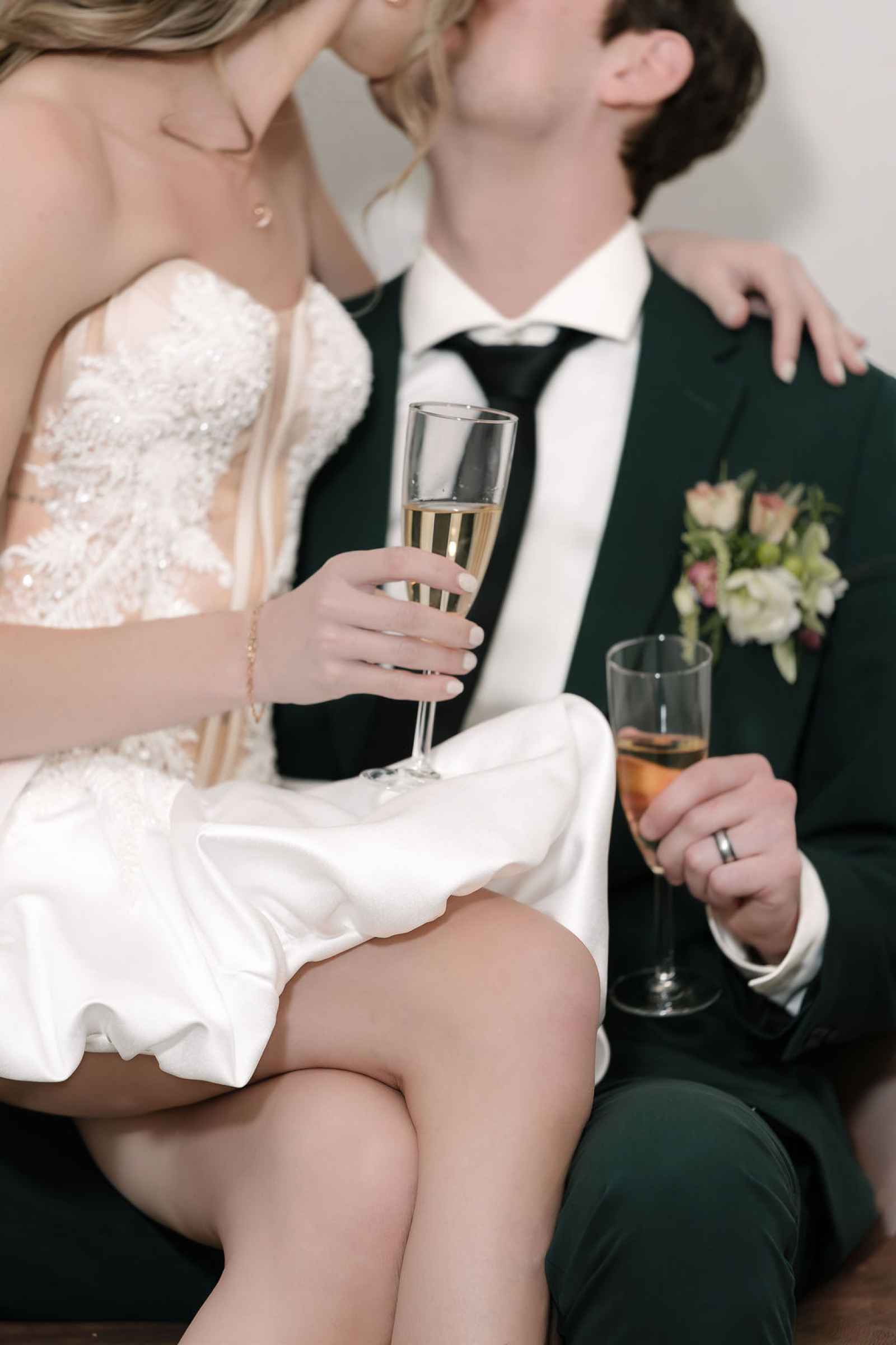 CBTKbrand drew inspiration from the luxurious design, showcasing three of their stunning new creations. The selection included two breathtaking ballgowns—both with flowing satin and cathedral trains. One featured an oversized bow and off-the-shoulder long sleeves for a classic, romantic look, while the second combined drama and versatility with a detachable skirt and train, complete with a mesh corseted bodice and off-the-shoulder neckline. The final look was a playful party dress with a short satin bubble skirt, sparkling appliqués and a corseted bodice of mesh. To complement these looks, BÜK Weddings chose soft, natural makeup that defined the bride’s beautiful features—especially her soft blue eyes—without overpowering them. Warm tones of peach and gentle browns enhanced her eyes and lips, keeping the overall vibe fresh and romantic. Blushing Beauty & Co. styled her hair in loose, soft curls cascading down her back in a half-up style, which paired effortlessly with the cathedral veil and added to the graceful, ethereal feel of the entire shoot!