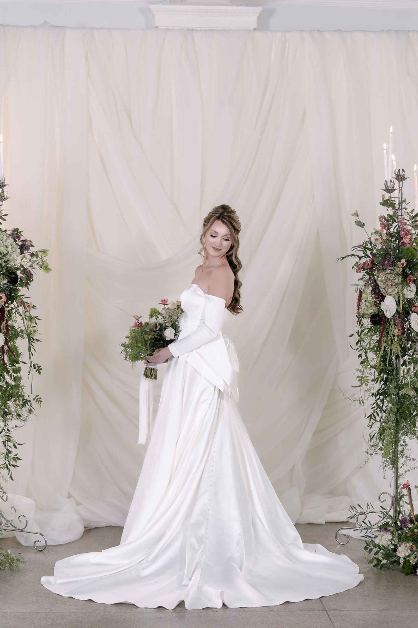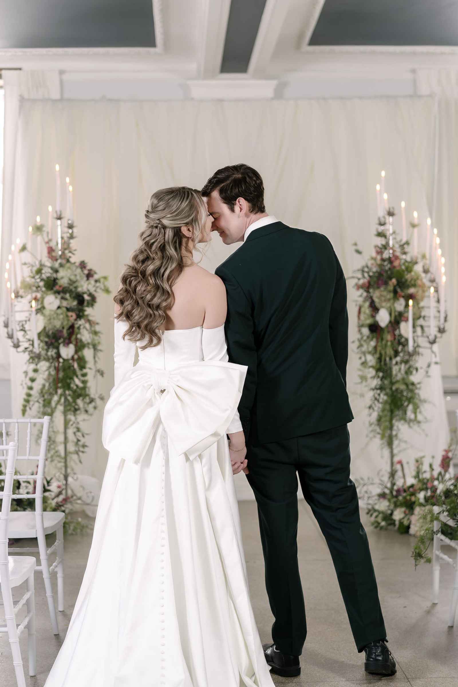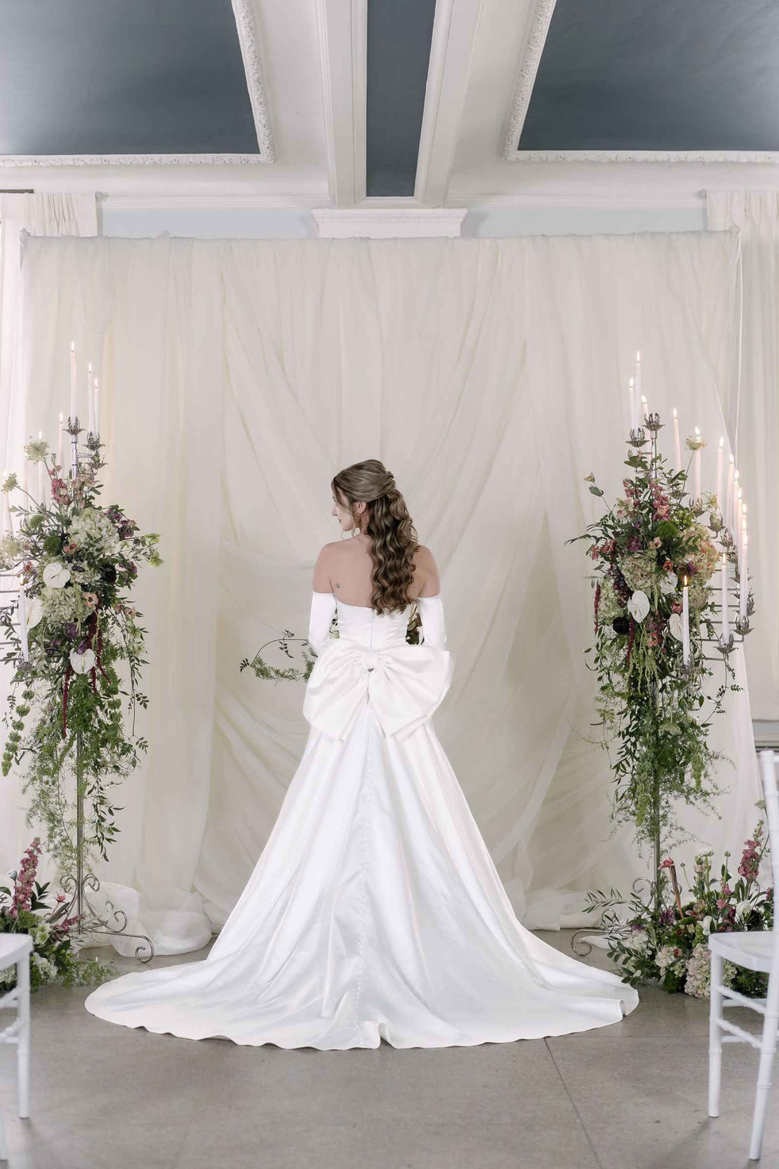 The décor was a true collaboration of vision and artistry between JW Designs and Blue Sky Event Rentals. "The core details of the shoot were their showstopping silver candelabras, lush velvet and majestic satin linens, with plateware of natural stone, crystal and rattan, glassware of green crystal and bronze flatware," Jaime explains. These core pieces laid the foundation for a look that felt both luxurious and intentional. AAYS Event Rentals elevated the ceremony setup with soft, romantic pipe and drape, creating a dreamy backdrop that added depth and texture. This editorial reflected some of 2025’s hottest wedding trends—from old-world fabric draping and layered velvet linens to chic satin gowns with statement bows. We also loved the grand reception table that brought a sense of intimacy and elegance to the celebration!