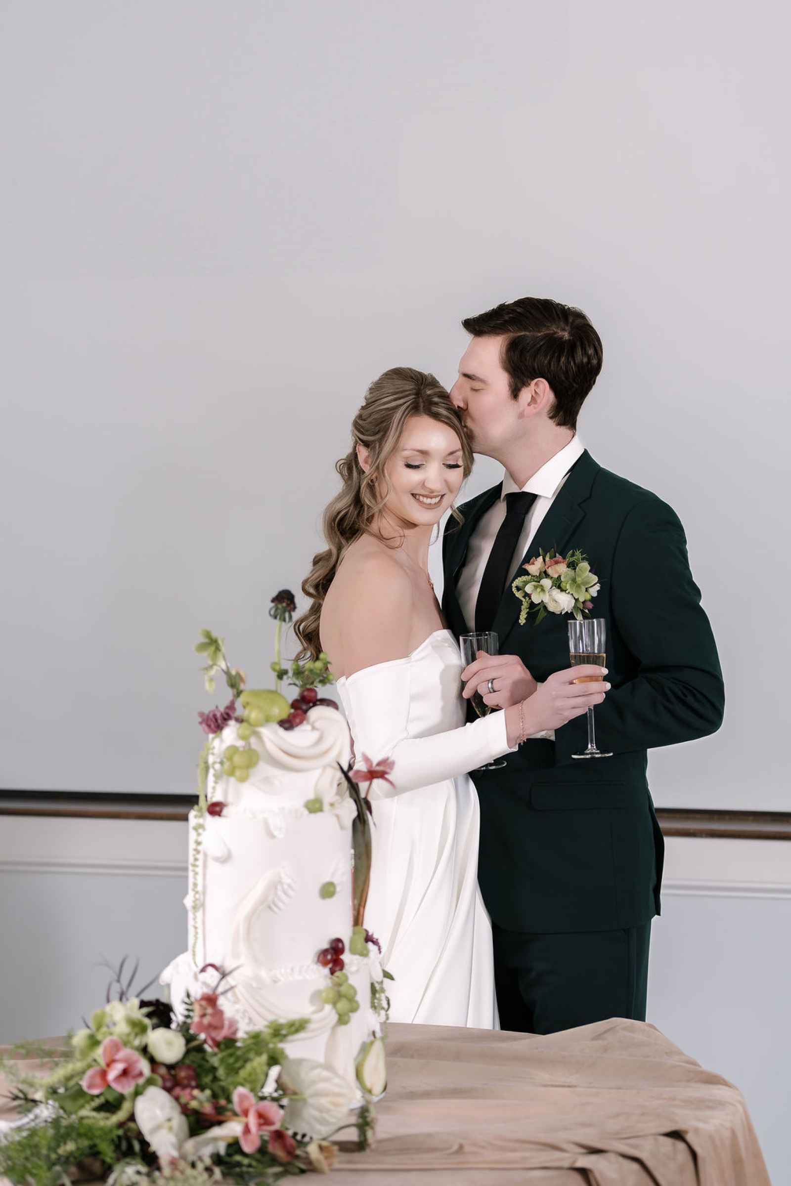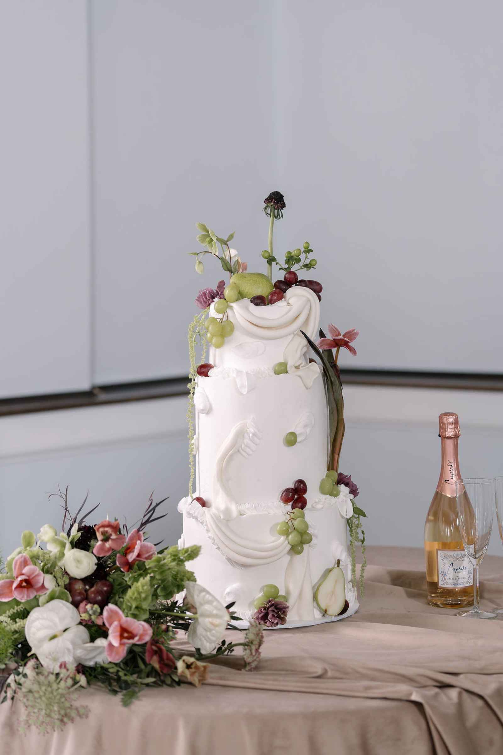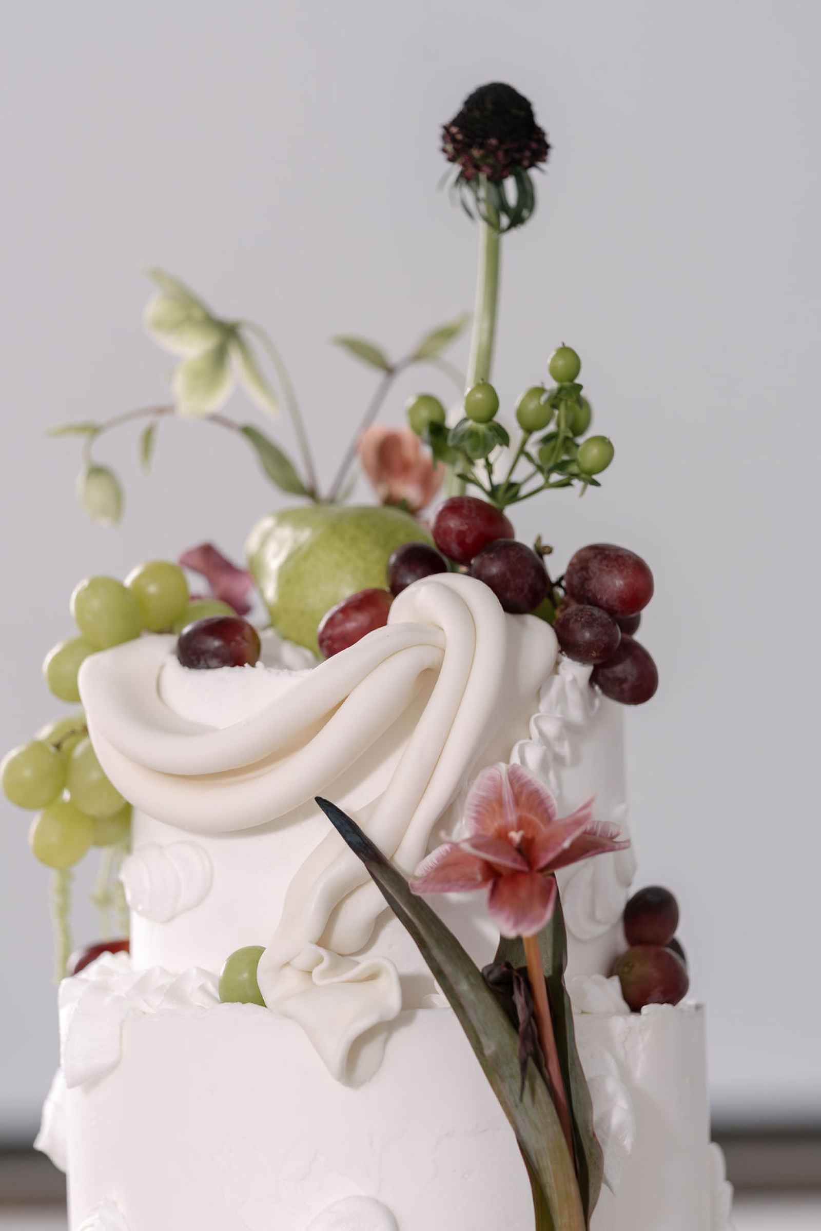 The cake was an edible work of art, adorned with fresh fruit and lush florals. Mimicking the billowing movement of the drapery from the ceremony, this delicate three-tiered masterpiece brought together all the elements of our luxurious shoot in one stunning centerpiece!