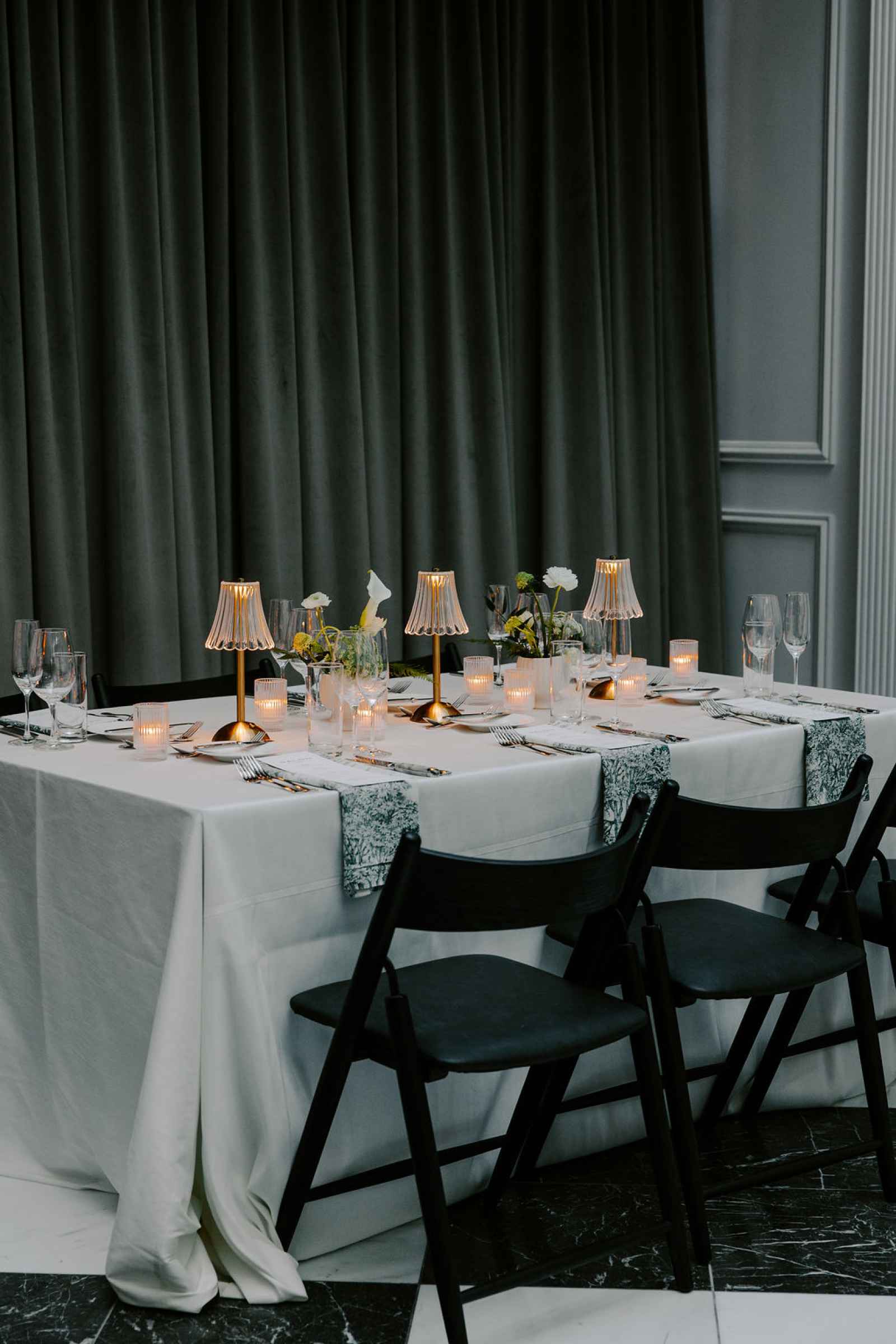 The vision for this shoot was to create a luxurious and exotic scene in a modern Chicago venue. Despite a small snafu with the plants not surviving the Chicago temperatures in February—mended by a trip to a floral wholesaler—this vision came to life perfectly! When deciding the details for this day, the team based everything on what would make the florals pop the most. They settled on a simplistic yet modern design with numerous black and white elements that elevated the atmosphere of the scene. As for the florals themselves, they utilized anthurium, green hydrangea, calla lilies, draping amaranthus and ranunculus to fill the space. Each bloom has a unique design that can stand on its own, but when placed with the rest of the florals, it created a stunning array of textures and designs that make this shoot feel like it was set far from the windy city. We love how simple yet luxurious this shoot turned out with all the neutral, elegant details!