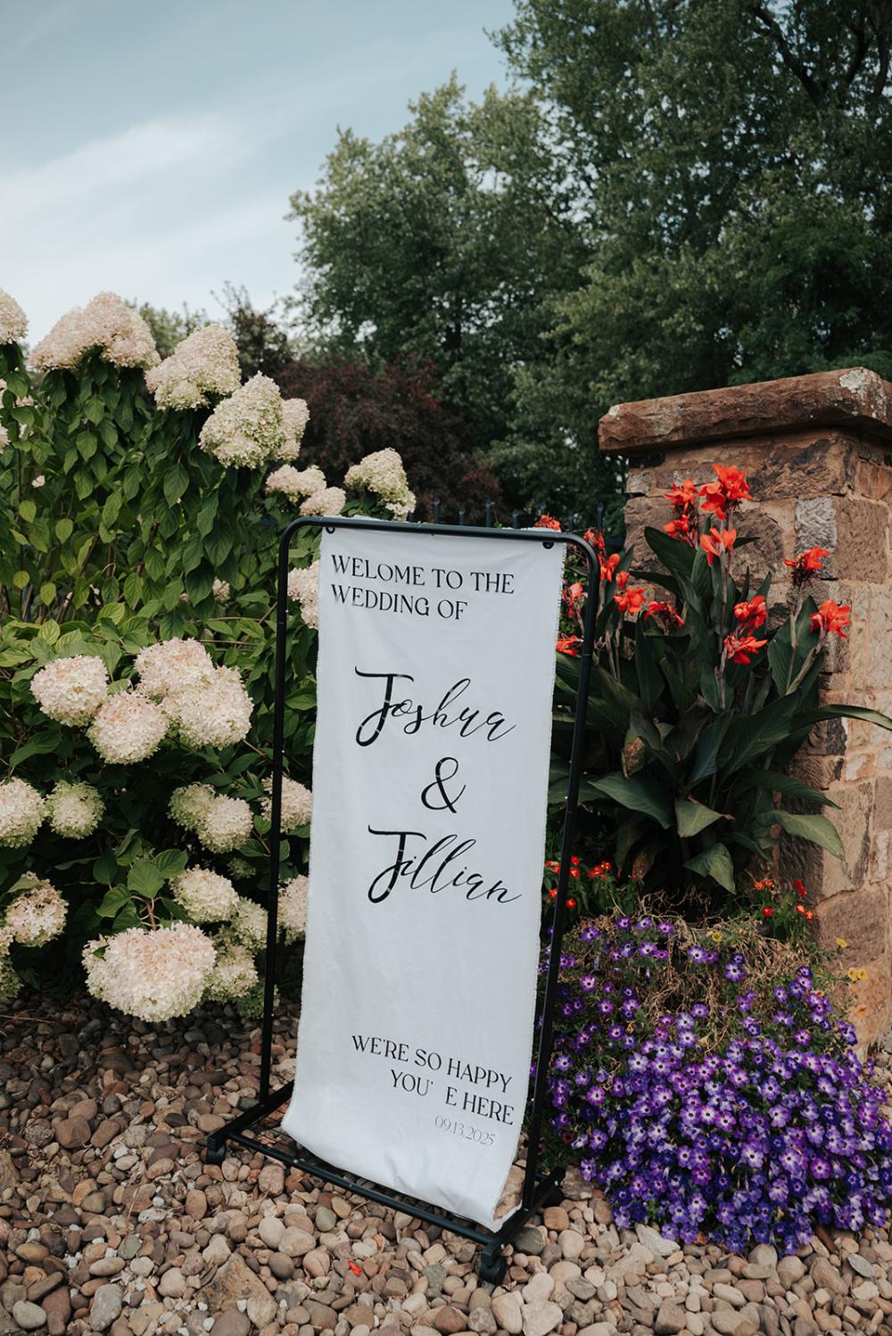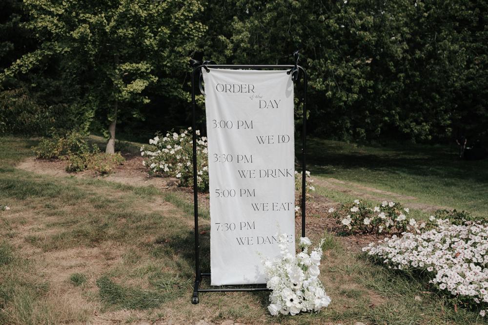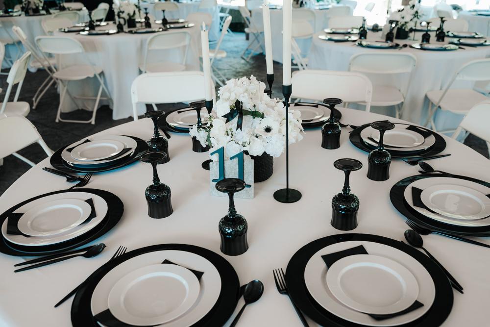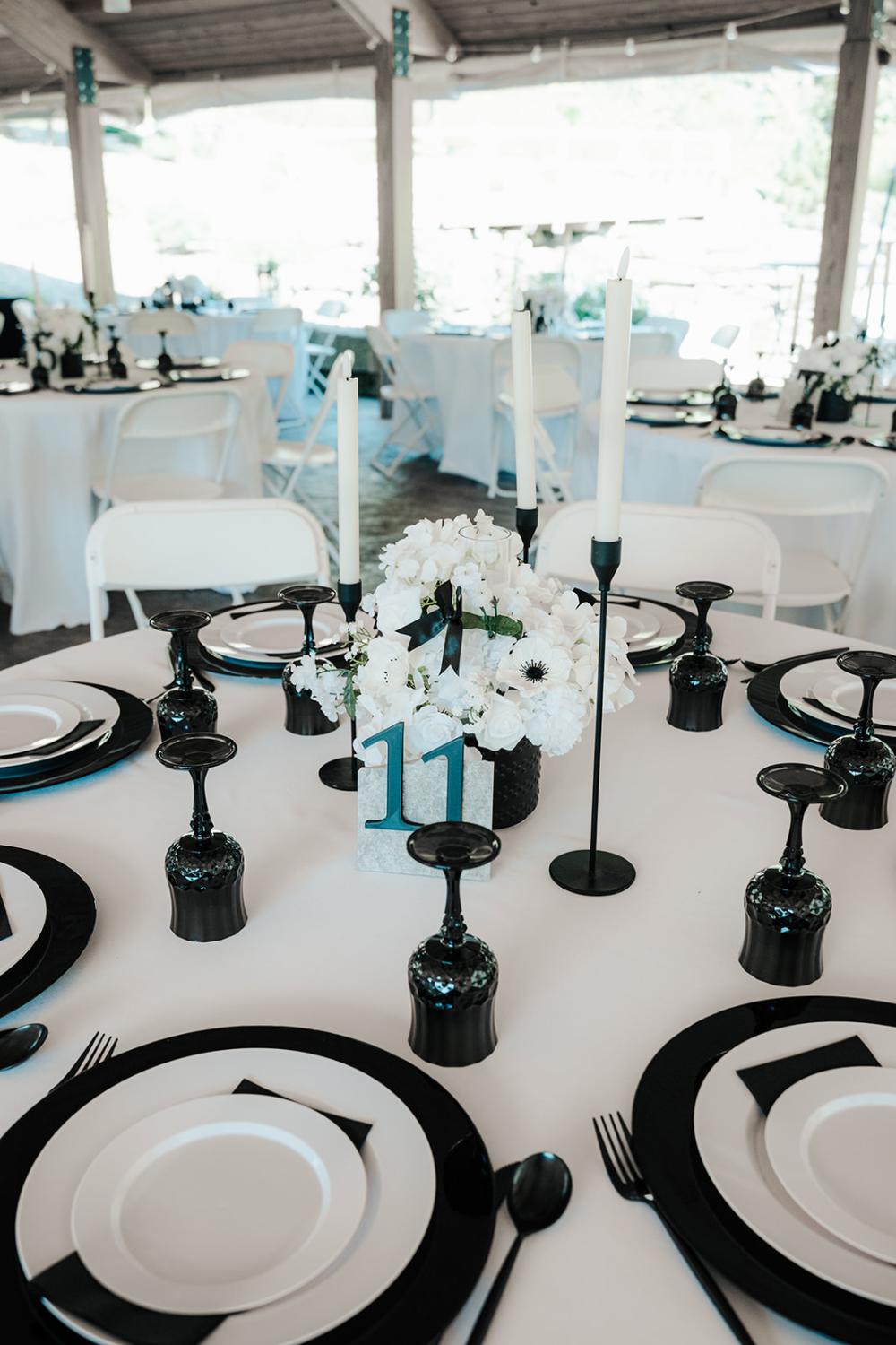 trying to find creative ways to make everything beautiful without overspending," Jillian shares. They wanted something that was timeless yet modern with an elegant air. Jillian and Josh settled on a black and white color scheme to let the natural greenery have the spotlight!