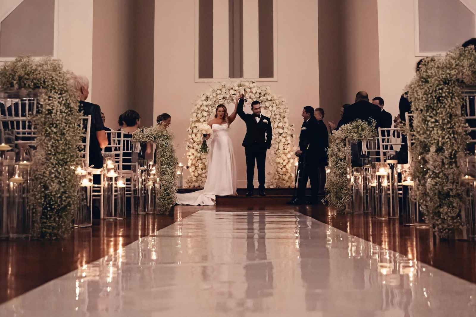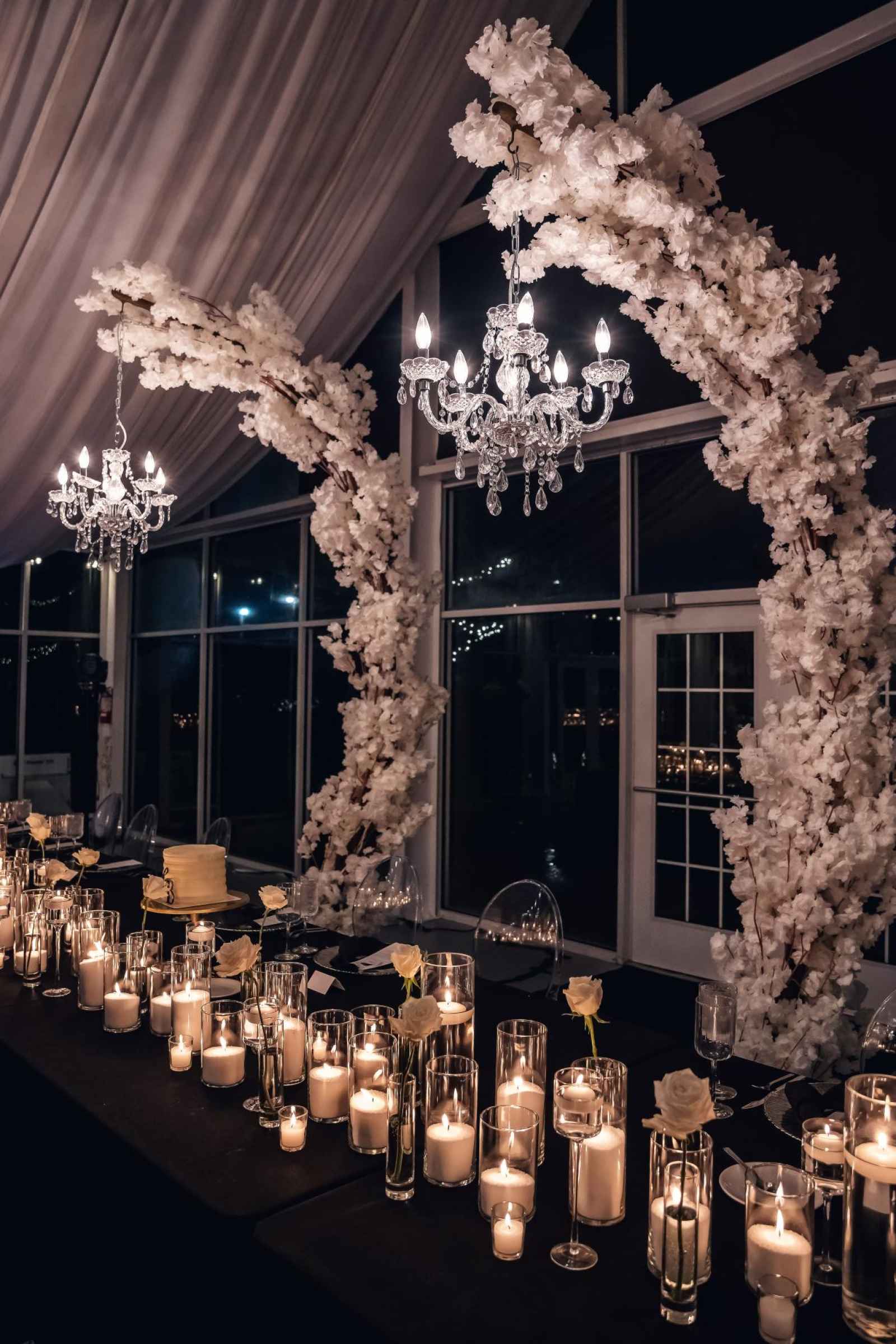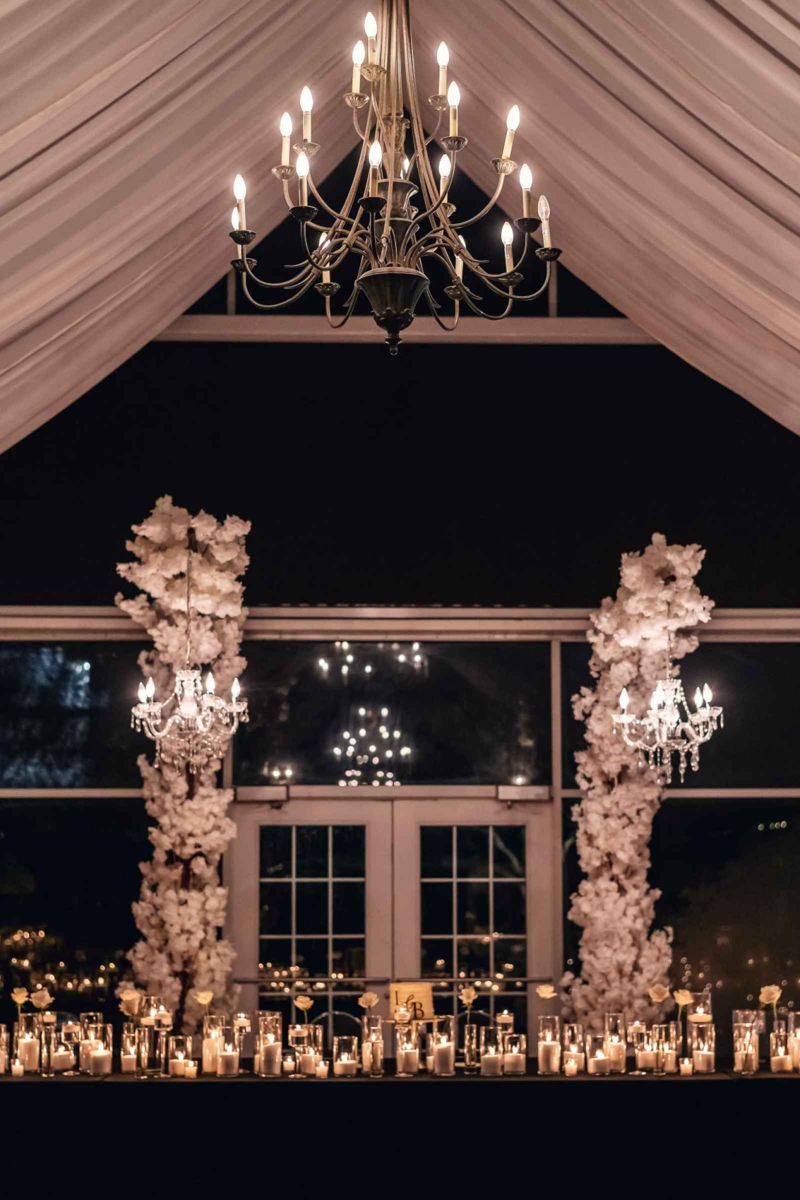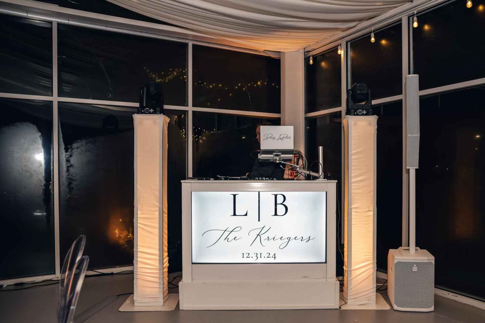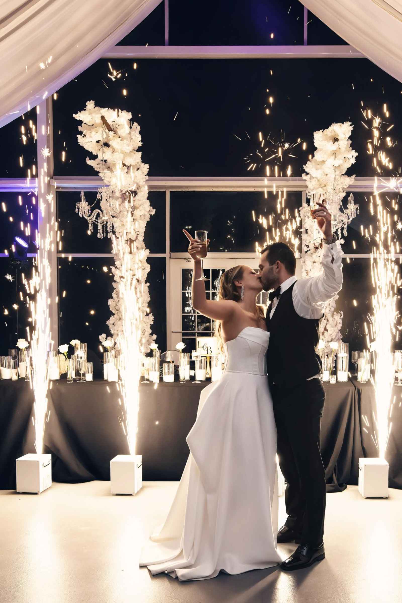 Flora and Flame brought Lauren and Brandon's entire vision to life! While Lauren initially inquired with them regarding their phone booth rental, they ended up providing florals, candles, stationery, signage, custom-built pieces and more. “Flora and Flame Design was one of those meant-to-be moments. While scrolling through New Year’s Eve wedding ideas, I came across a beautiful wedding at Ritz Charles from the year before,” Lauren shares. “After probably hours of Instagram sleuthing, I found Beth and reached out to rent the booth. After just one video chat, I knew she got me. She understood my vision immediately, and her energy was everything we were looking for.”