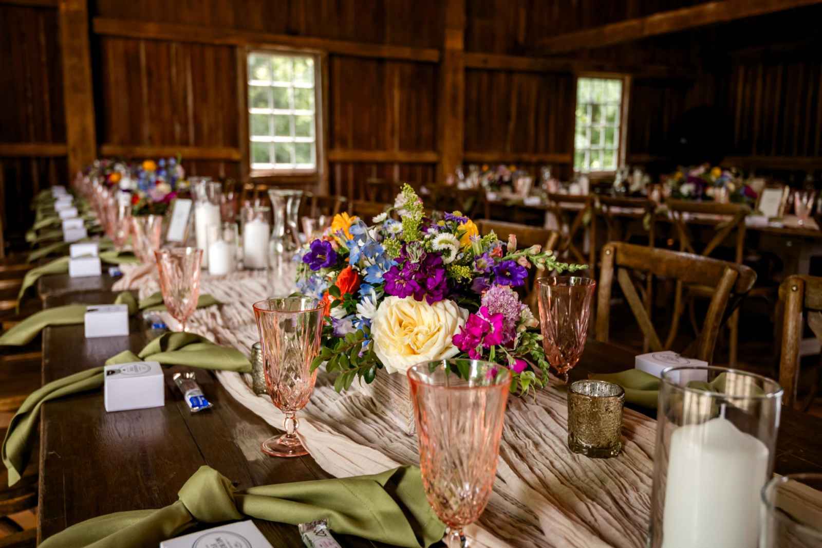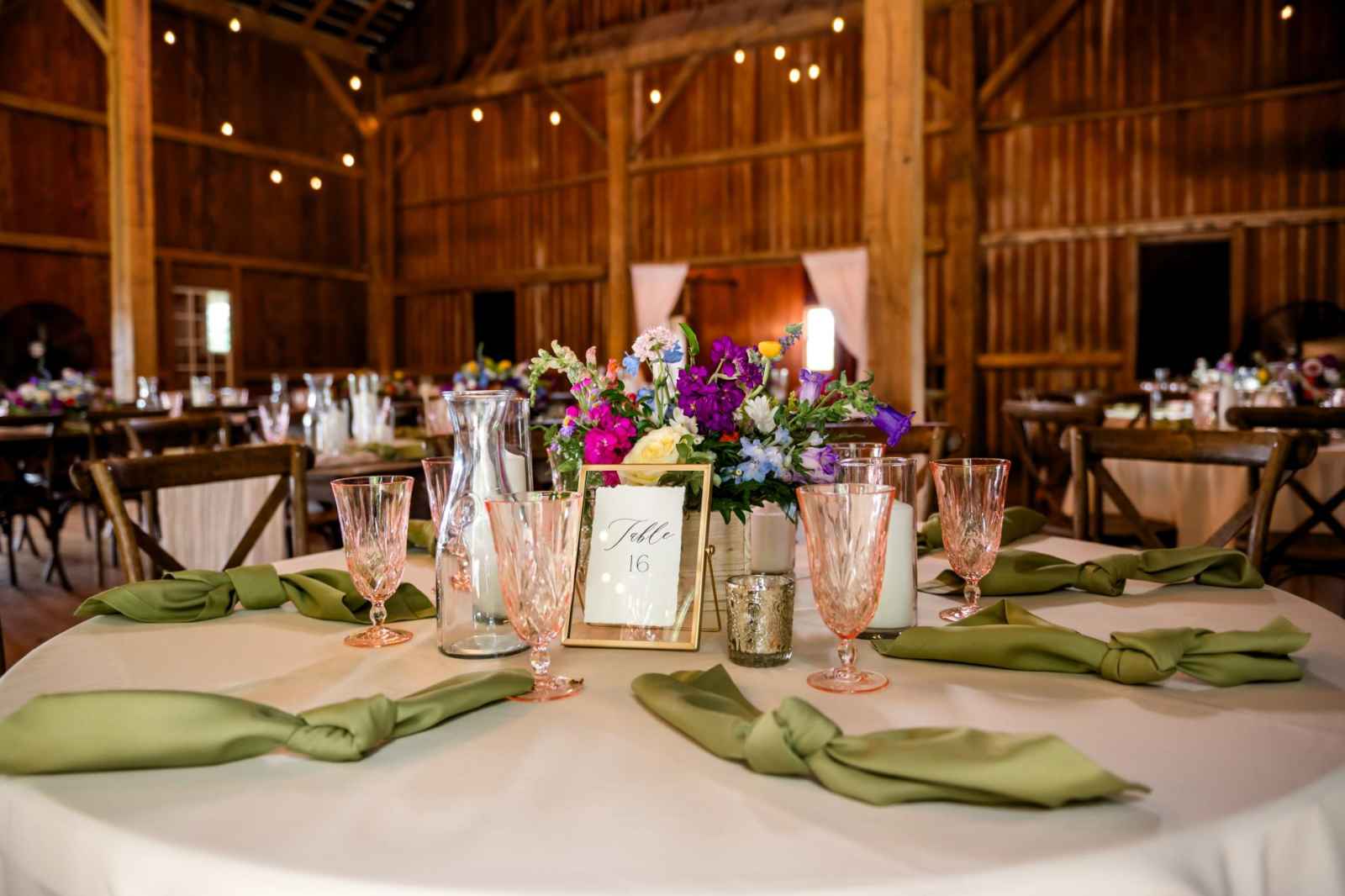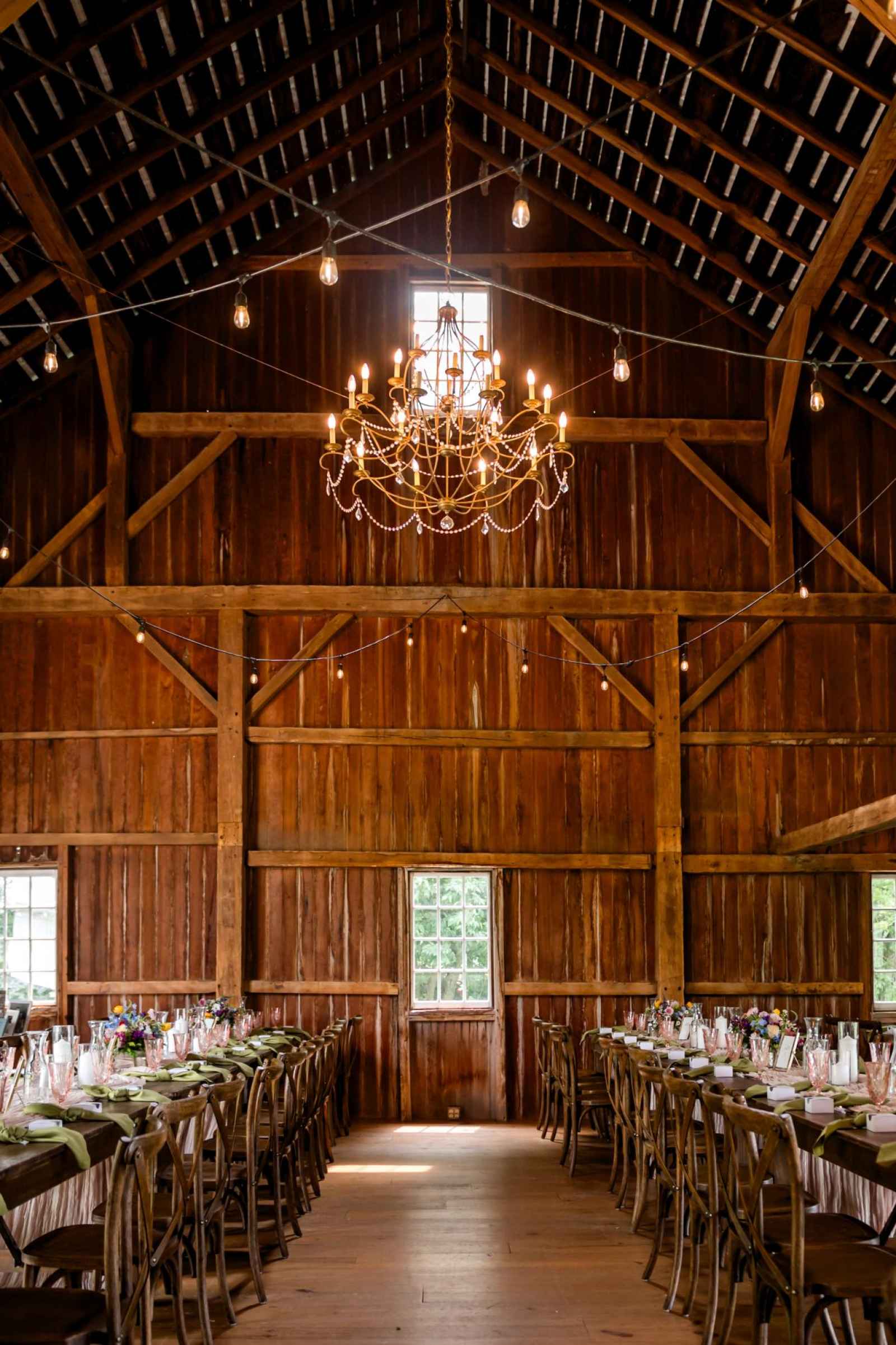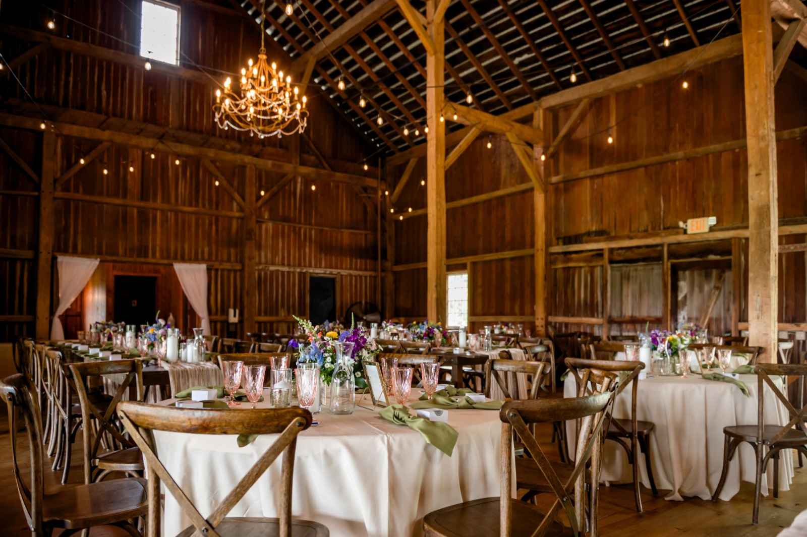 Krista and Phillip always wanted to be married in a barn. They ended up finding their ideal venue, which had the perfect balance between rustic chic and quiet elegance. The flowers are what helped Krista decide on the color palette. Looking at their venue, she saw so many natural elements and knew wildflowers were the right choice. Their bright colors stood out beautifully against the natural wood details and the refined white elements. Krista even had her bridesmaids wear colors close to white so that the flowers popped even more! The venue already had a lot of natural beauty with the vineyard and pond on the property, so Krista and Phillip didn’t have to do much to make the space shine! The rentals from AAYS Event Rentals enhanced this already beautiful space perfectly.