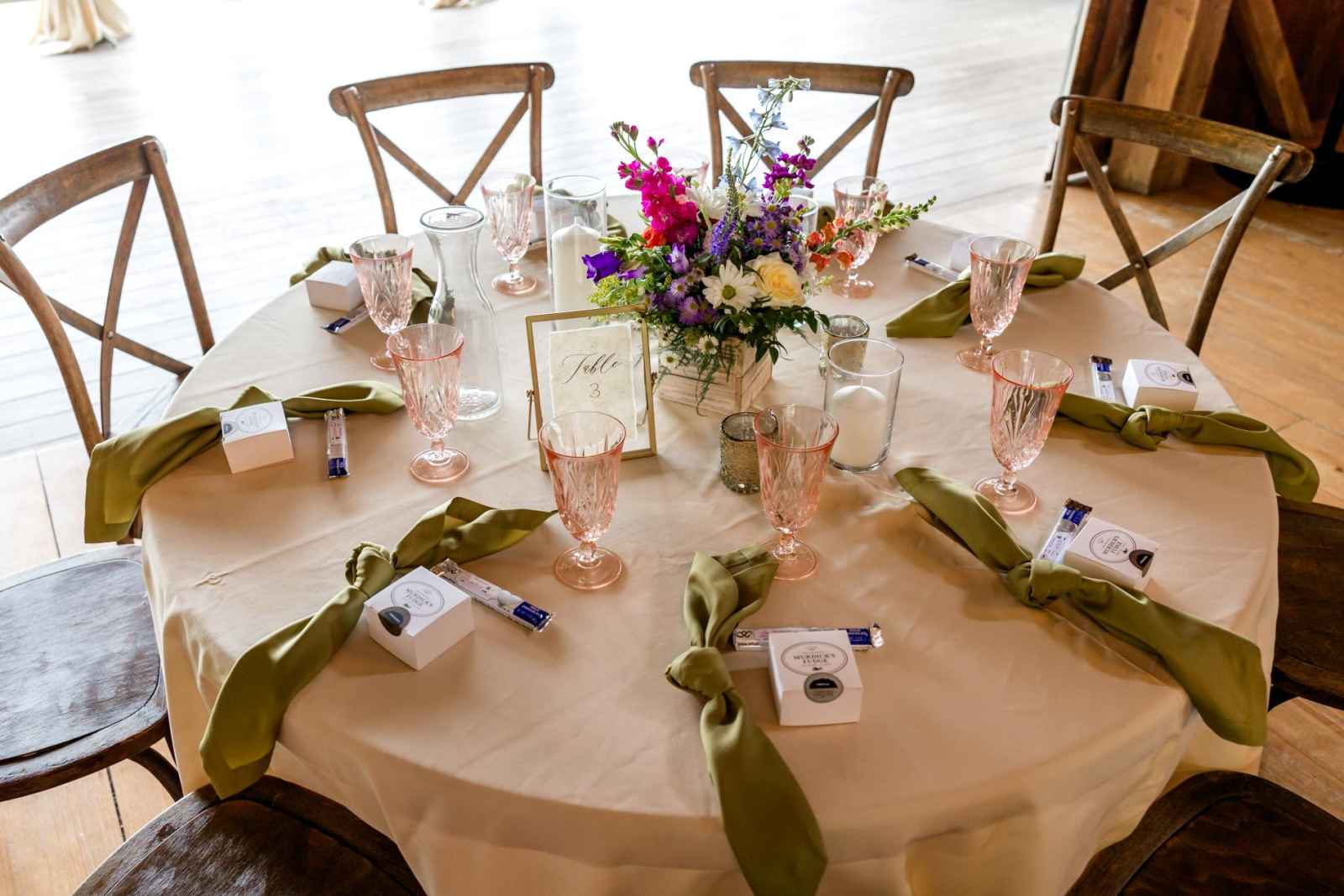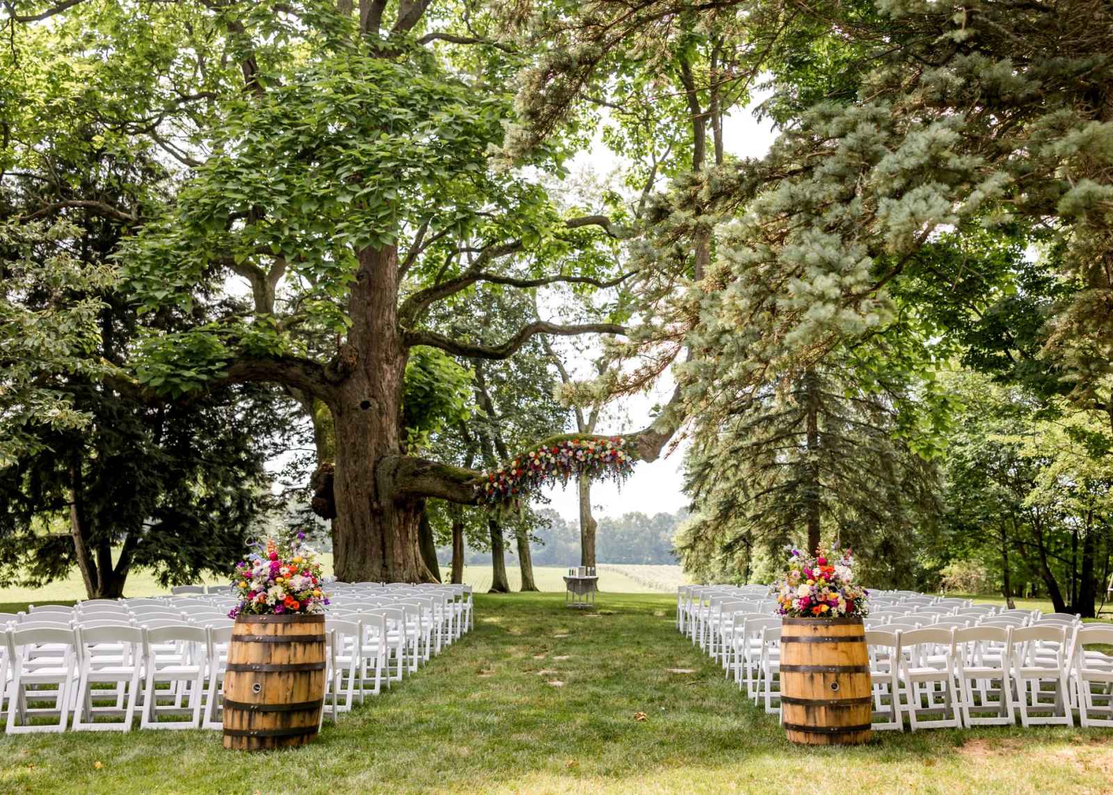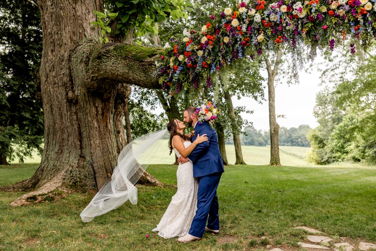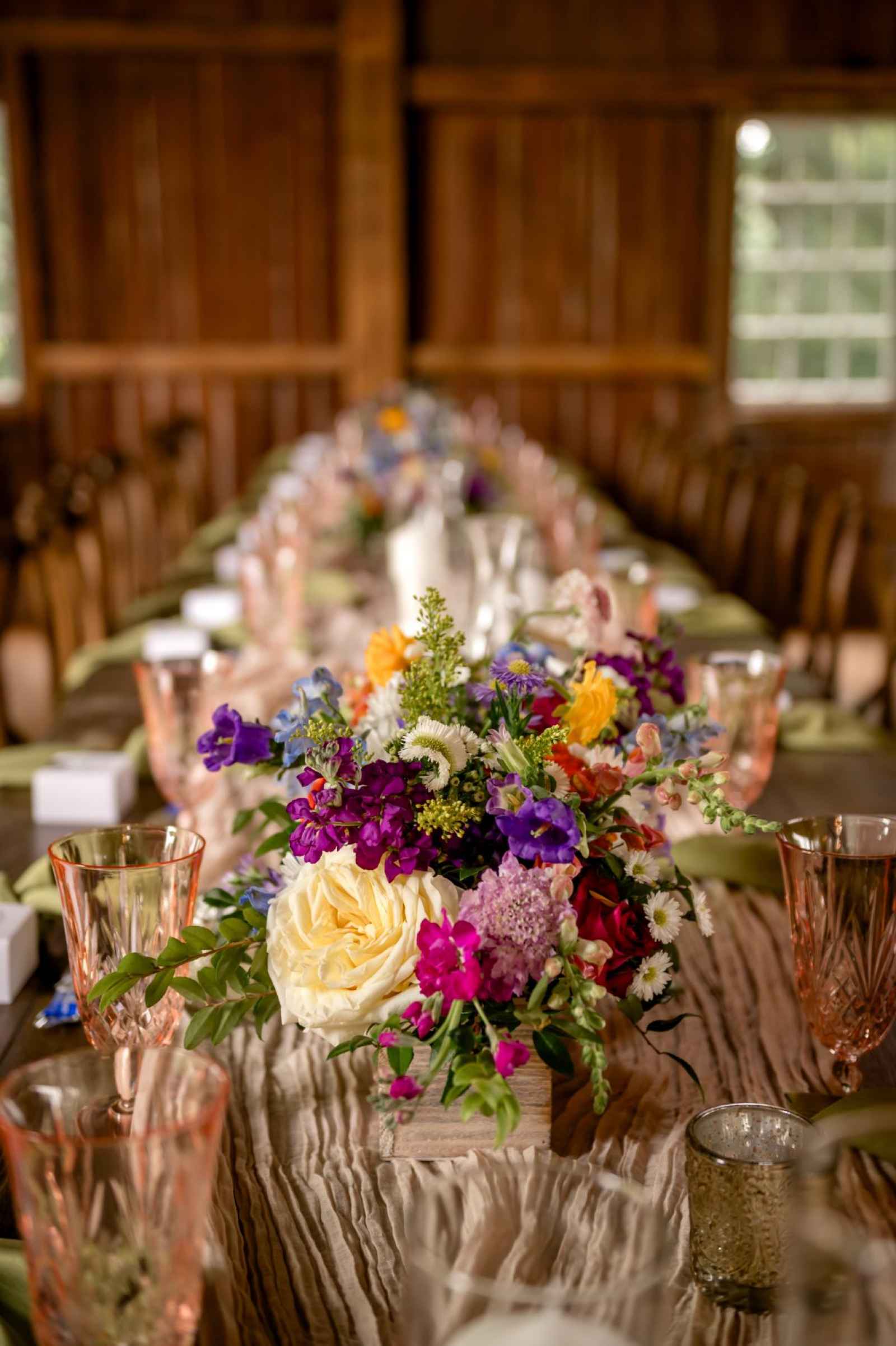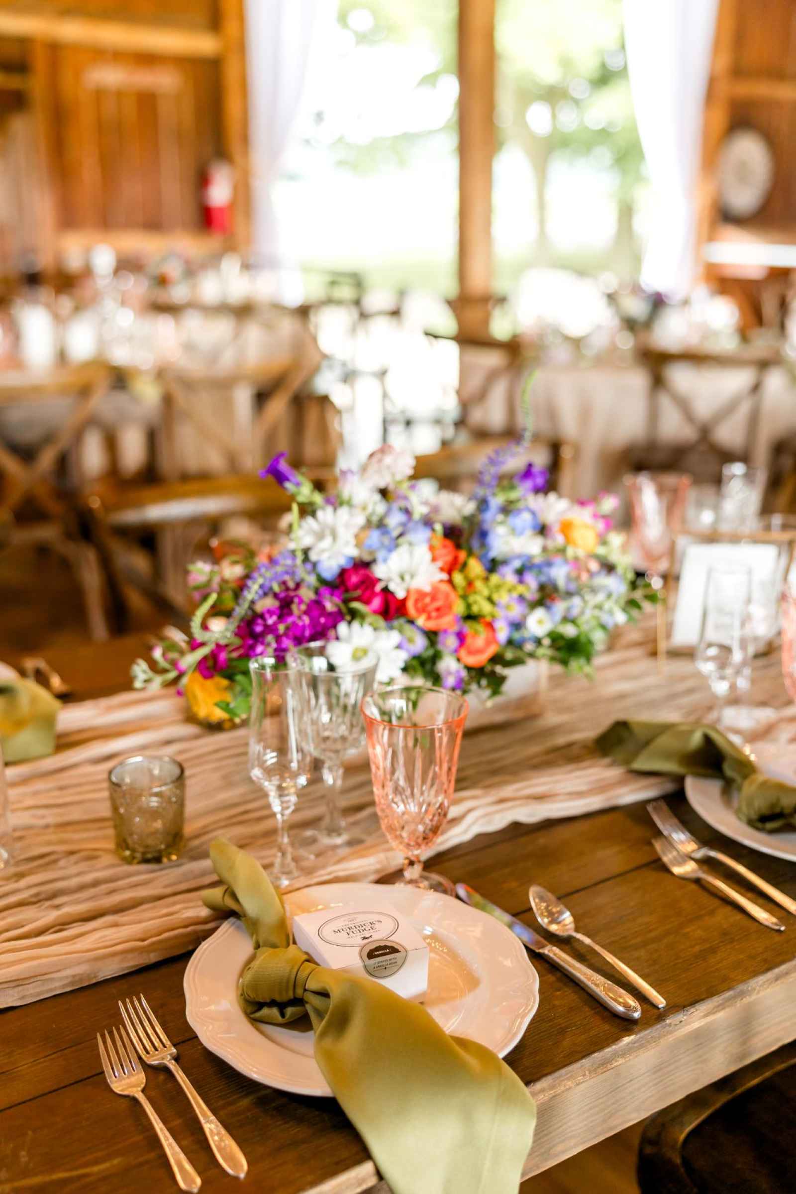 Krista and Phillip always wanted to be married in a barn. They ended up finding their ideal venue, which had the perfect balance between rustic chic and quiet elegance. The flowers are what helped Krista decide on the color palette. Looking at their venue, she saw so many natural elements and knew wildflowers were the right choice. Their bright colors stood out beautifully against the natural wood details and the refined white elements. Krista even had her bridesmaids wear colors close to white so that the flowers popped even more! The venue already had a lot of natural beauty with the vineyard and pond on the property, so Krista and Phillip didn’t have to do much to make the space shine! The rentals from AAYS Event Rentals enhanced this already beautiful space perfectly.