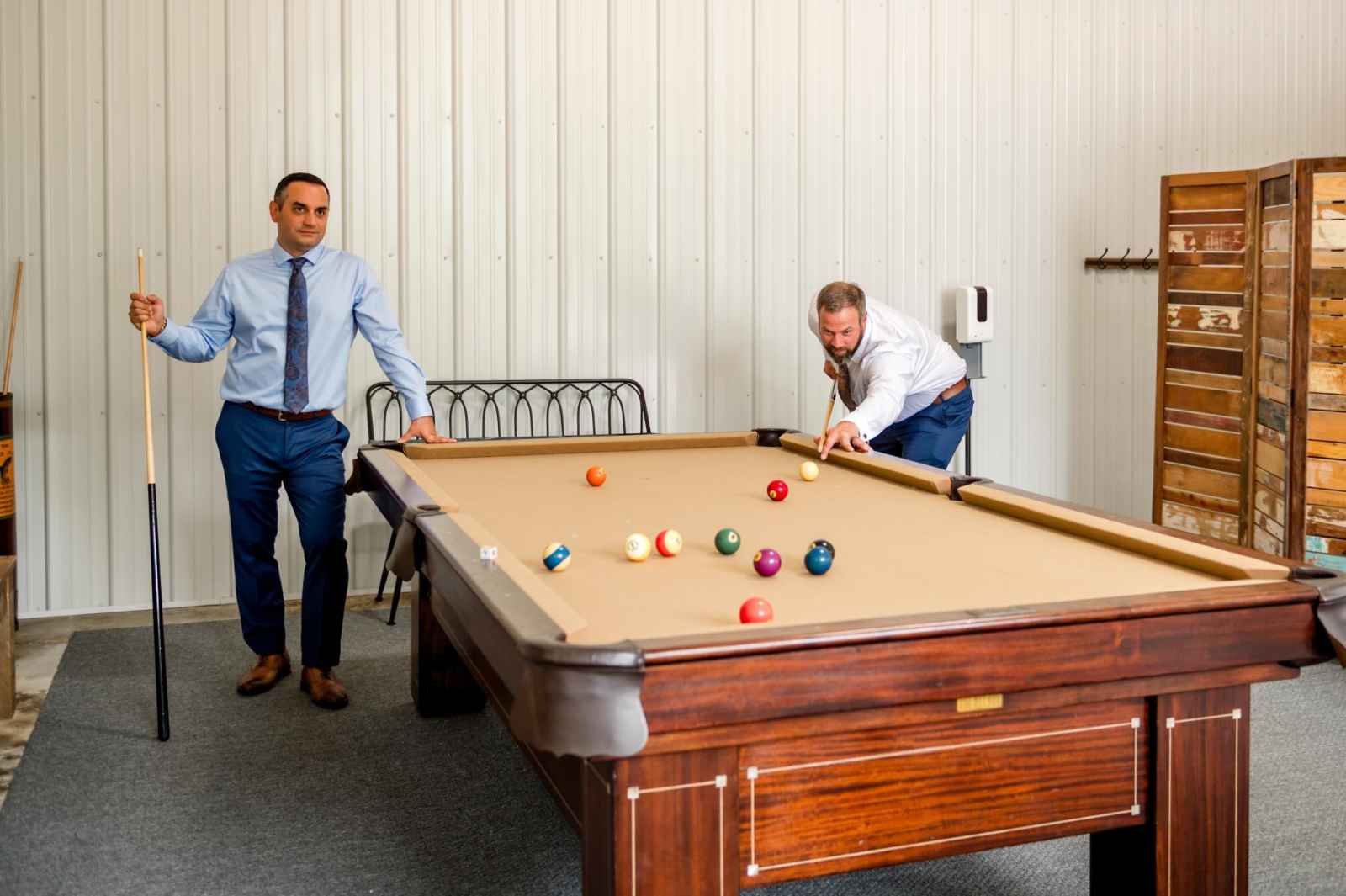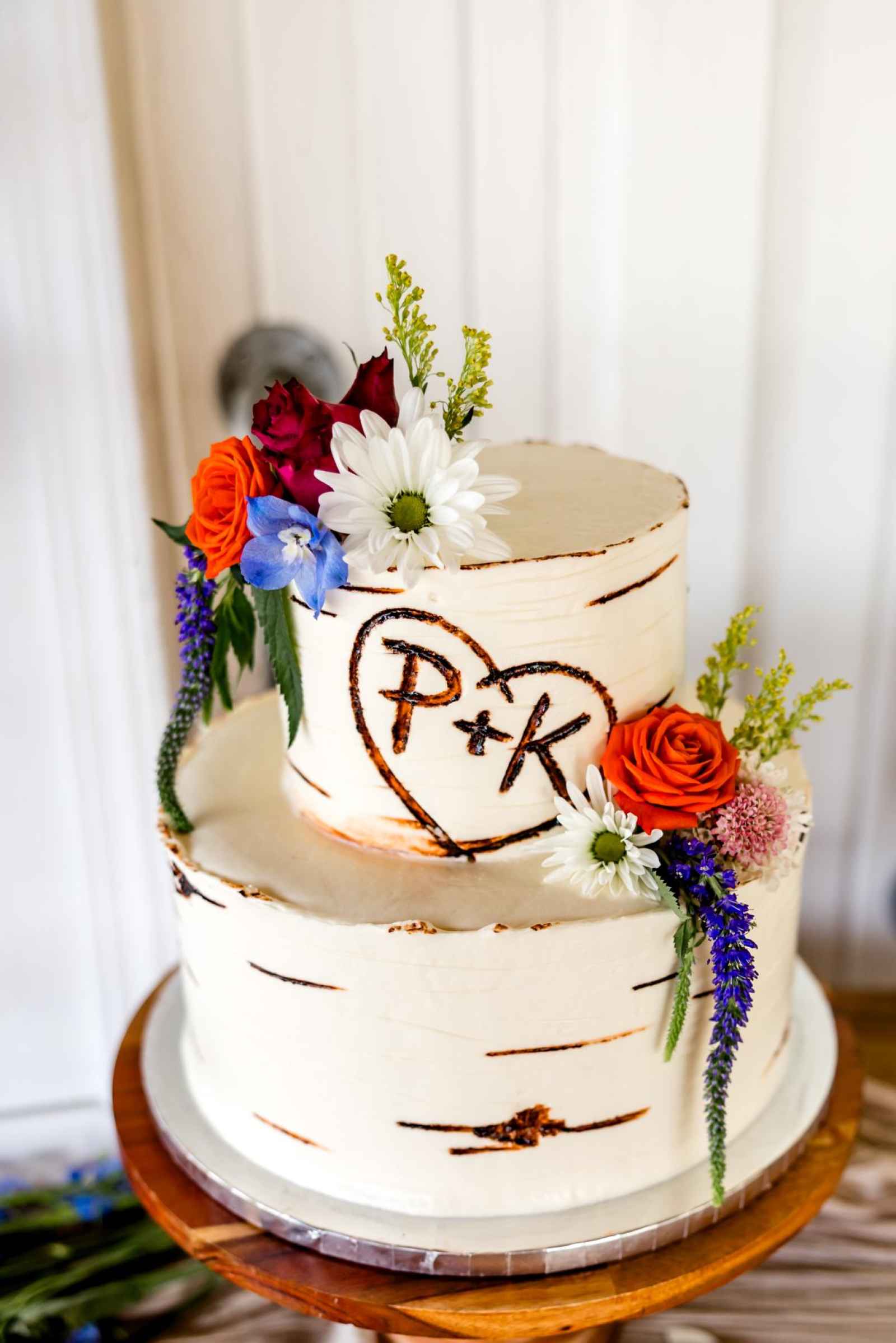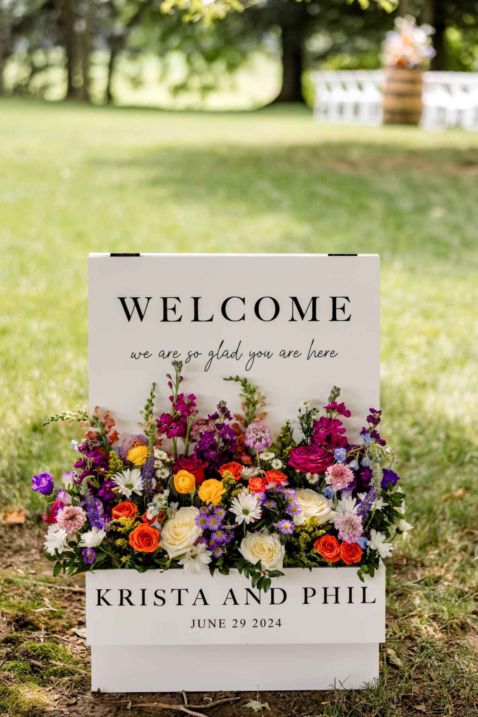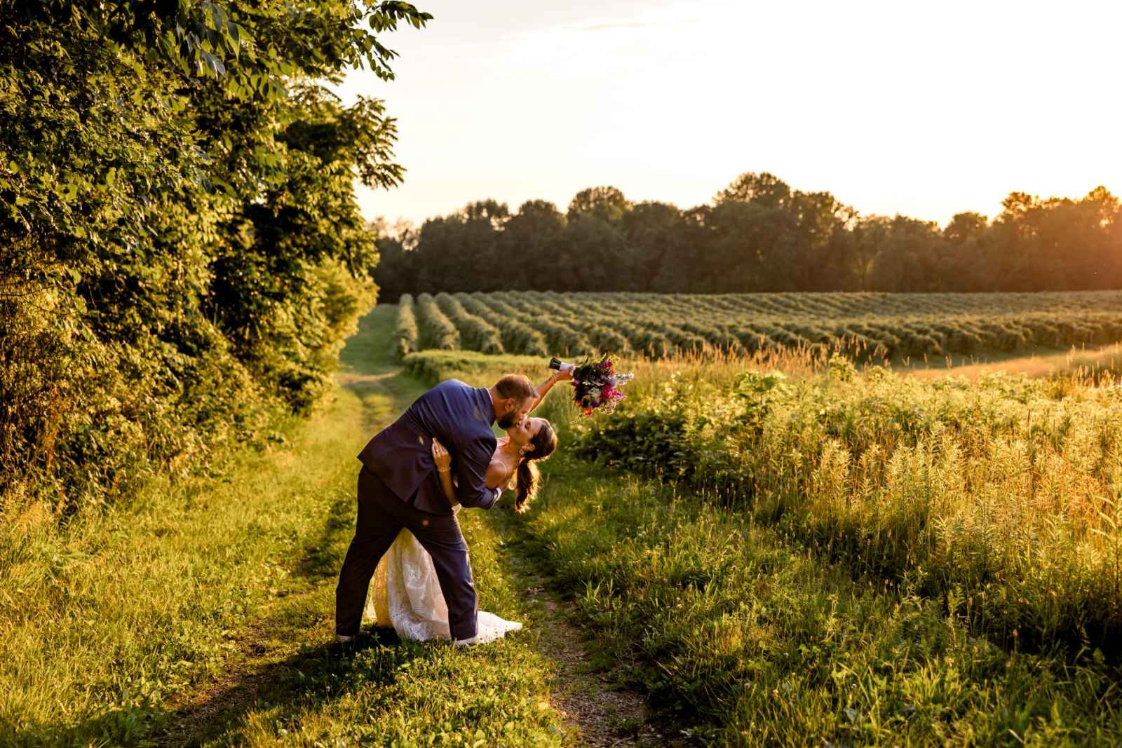 Krista and Phillip always wanted to be married in a barn. They ended up finding their ideal venue, which had the perfect balance between rustic chic and quiet elegance. The flowers are what helped Krista decide on the color palette. Looking at their venue, she saw so many natural elements and knew wildflowers were the right choice. Their bright colors stood out beautifully against the natural wood details and the refined white elements. Krista even had her bridesmaids wear colors close to white so that the flowers popped even more! The venue already had a lot of natural beauty with the vineyard and pond on the property, so Krista and Phillip didn’t have to do much to make the space shine! The rentals from AAYS Event Rentals enhanced this already beautiful space perfectly.