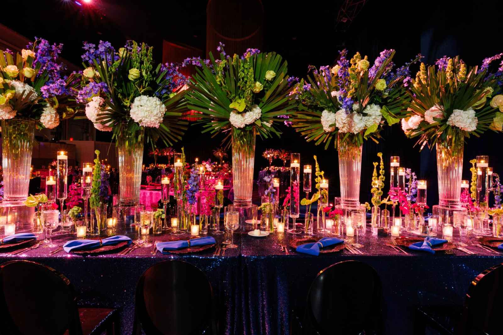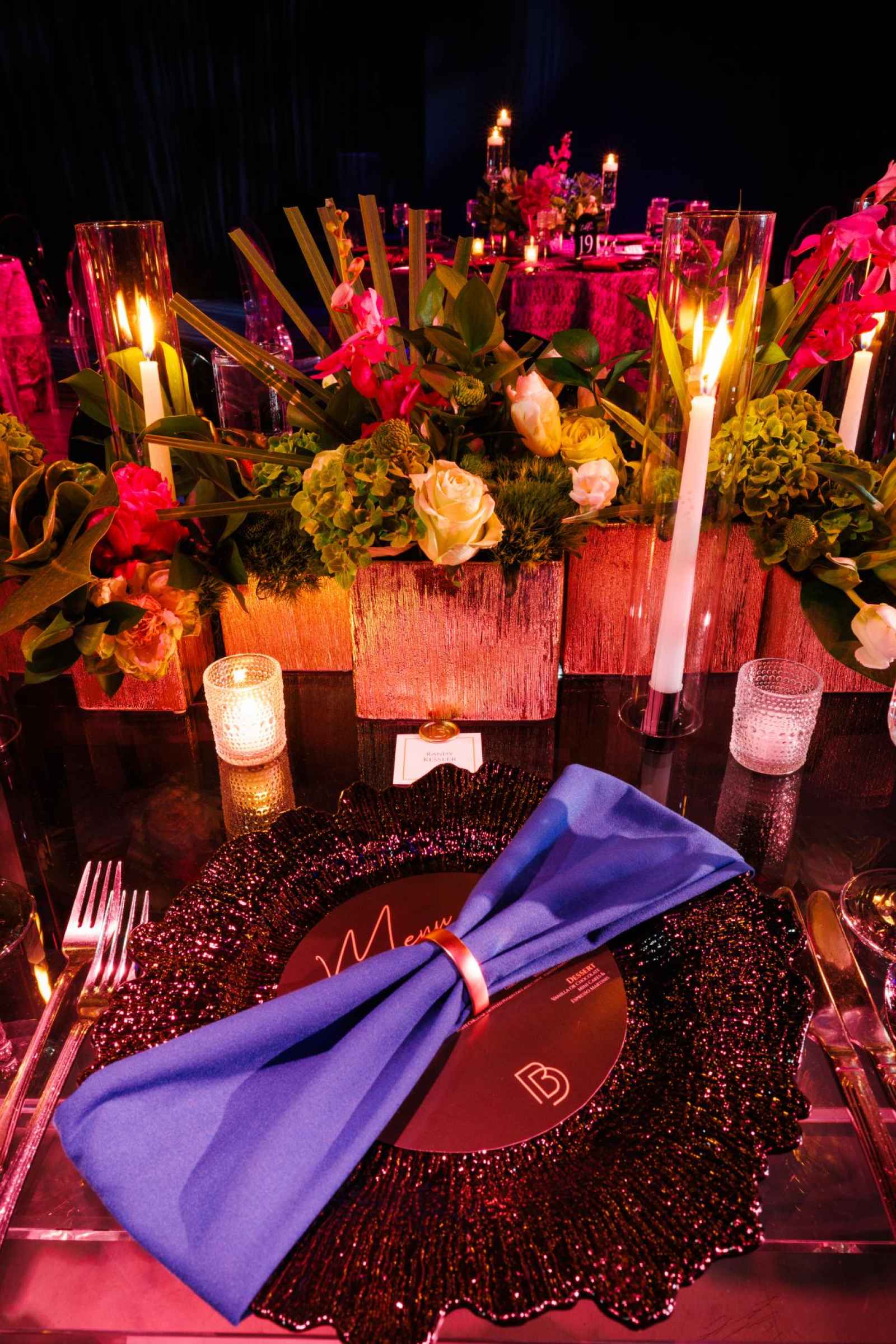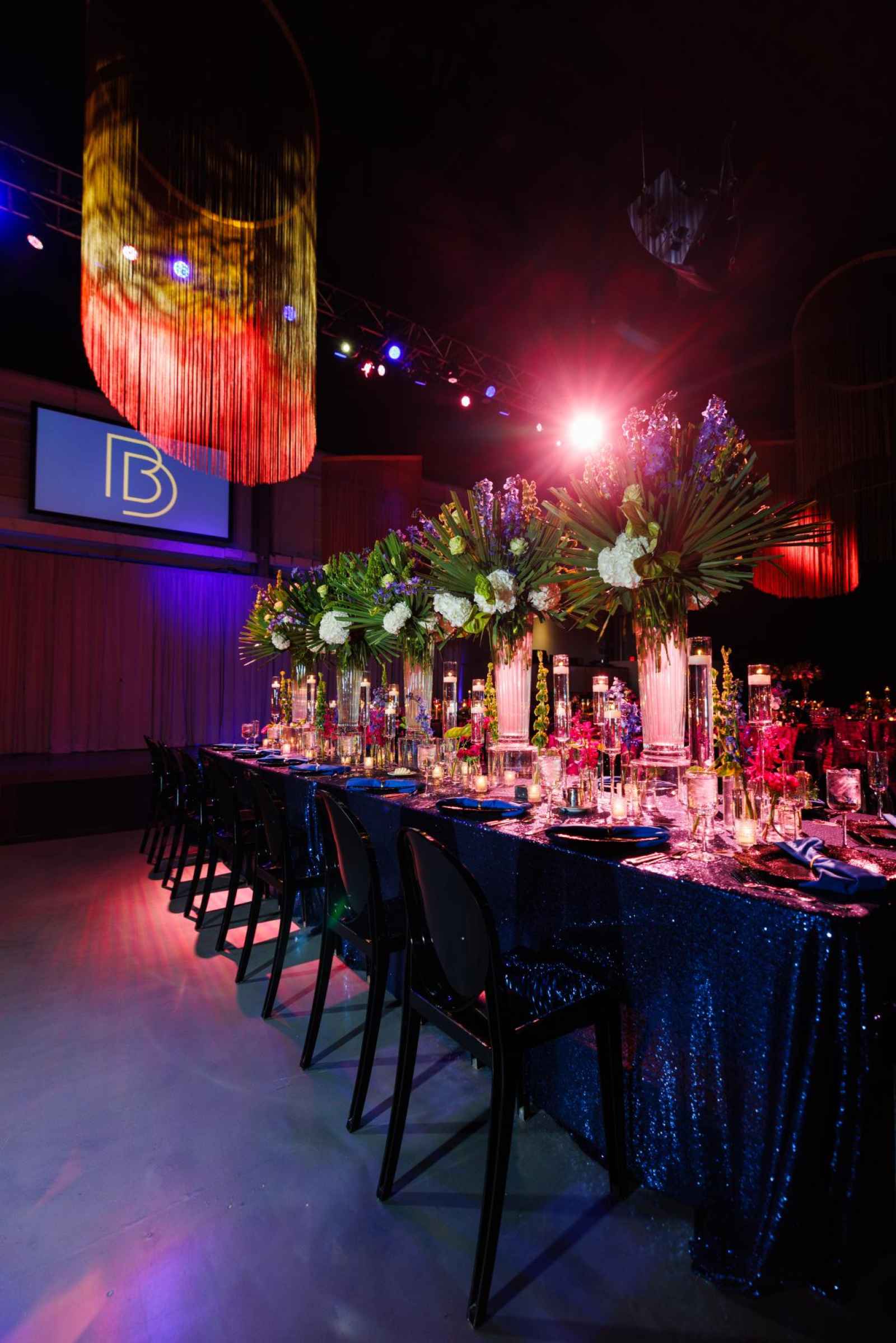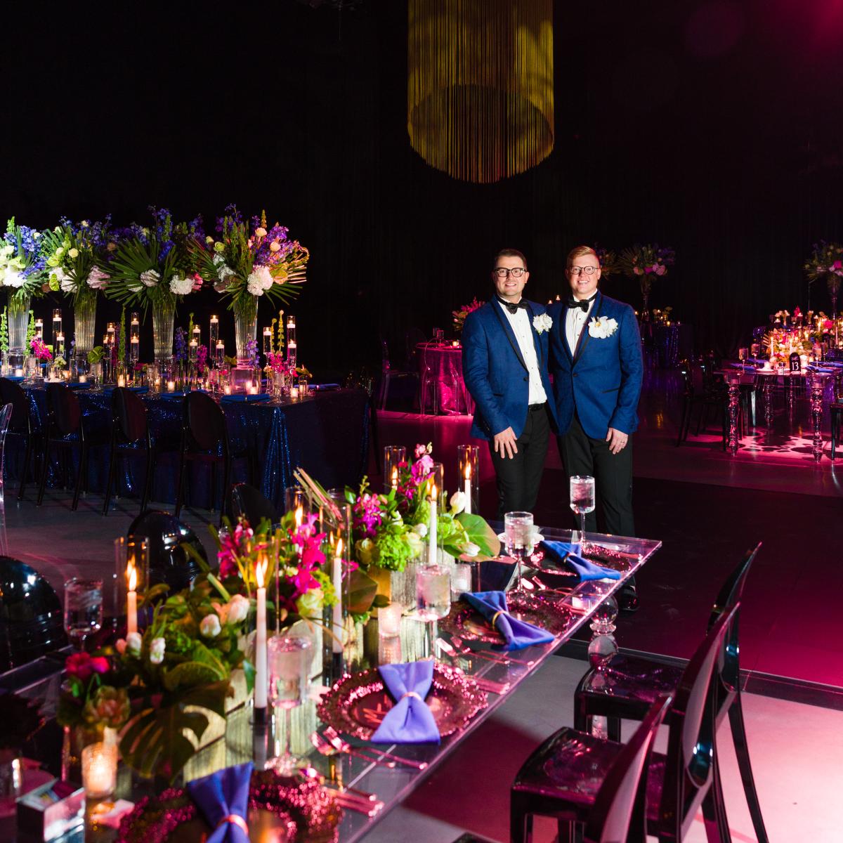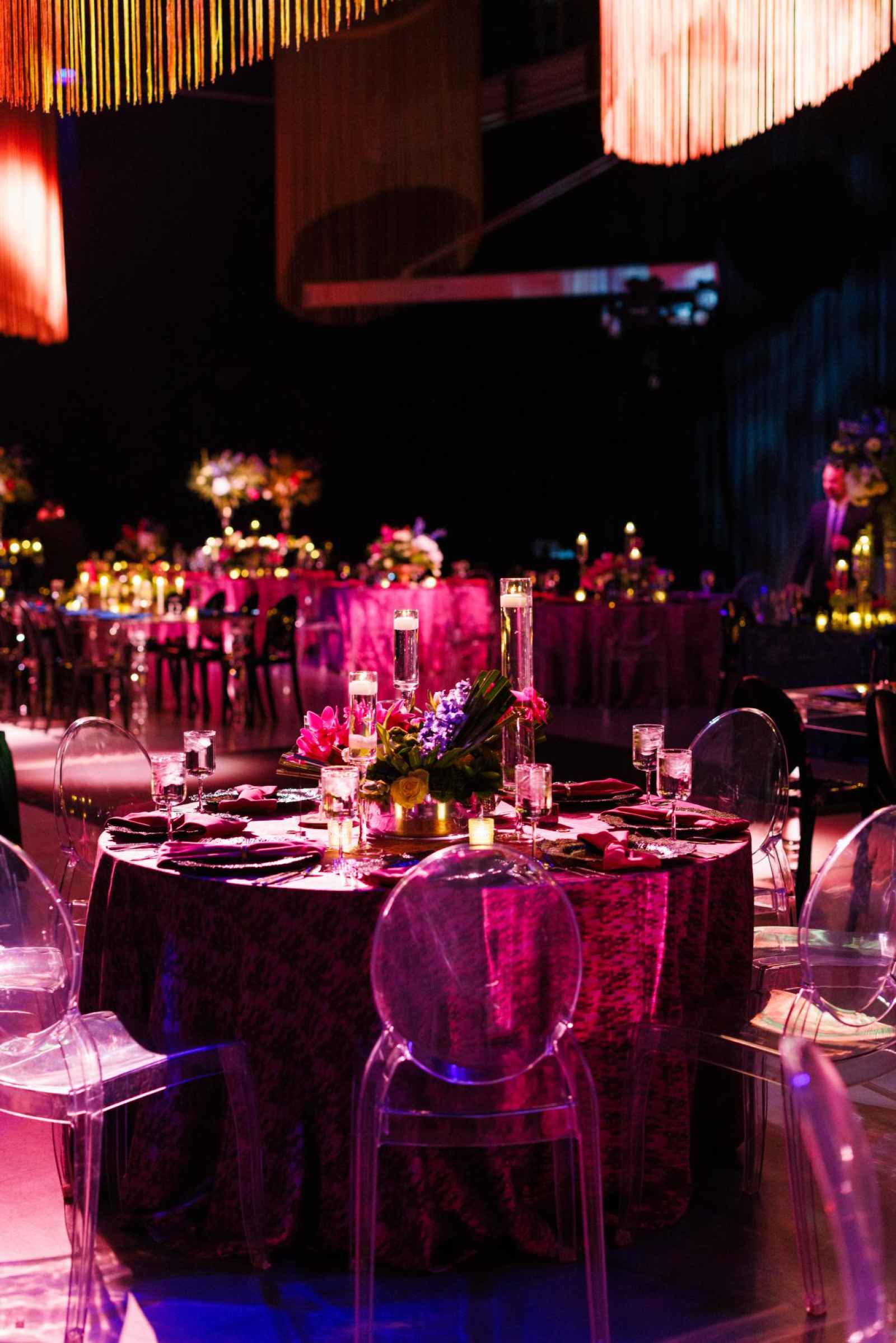 Just like their personalities, Blake and Drew wanted to honor traditional and classic themes while putting their own modern twist on it. There were two things they absolutely wanted for their wedding. One was to bring together everyone they love to celebrate their union. The second was to have a seamless transition from their elegant ceremony to the all-out party that they wanted afterward. “Bold fuchsias, bright greens and electric blues showed up throughout the florals and table linens, creating a lush, high-energy palette. We brought in clear and black ghost chairs and sleek acrylic tables to give the space a modern edge, and added soft seating with large palm trees and uplighting to evoke a playful, intimate vibe,” Blake and Drew share. Burns Special Events was one of the rental companies that helped them pull it all together!