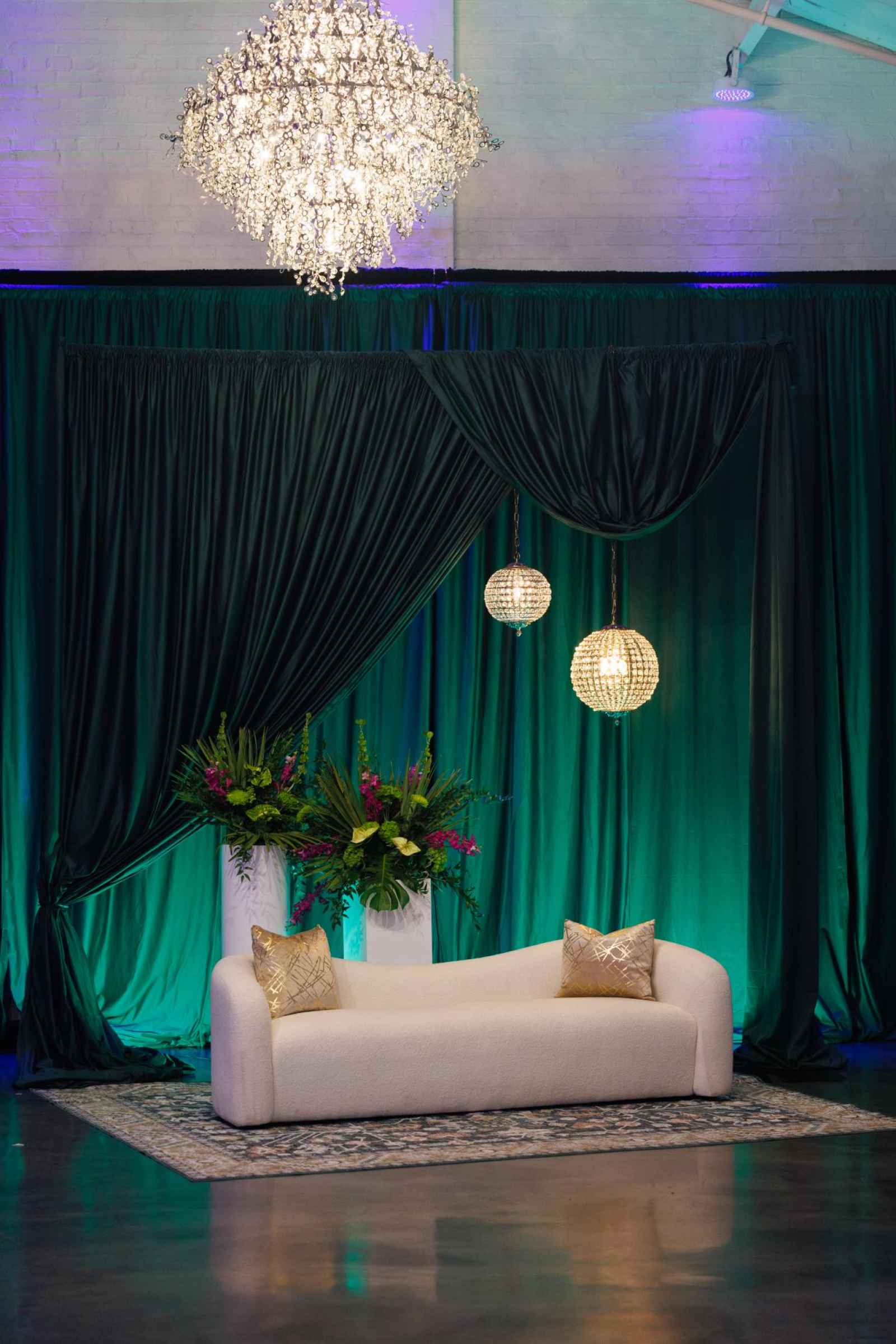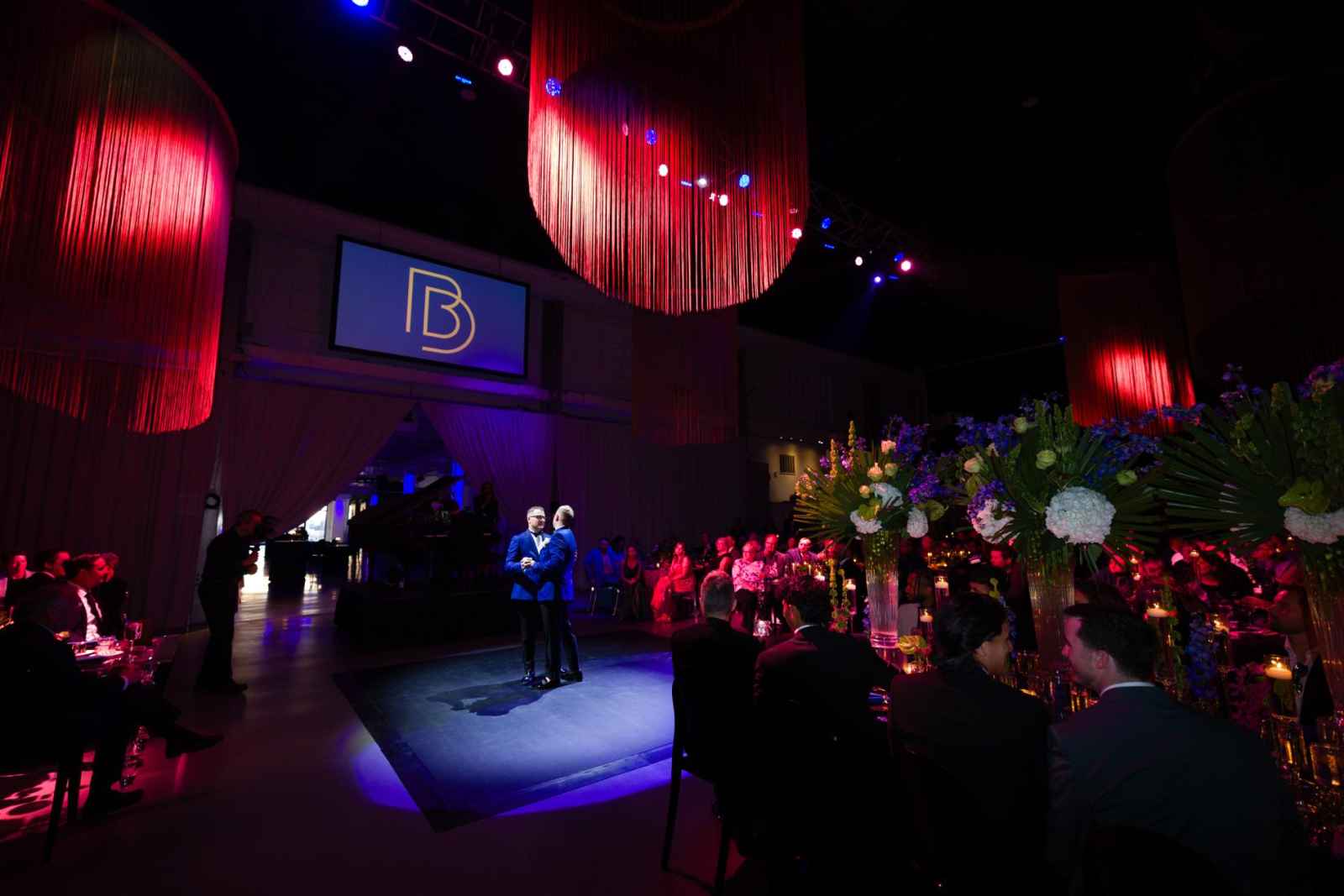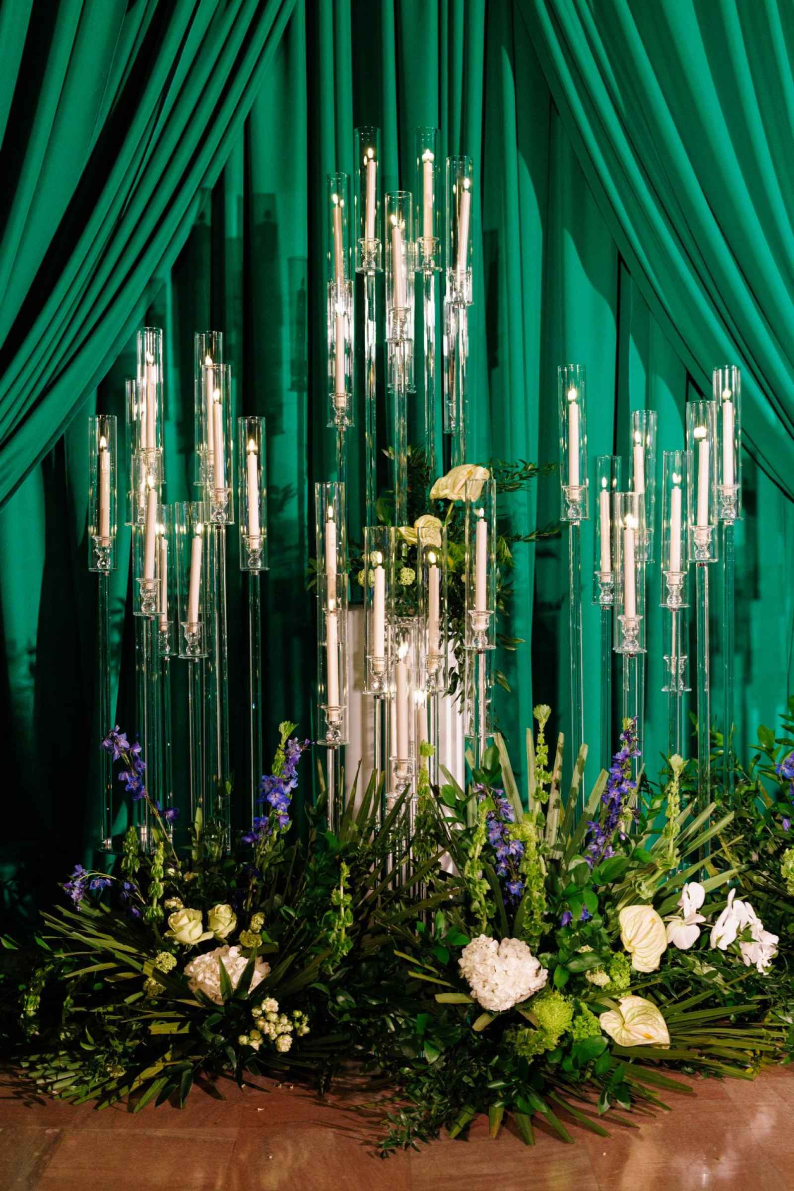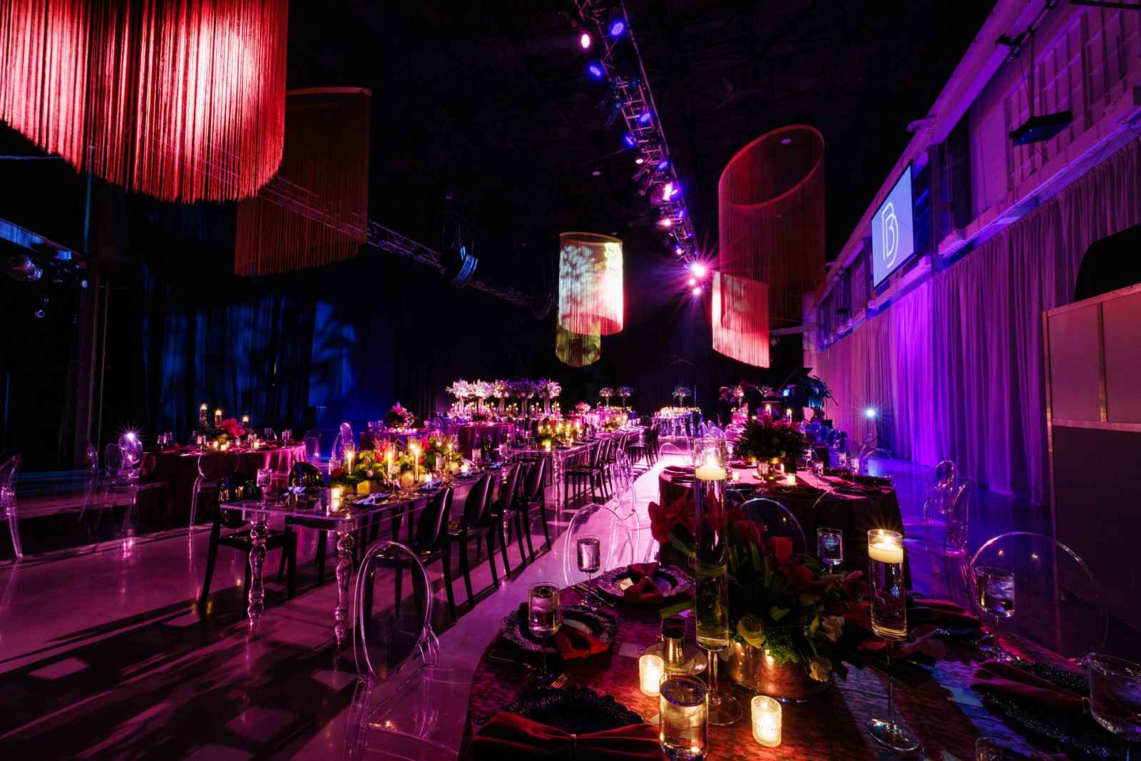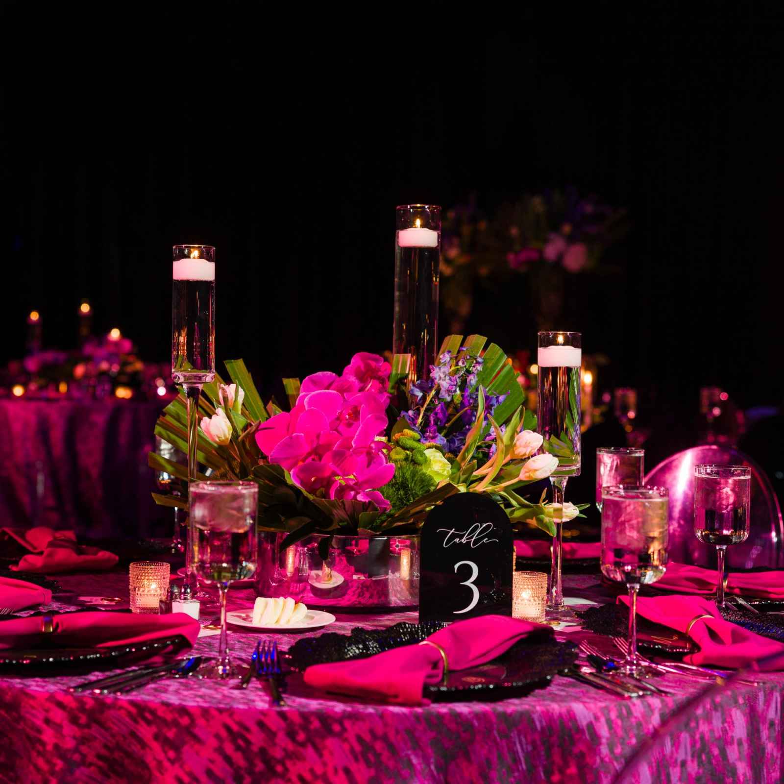 Just like their personalities, Blake and Drew wanted to honor traditional and classic themes while putting their own modern twist on it. There were two things they absolutely wanted for their wedding. One was to bring together everyone they love to celebrate their union. The second was to have a seamless transition from their elegant ceremony to the all-out party that they wanted afterward. “Bold fuchsias, bright greens and electric blues showed up throughout the florals and table linens, creating a lush, high-energy palette. We brought in clear and black ghost chairs and sleek acrylic tables to give the space a modern edge, and added soft seating with large palm trees and uplighting to evoke a playful, intimate vibe,” Blake and Drew share. Burns Special Events was one of the rental companies that helped them pull it all together!