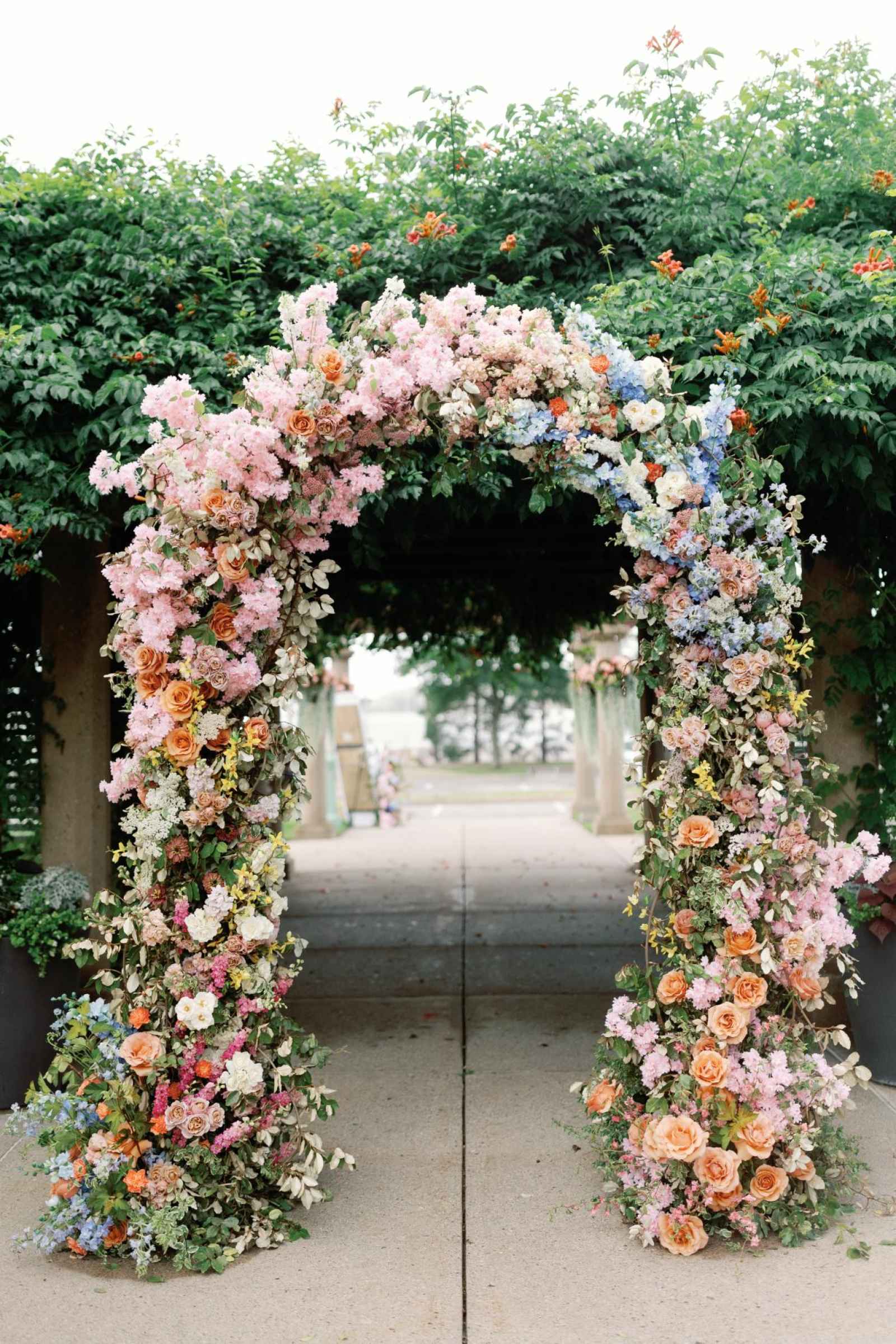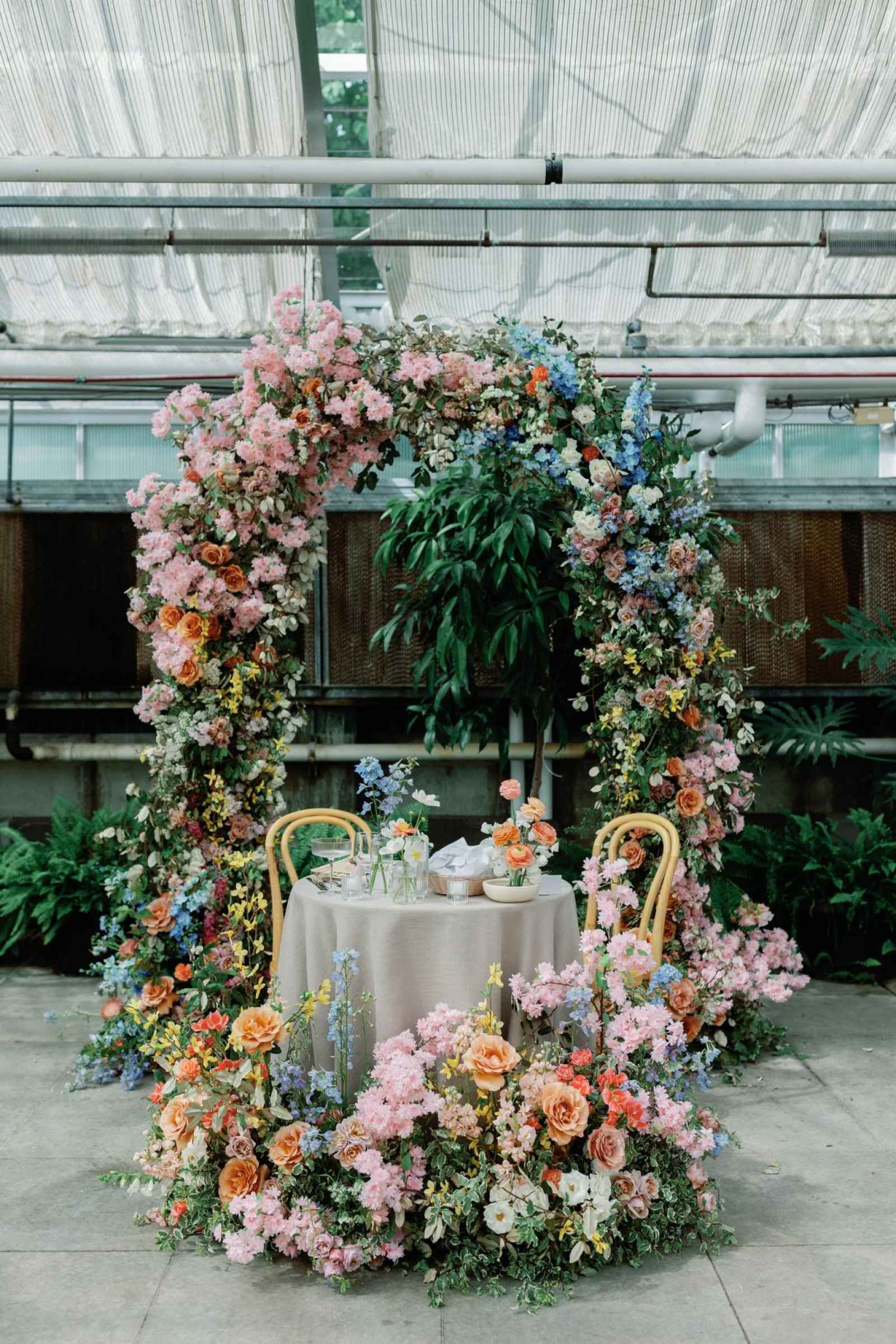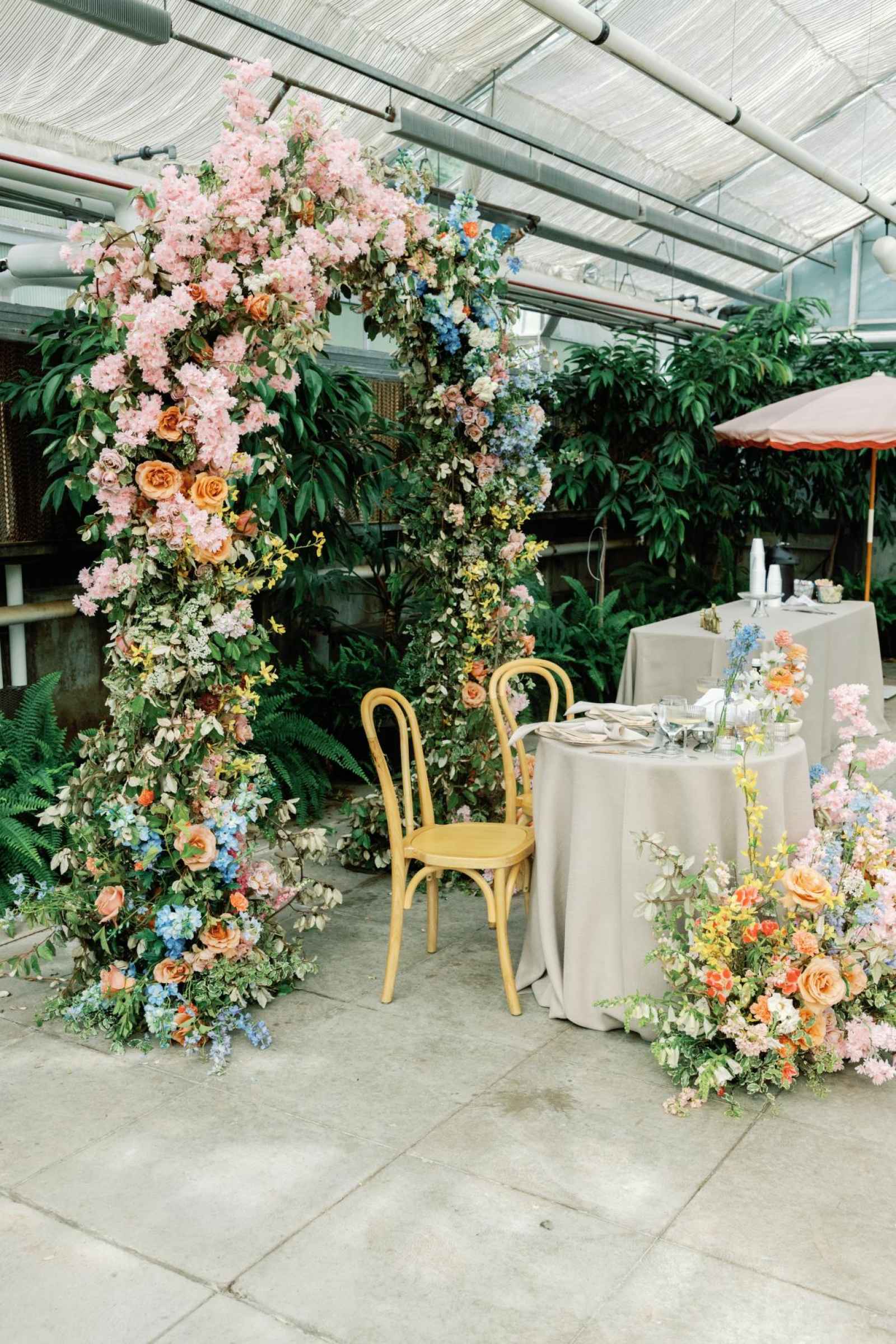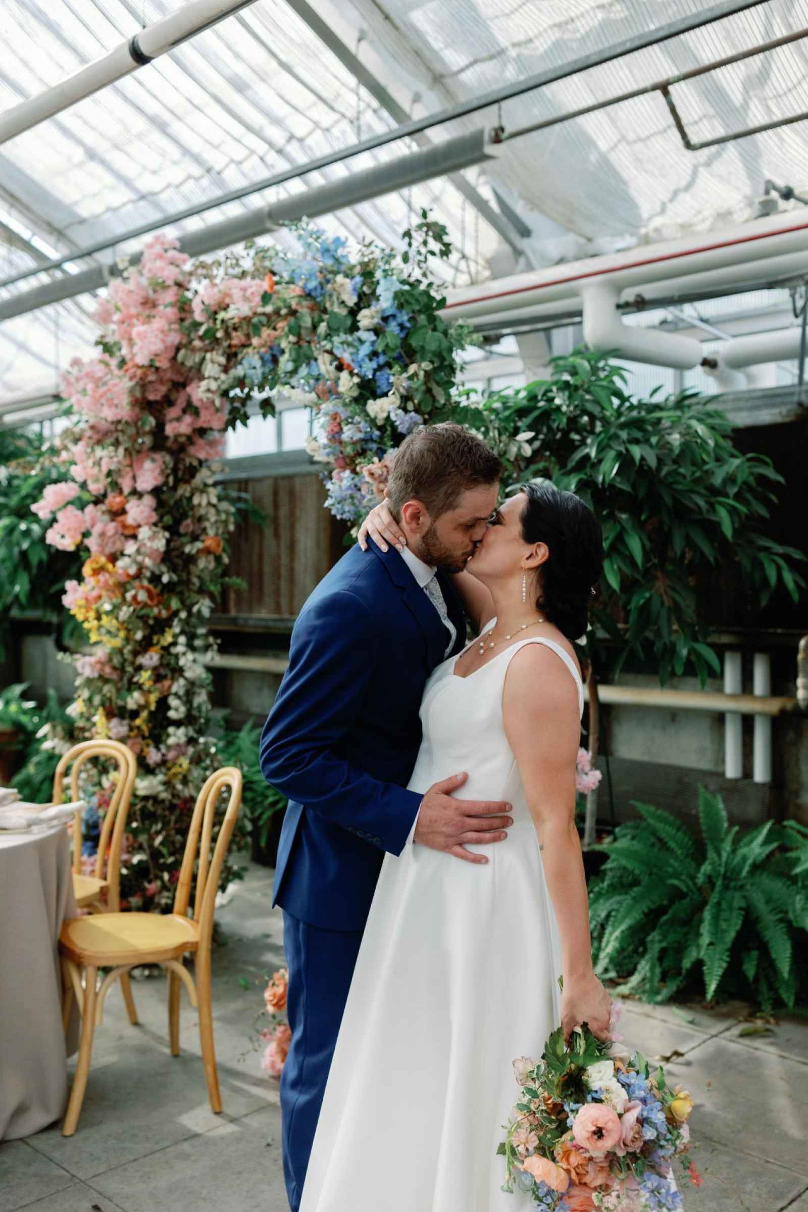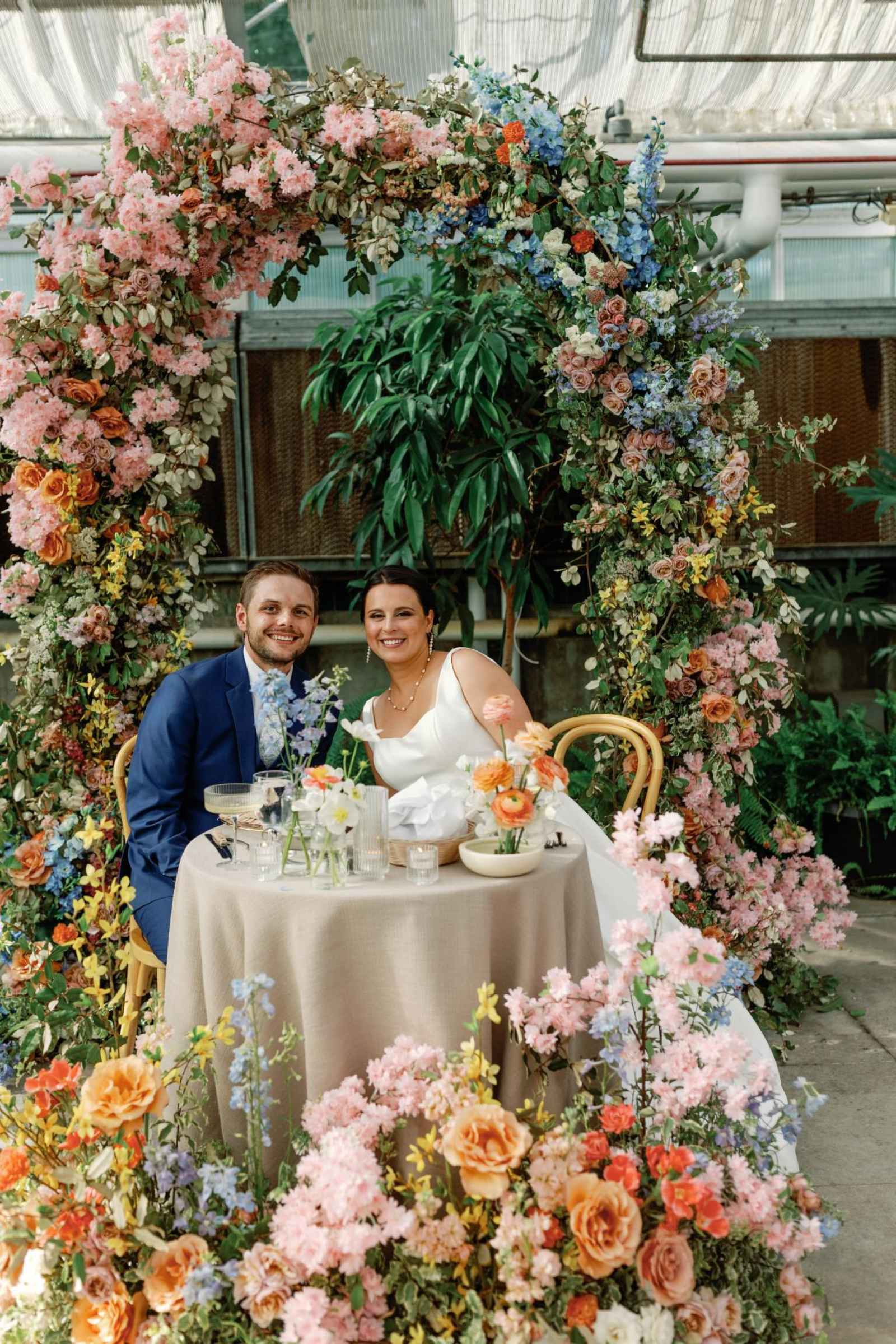 Kim and Michael’s wedding was a vibrant, romantic garden celebration brought to life by the venue’s natural charm, colorful blooms and the couple’s love of the outdoors. Drawn to the lush grounds, open spaces and the unique opportunity to host their reception in a greenhouse, they designed a day that felt whimsical, elegant and joyfully alive. One of the most unforgettable touches was their stunning floral arch (an early non-negotiable!) that All Grand Events + Floral transformed into a showstopping masterpiece. After framing their ceremony, it was moved behind their sweetheart table, becoming the breathtaking centerpiece of their reception and a detail Kim still adores every time she looks back at the photos.