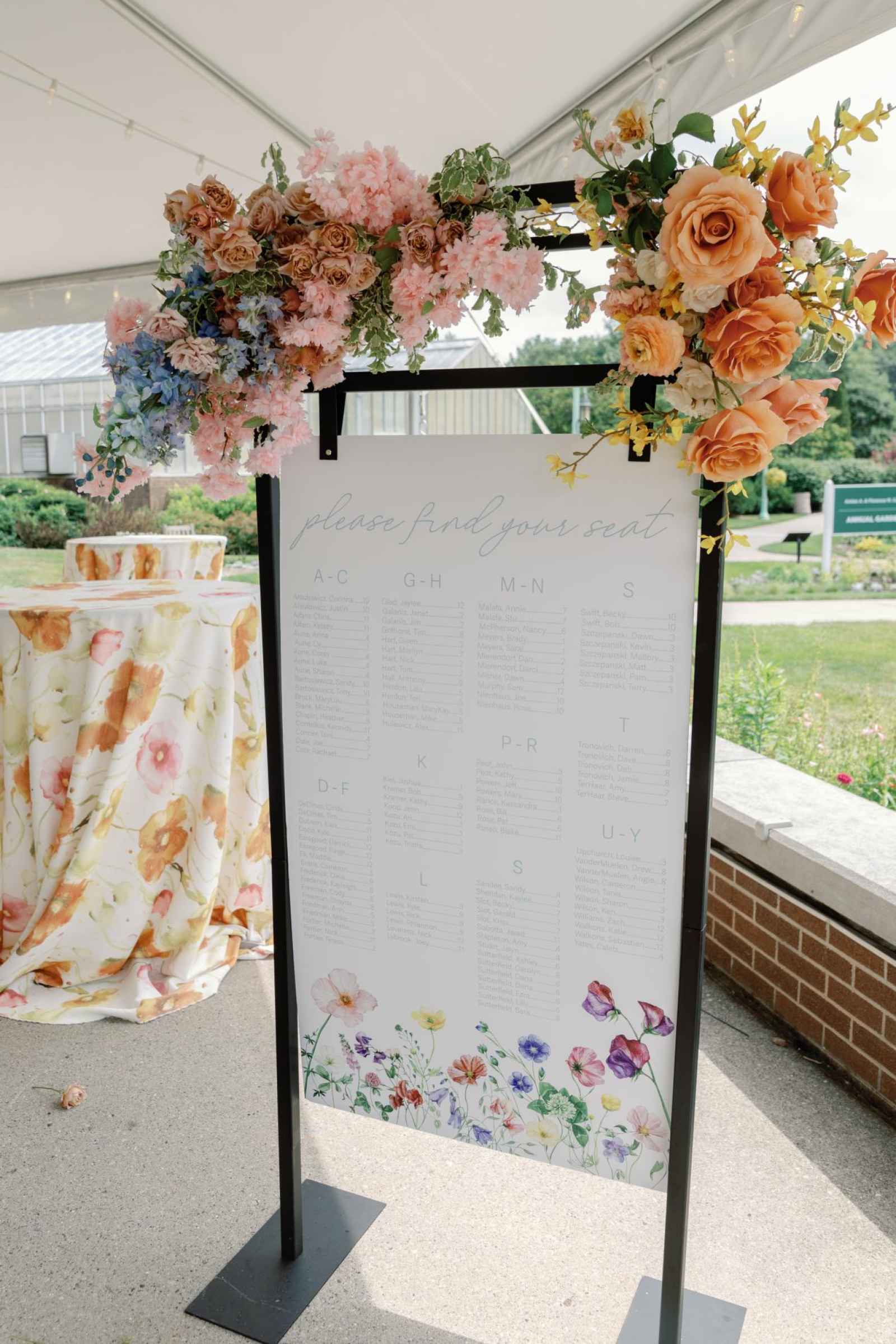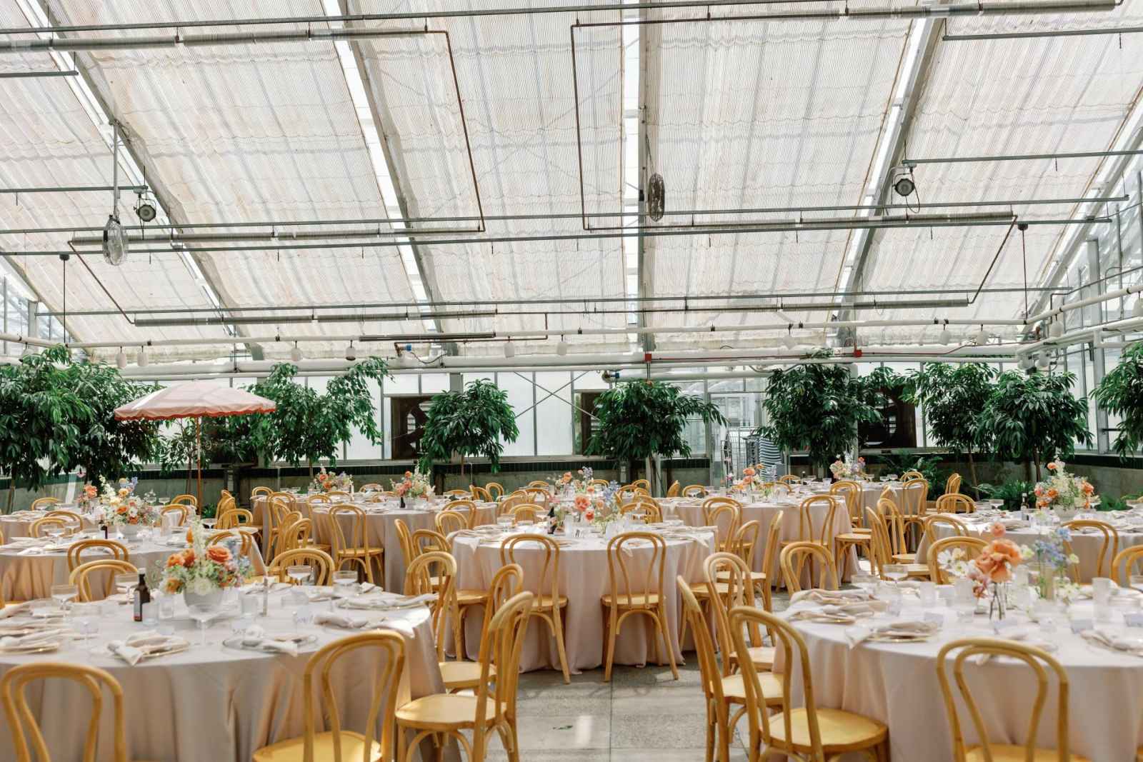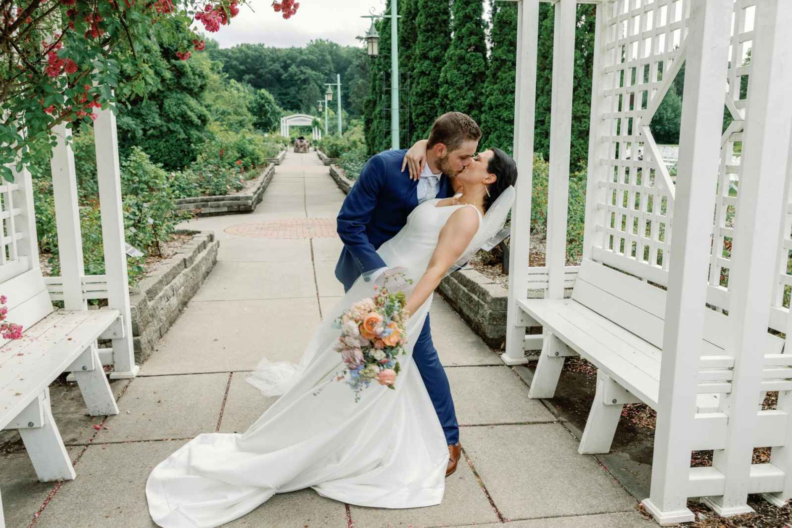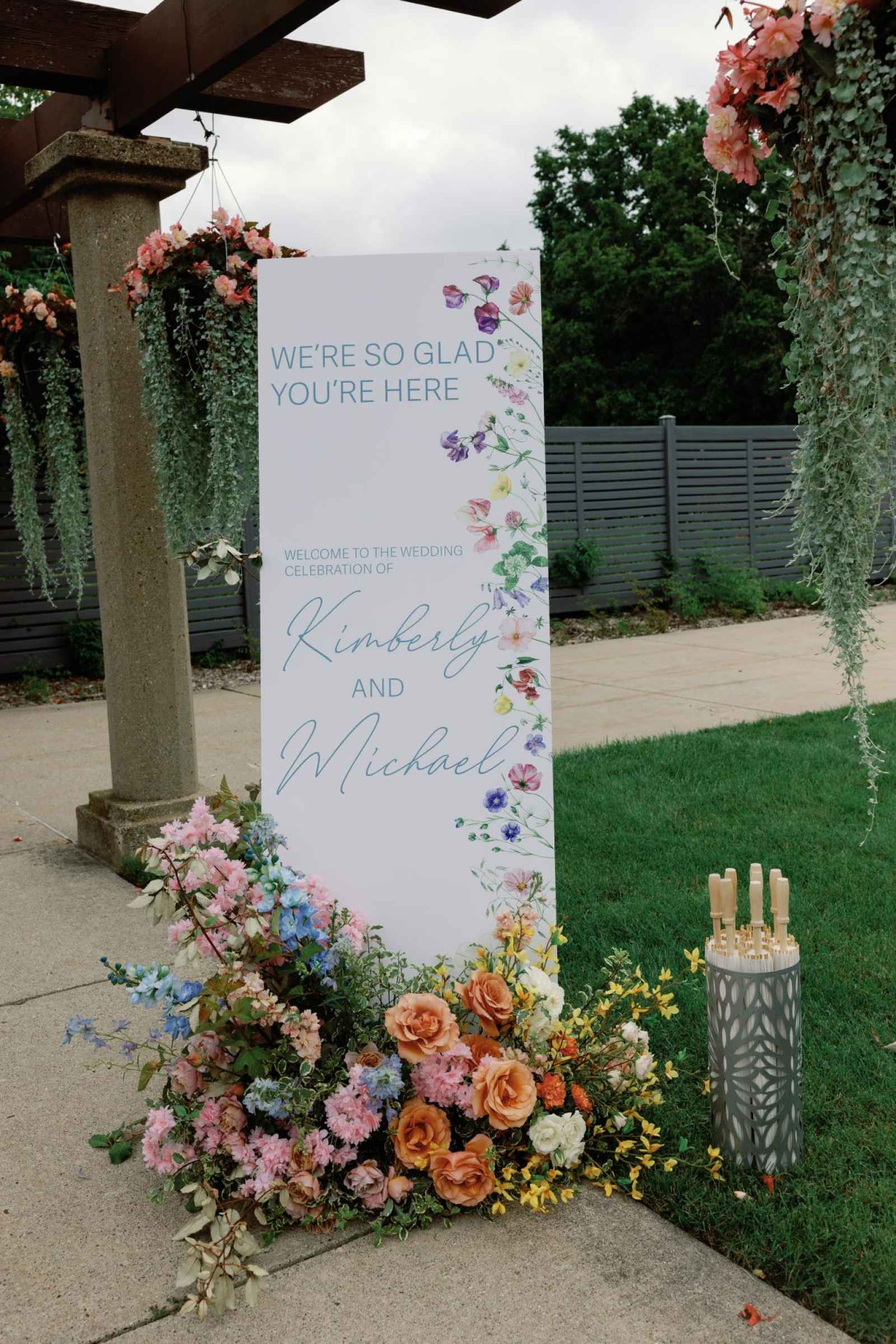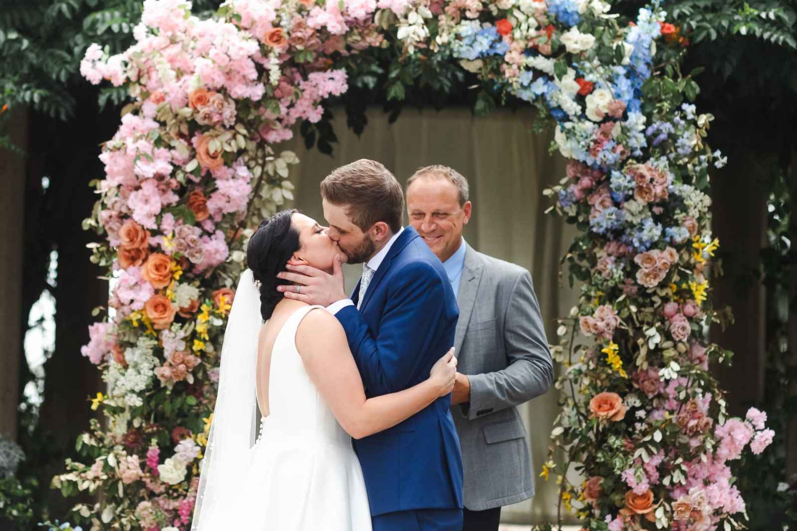 Kim and Michael’s wedding was a vibrant, romantic garden celebration brought to life by the venue’s natural charm, colorful blooms and the couple’s love of the outdoors. Drawn to the lush grounds, open spaces and the unique opportunity to host their reception in a greenhouse, they designed a day that felt whimsical, elegant and joyfully alive. One of the most unforgettable touches was their stunning floral arch (an early non-negotiable!) that All Grand Events + Floral transformed into a showstopping masterpiece. After framing their ceremony, it was moved behind their sweetheart table, becoming the breathtaking centerpiece of their reception and a detail Kim still adores every time she looks back at the photos.