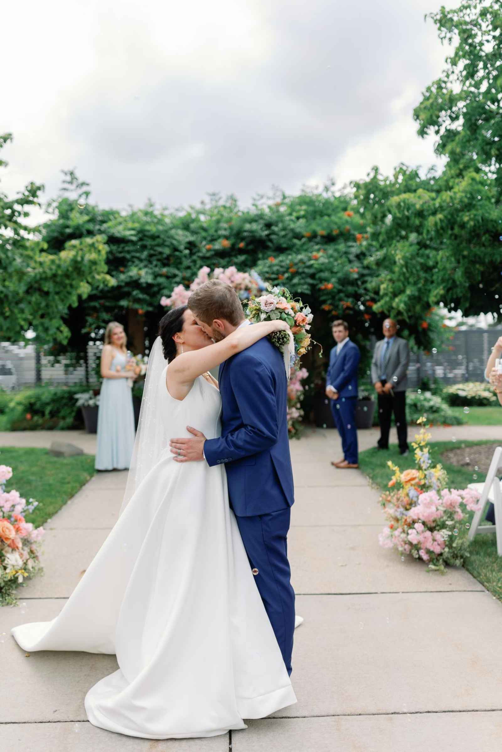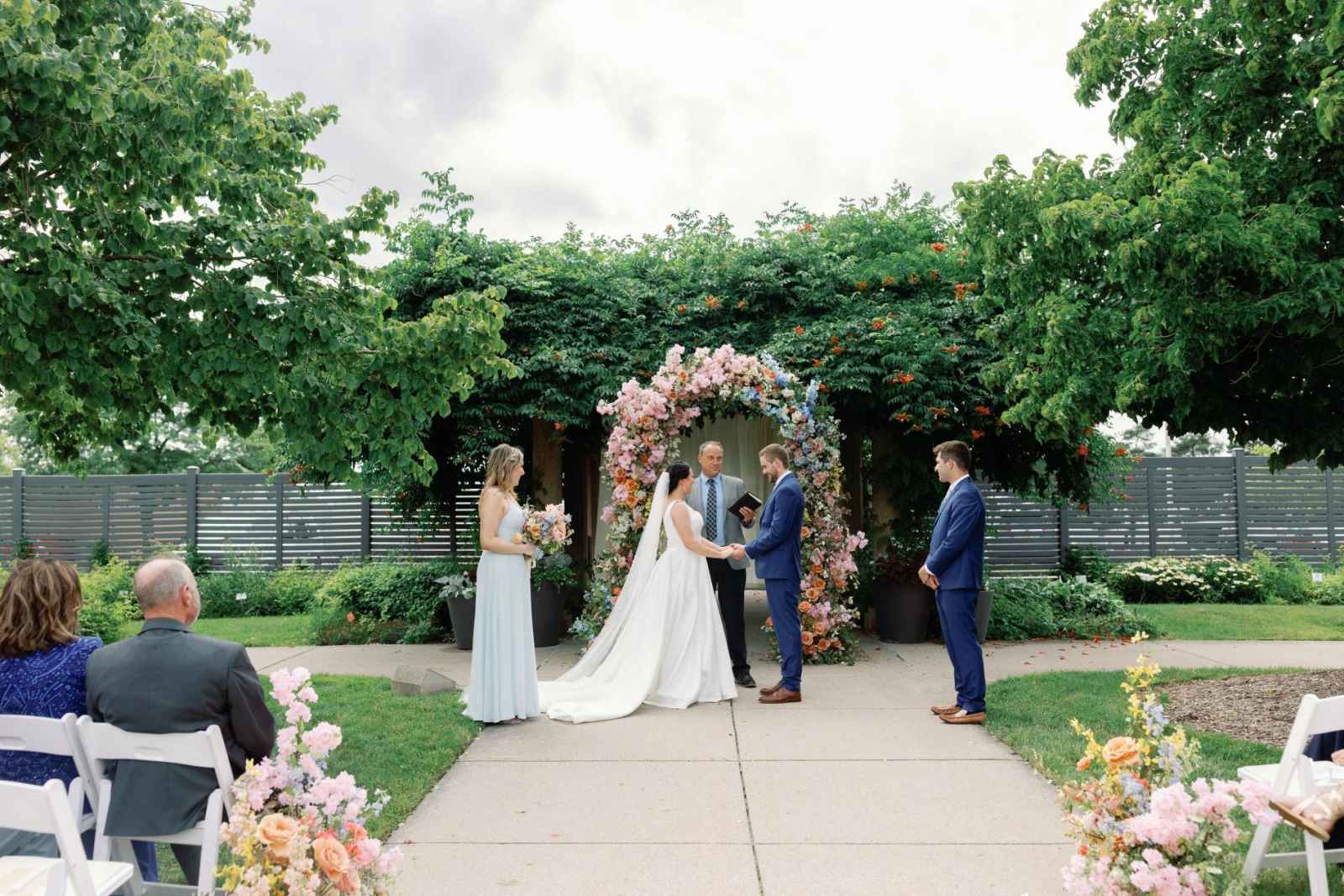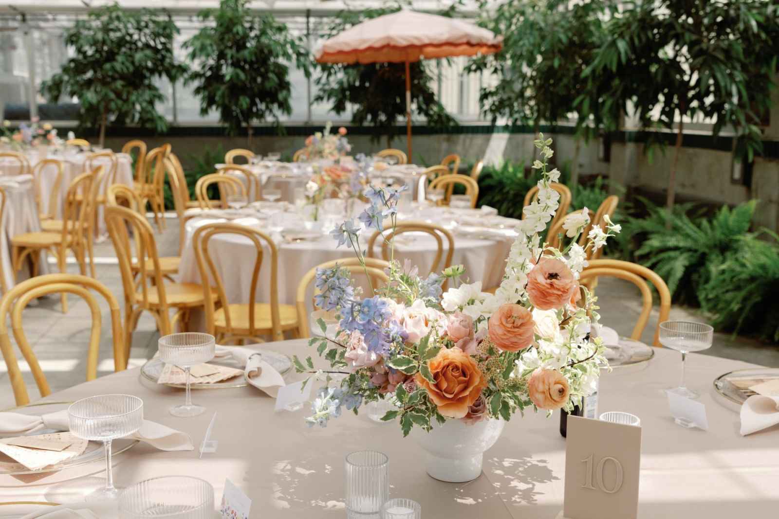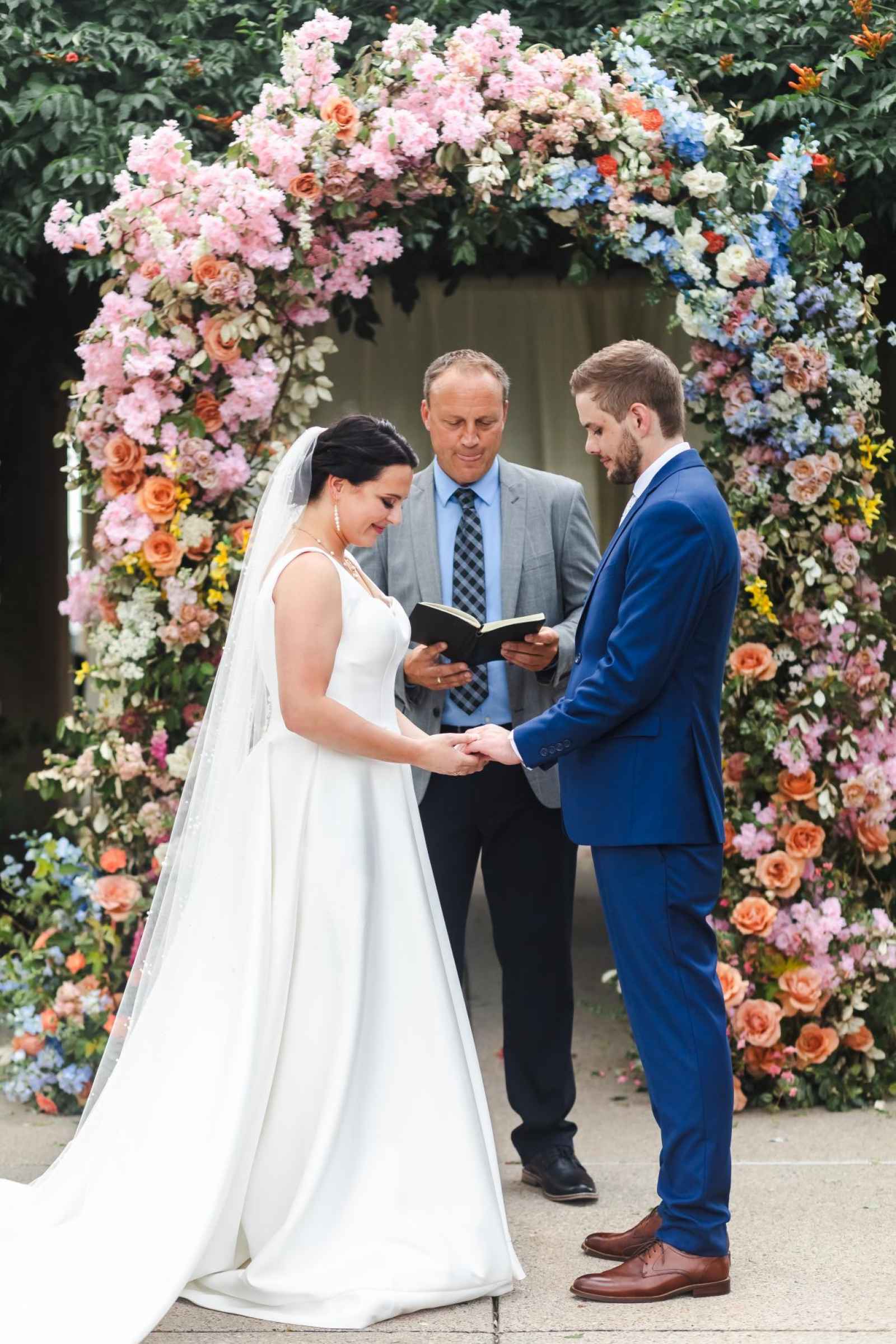 Kim and Michael’s wedding was a vibrant, romantic garden celebration brought to life by the venue’s natural charm, colorful blooms and the couple’s love of the outdoors. Drawn to the lush grounds, open spaces and the unique opportunity to host their reception in a greenhouse, they designed a day that felt whimsical, elegant and joyfully alive. One of the most unforgettable touches was their stunning floral arch (an early non-negotiable!) that All Grand Events + Floral transformed into a showstopping masterpiece. After framing their ceremony, it was moved behind their sweetheart table, becoming the breathtaking centerpiece of their reception and a detail Kim still adores every time she looks back at the photos.