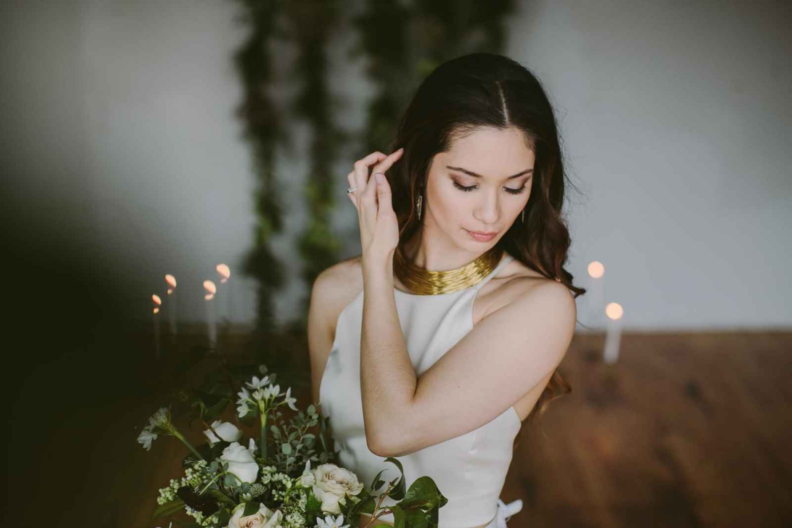 Sometimes, the finest complement to a simple look and gown is a standout set of earrings or necklace. We love how the necklace here makes a big statement, yet it doesn't take away from the bride's simple makeup, loosely waved hair and equally simple dress. We actually think this pairing is quite perfect for a natural, modern bride.