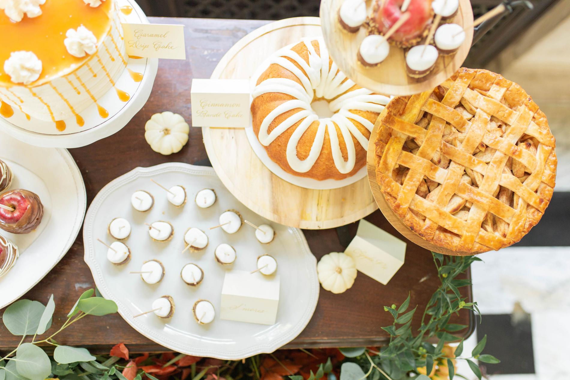 This spread of pie, bundt cake, caramel apples and chocolate covered marshmallows will satisfy any autumn craving!