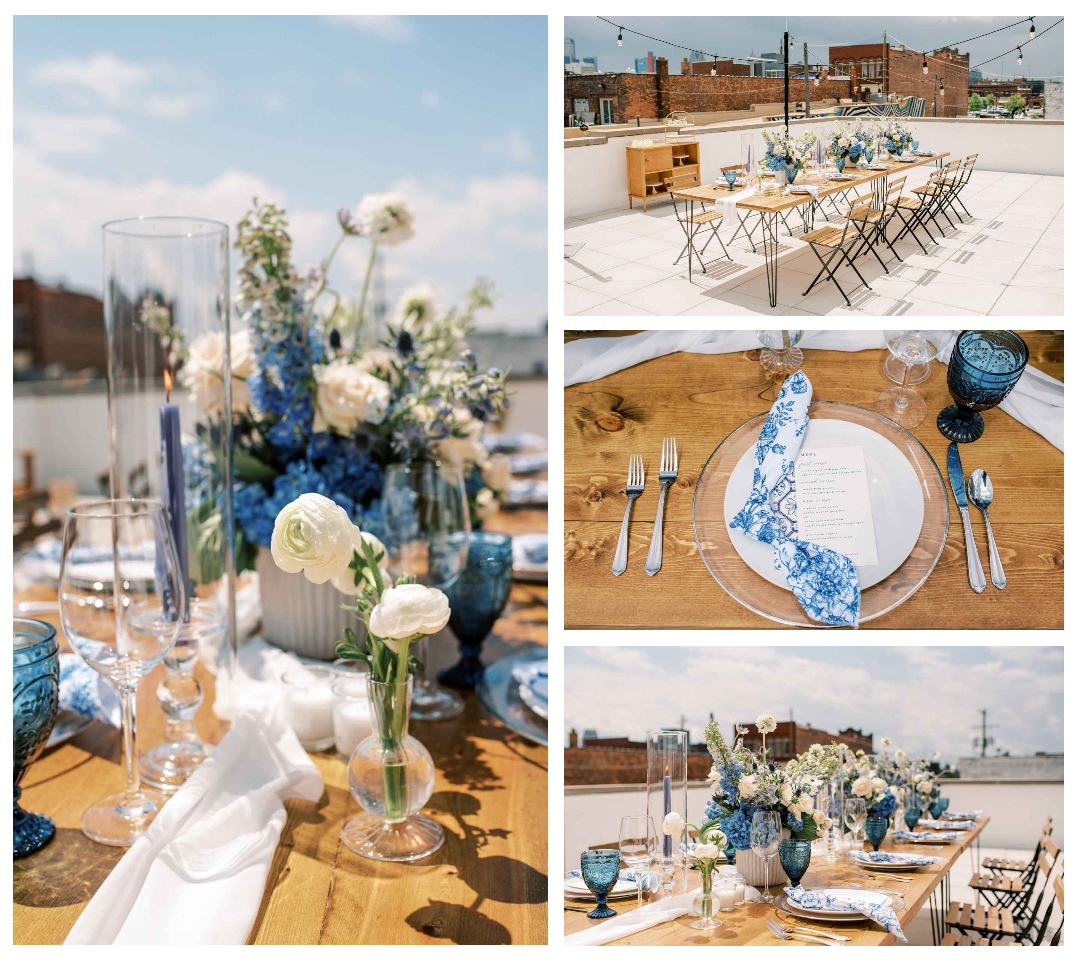 This classic rooftop scene is perfect for couples who like the simpler things in life. Most of the details are white with a subtle pop of powder blue, which mirrors the outdoor ambience of the sky. One of our favorite details is the blue print used on the napkins and menus instead of the plate!
