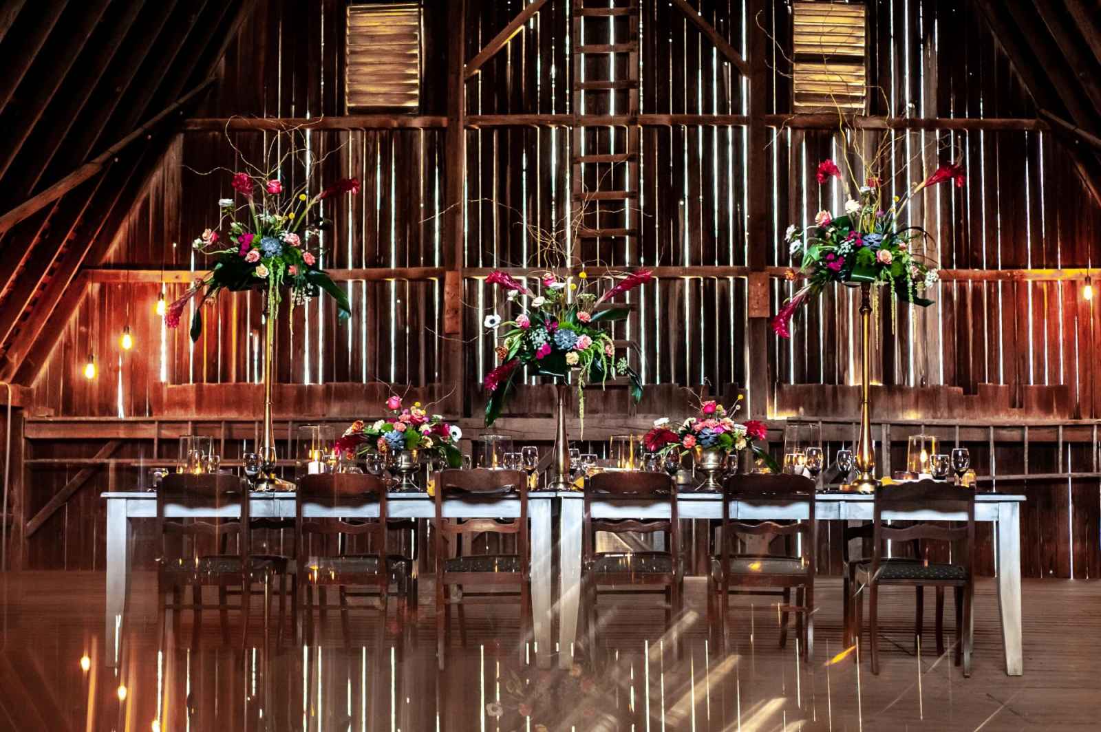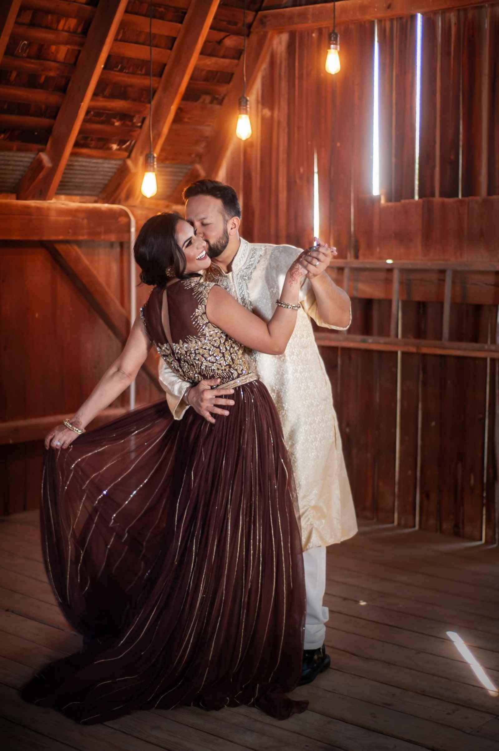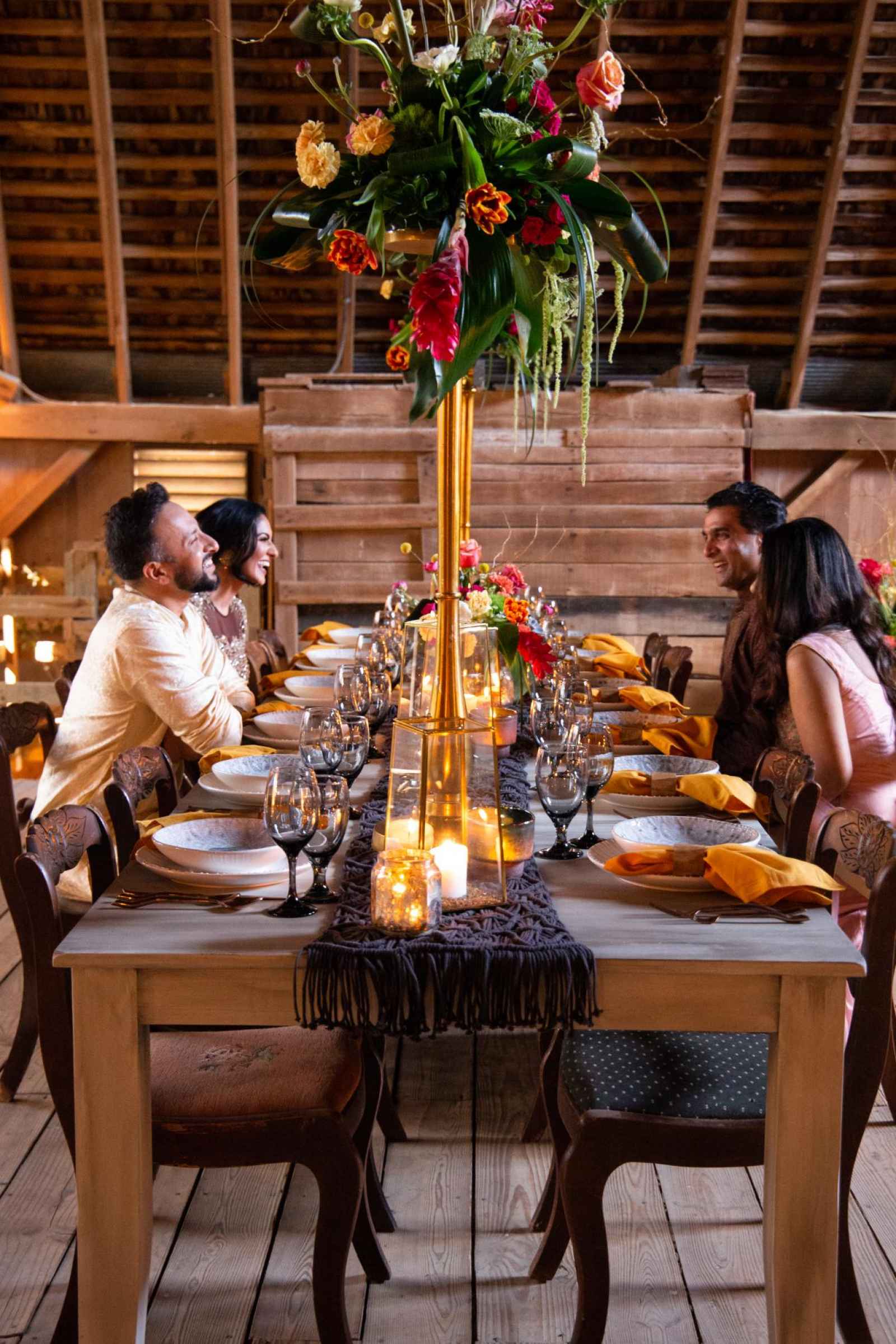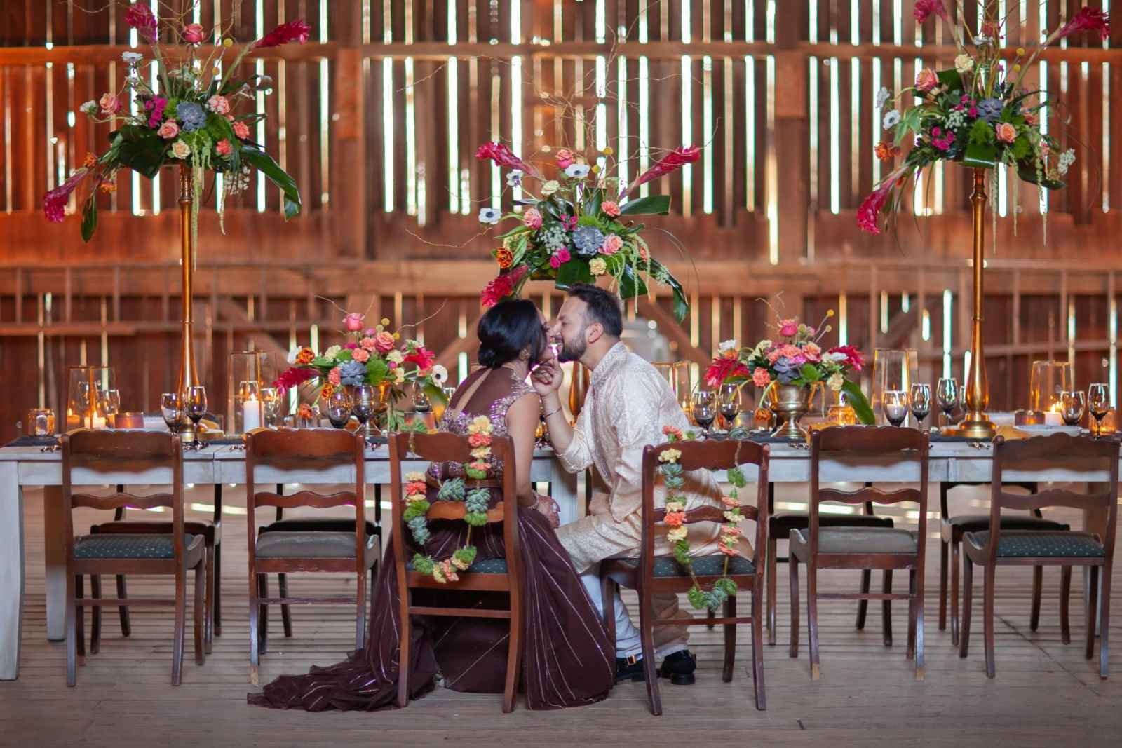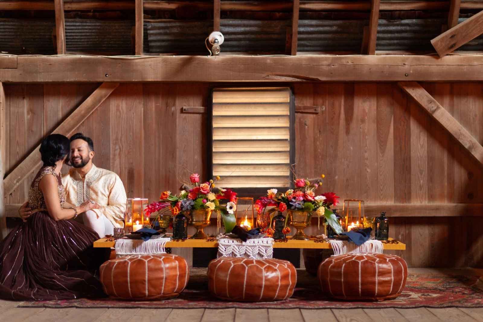 This shoot took on the theme of “the elements” by incorporating nature, so the team created Varmalas (a traditional Hindu garland) out of succulents and moss. Jean added, “We choose a venue space that had a barn for the reception and lots of natural space for the ceremony. We loved the amount of forest-like areas and that the barn had a beautiful ceiling!”