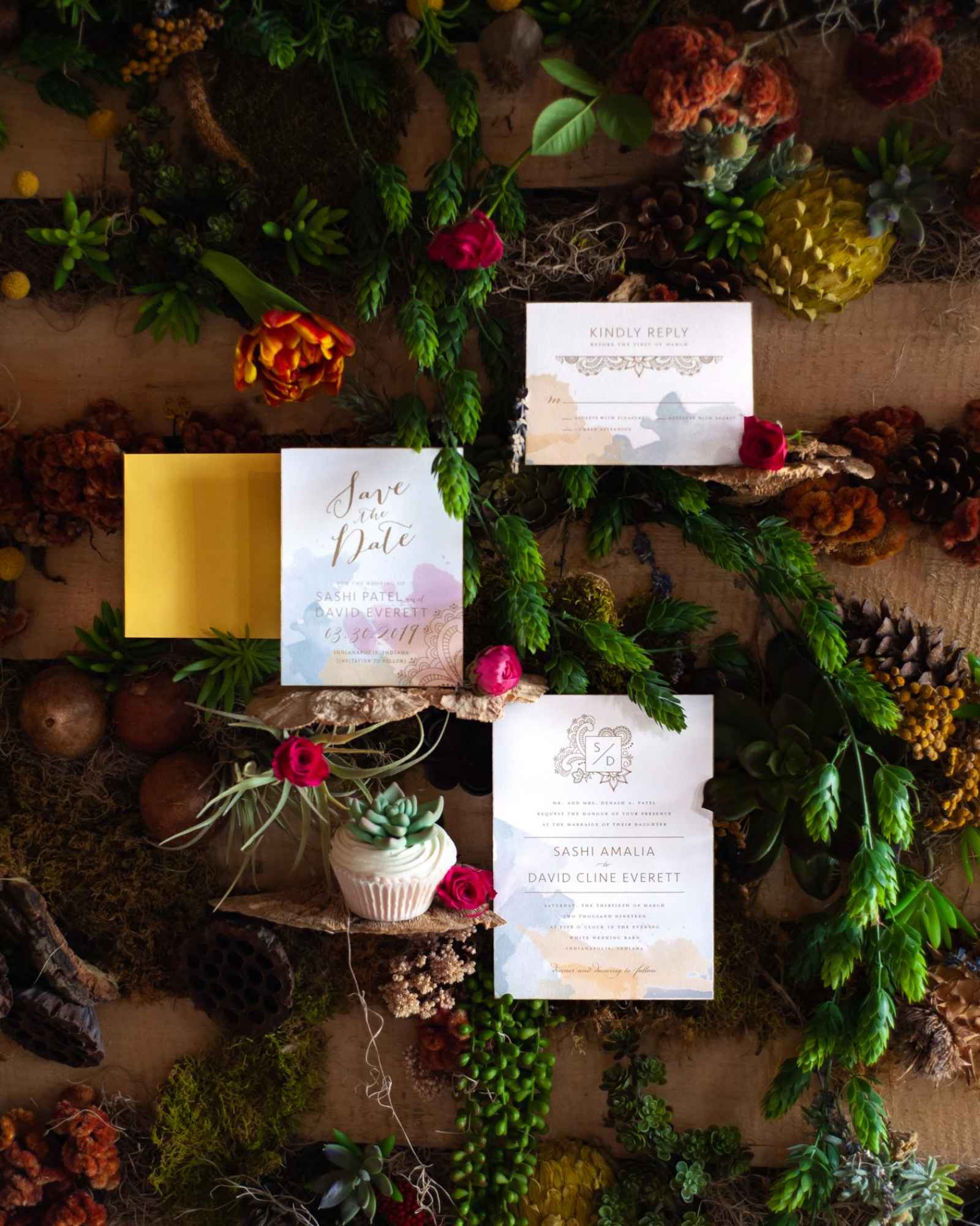 This shoot was full of unique touches from the team! They included a 3D printed Mandap, a mustard-colored dining table, and a living wall behind the cake. We can’t wait to see what this creative team does next!
