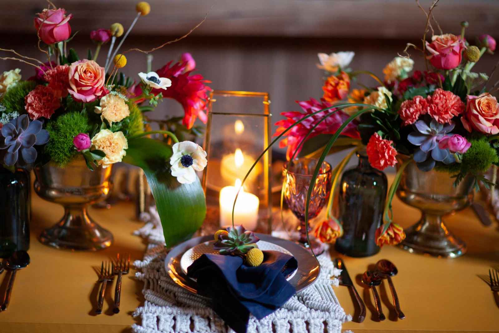 The team took on the challenge of using the colors of traditional Hindu weddings while contrasting with a neutral nature-inspired backdrop. We love the bold flower choices made in this shoot! Jean adds, “We chose tall bronze-colored candelabras to showcase the tall arrangements and low oval gold compotes for the low complimentary floral pieces.”