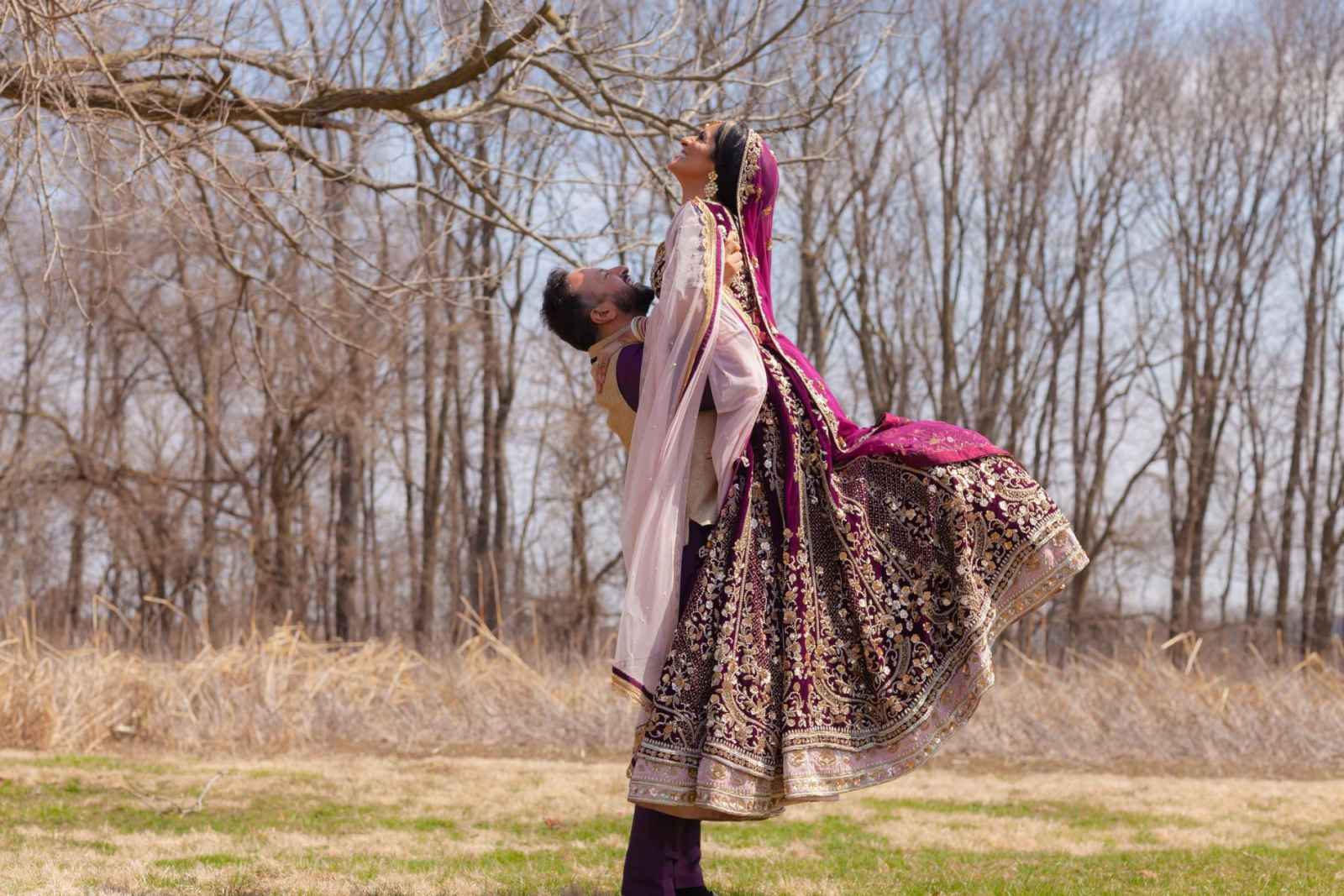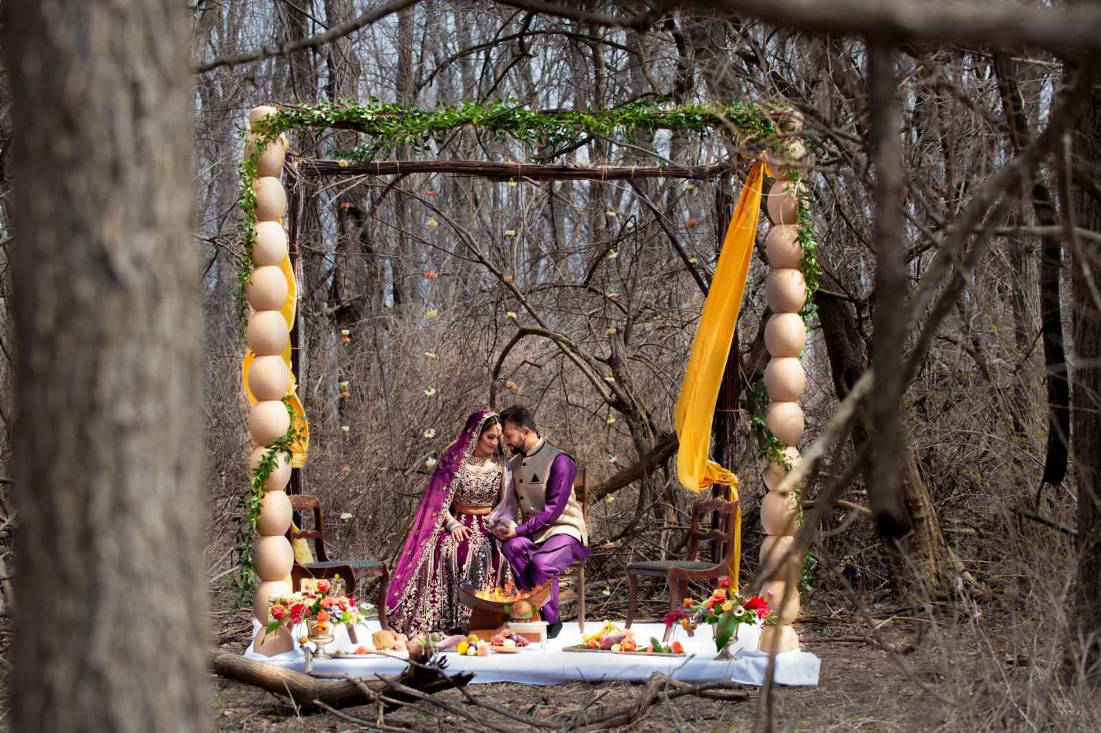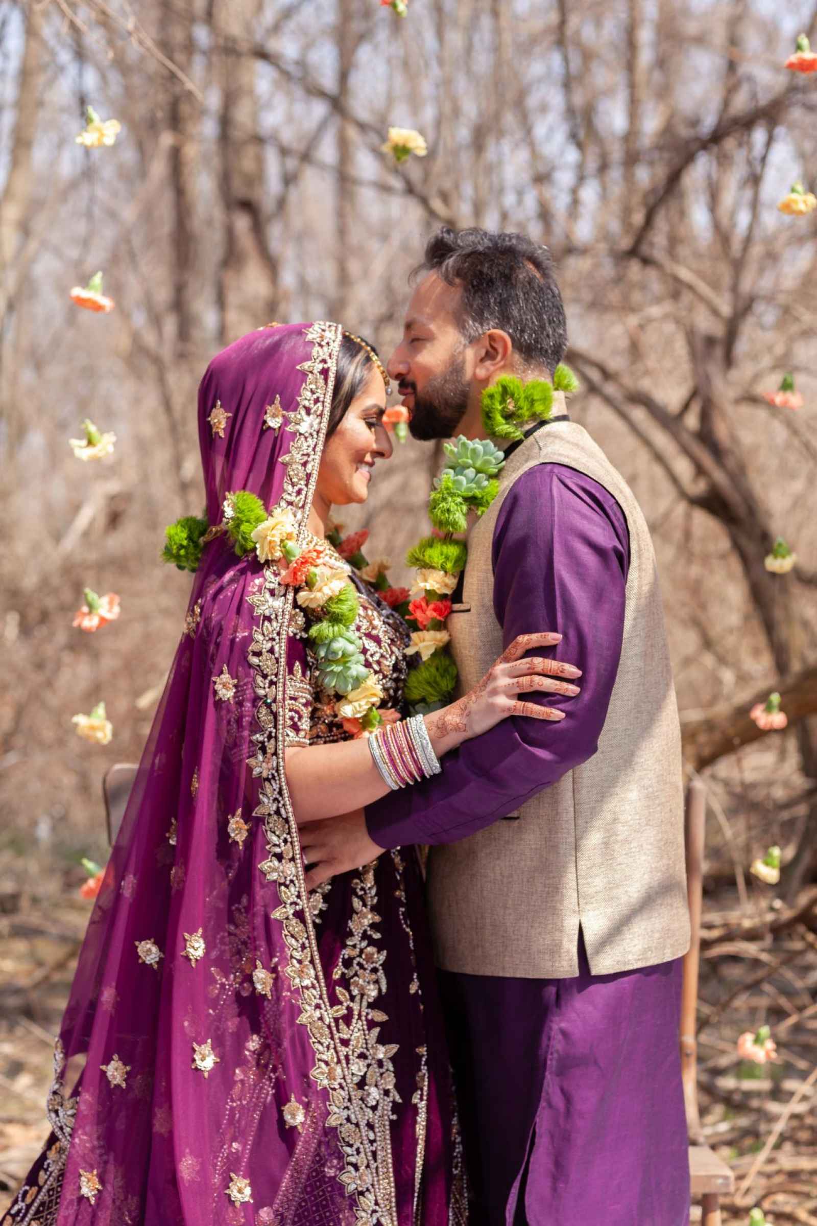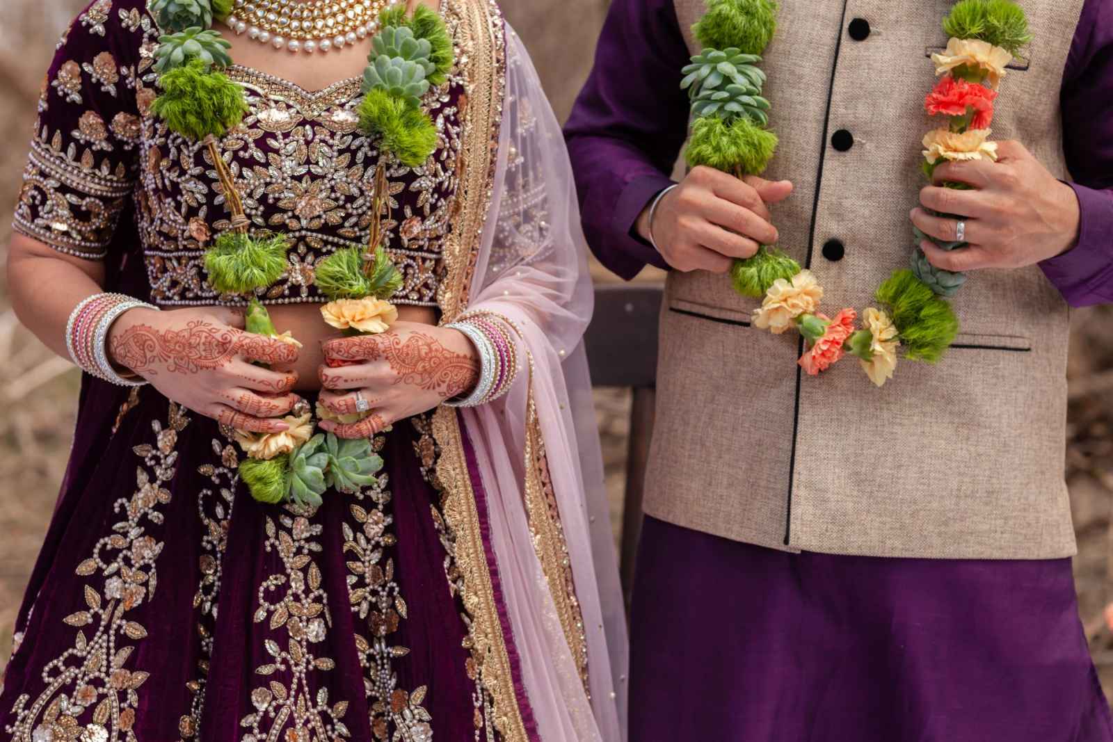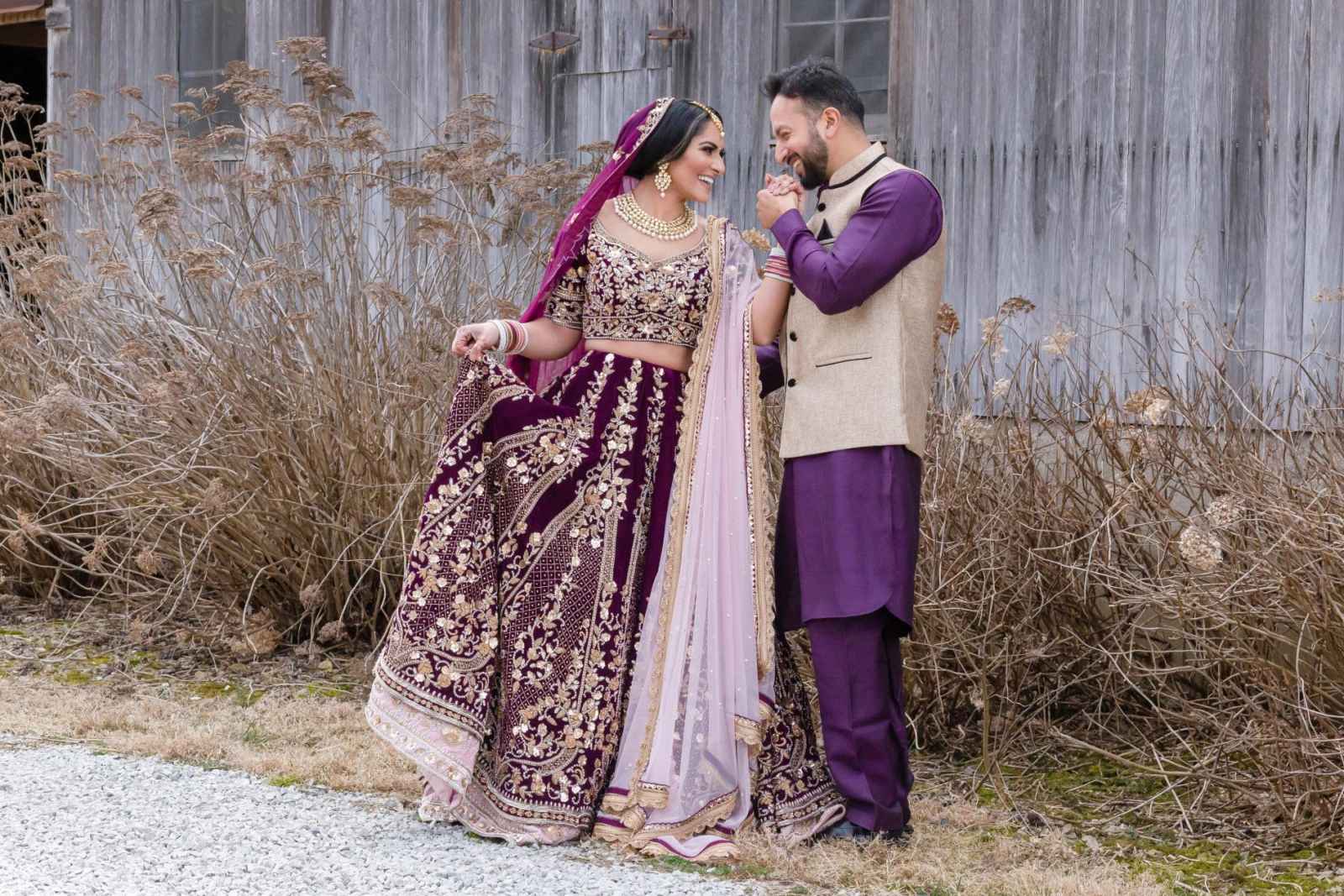 The vibrant purple used in this shoot offsets well with coral, the Pantone Color of the Year. The team wanted a dark rustic feel for the bride’s gown, so they chose a brown dress with golden embroidery. For the reception, they chose a dreamy wine lengha choli outfit layered with contrasting dupatta and a chocolate golden gown with an overskirt that leaves the bride looking absolutely stunning!