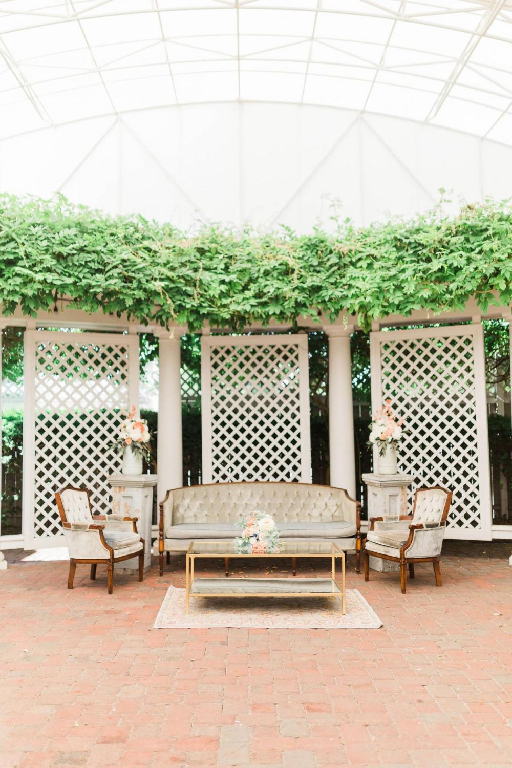 The venue was a large draw of inspiration for this shoot. Emma explains that each room had a partition and paintings that brought out a natural European atmosphere the team could easily expand on. The elegant white pavilion of this outdoor ceremony and the rented wooden pillars perfectly placed this atmospheric ceremony in the backyard of an old-world manor. “I loved that it felt like this lounge area could have been in a French countryside estate that was pulled out into the yard for a romantic wedding at a family home,” Emma says. “While the venue is a wonderful statement on its own, it is such a lovely location to create something that feels very personal as well.”