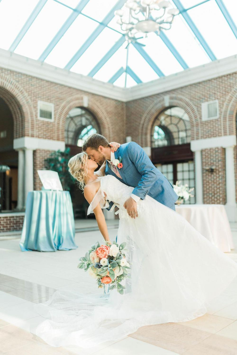 We’re in love with that dress’s elegant sleeves. It’s no surprise this flirty and sultry two-layer gown ties into the French theme so well. As an added bonus, the slight undertone of blush complements the Living Coral aspect of this shoot. “Our bride was glowing in the gown!” Emma gushes. “It was the perfect mix of sultry and fun with a little French flair!”