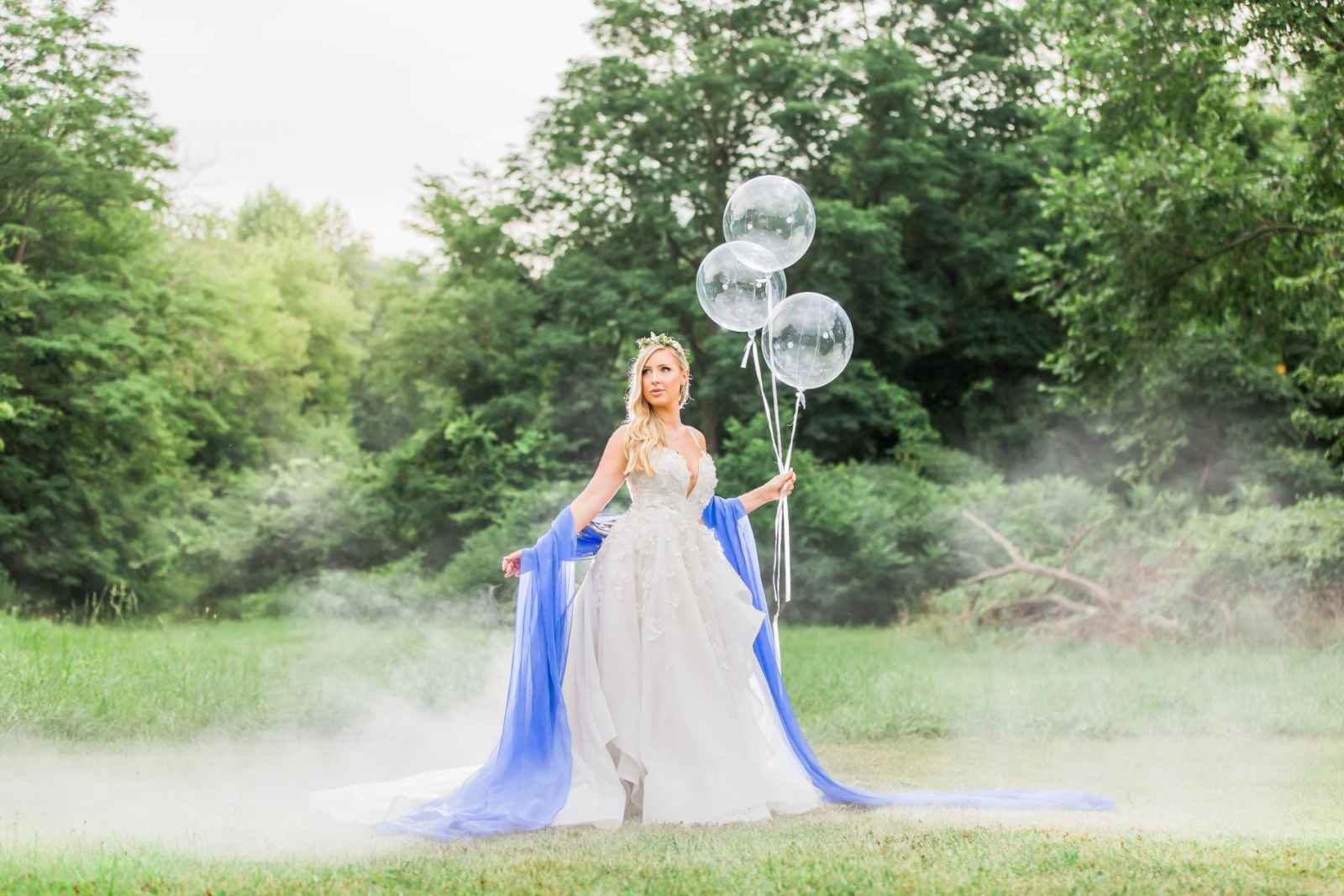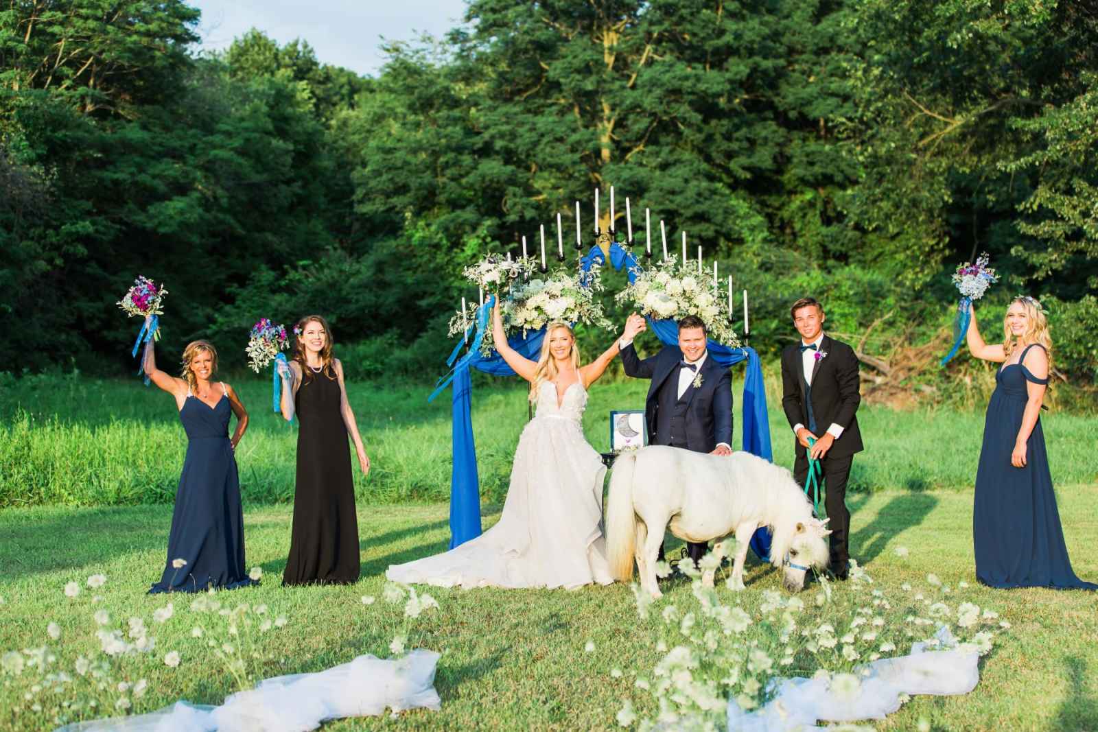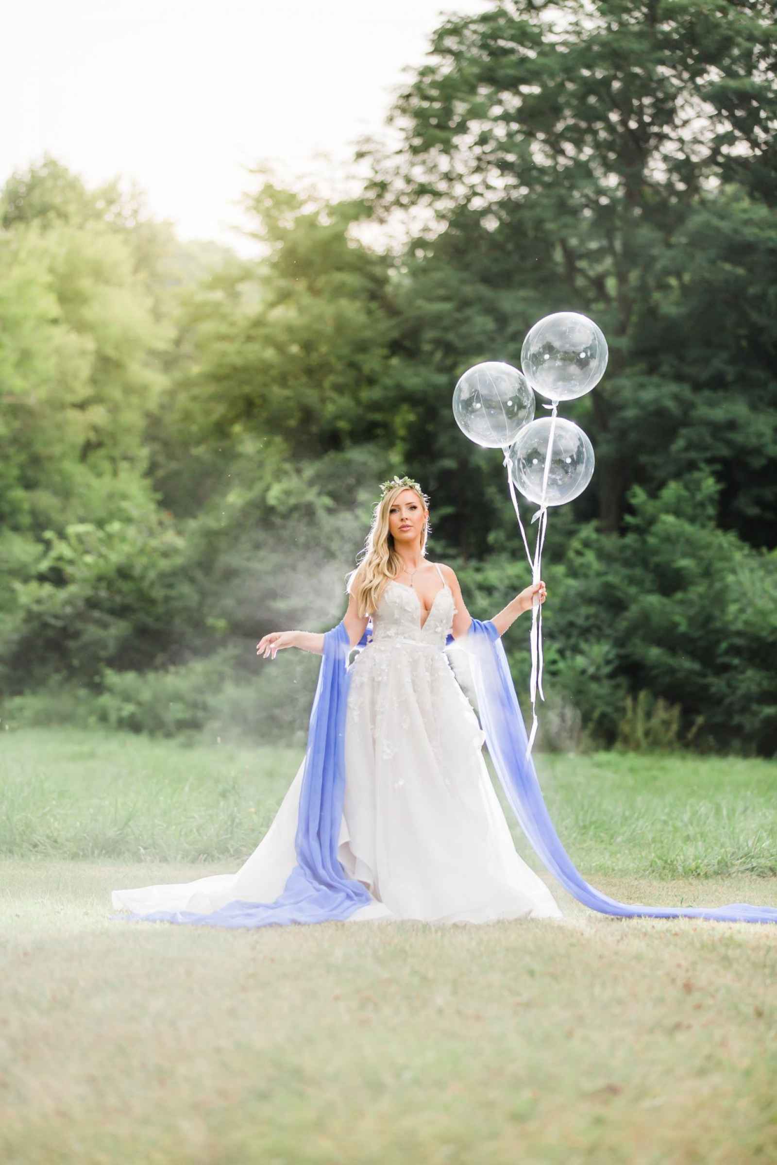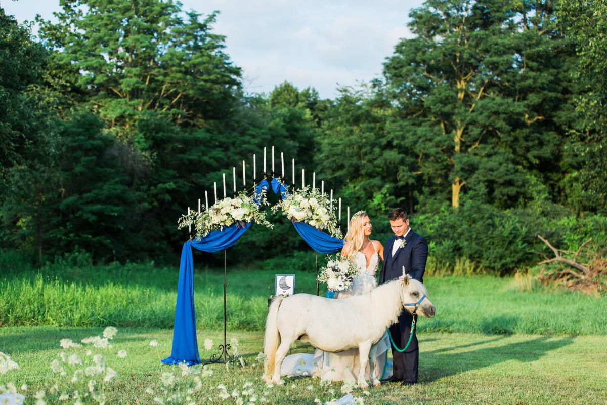 The team hosted this shoot in an outdoor field to inspire brides who want to share their nuptials under the stars. This gave room for lots of extra details! From the blue smoke bombs, towering candles and the constellation balloons, this team wasted no time packing creativity into this shoot’s atmosphere. And, of course, we love the unicorn!