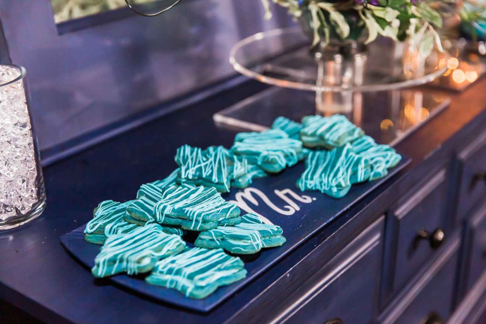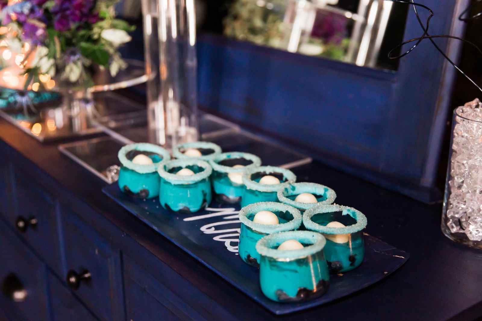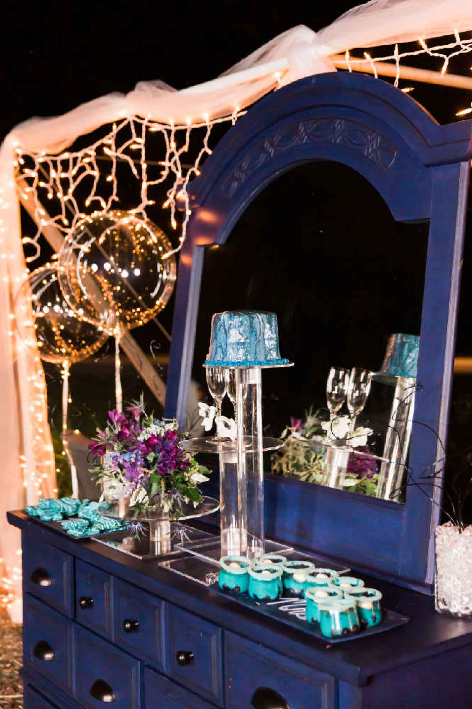Cotton candy trees, blue trifle, gourmet, star-shaped sugar cookies, and a mirror galaxy cake decorate these dessert trays. Talk about a sweet tooth!