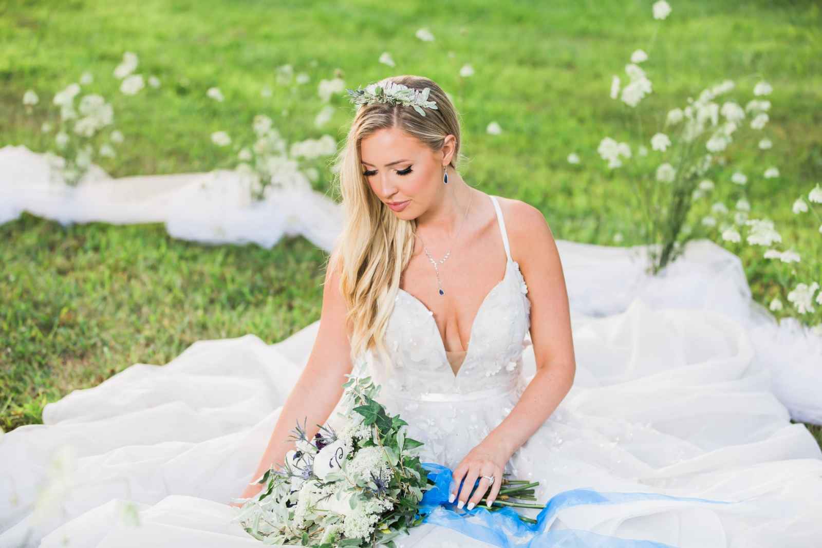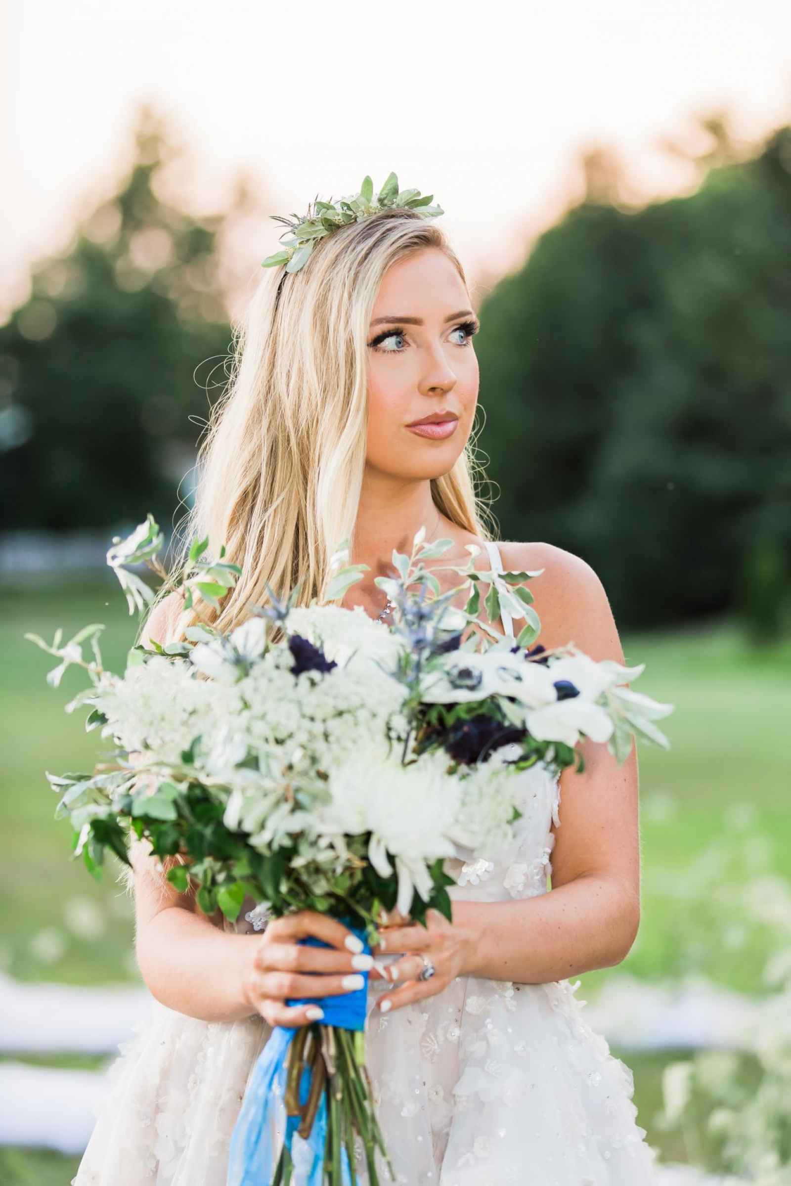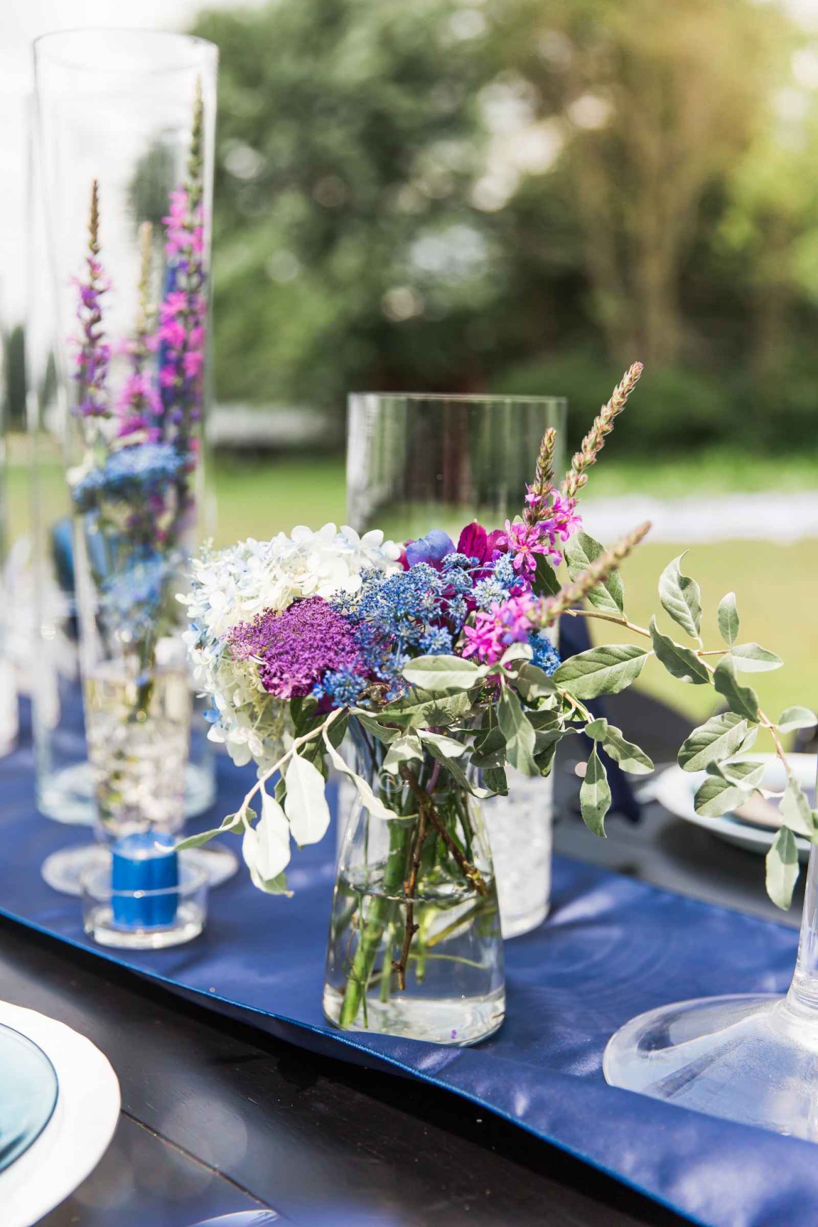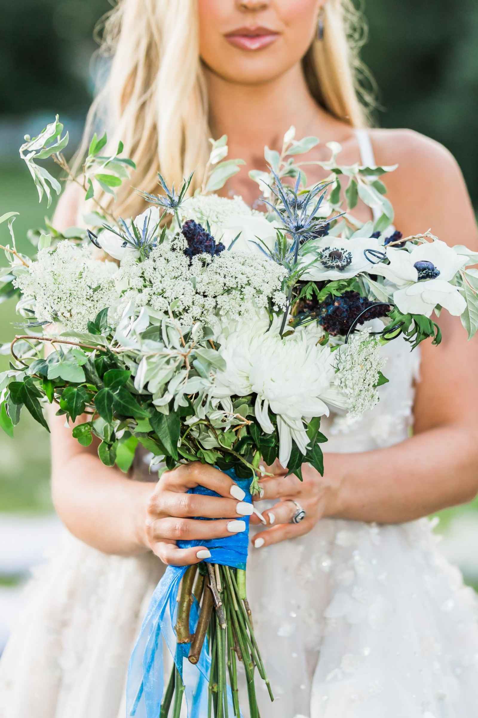 Nothing says elegance like Queen Ann’s Lace. This flower, used in shades of white and blue, was used to give the bride’s bouquet a fresh, natural look. Pops of hydrangeas and blue thistles round out this shoot’s flourishing florals.